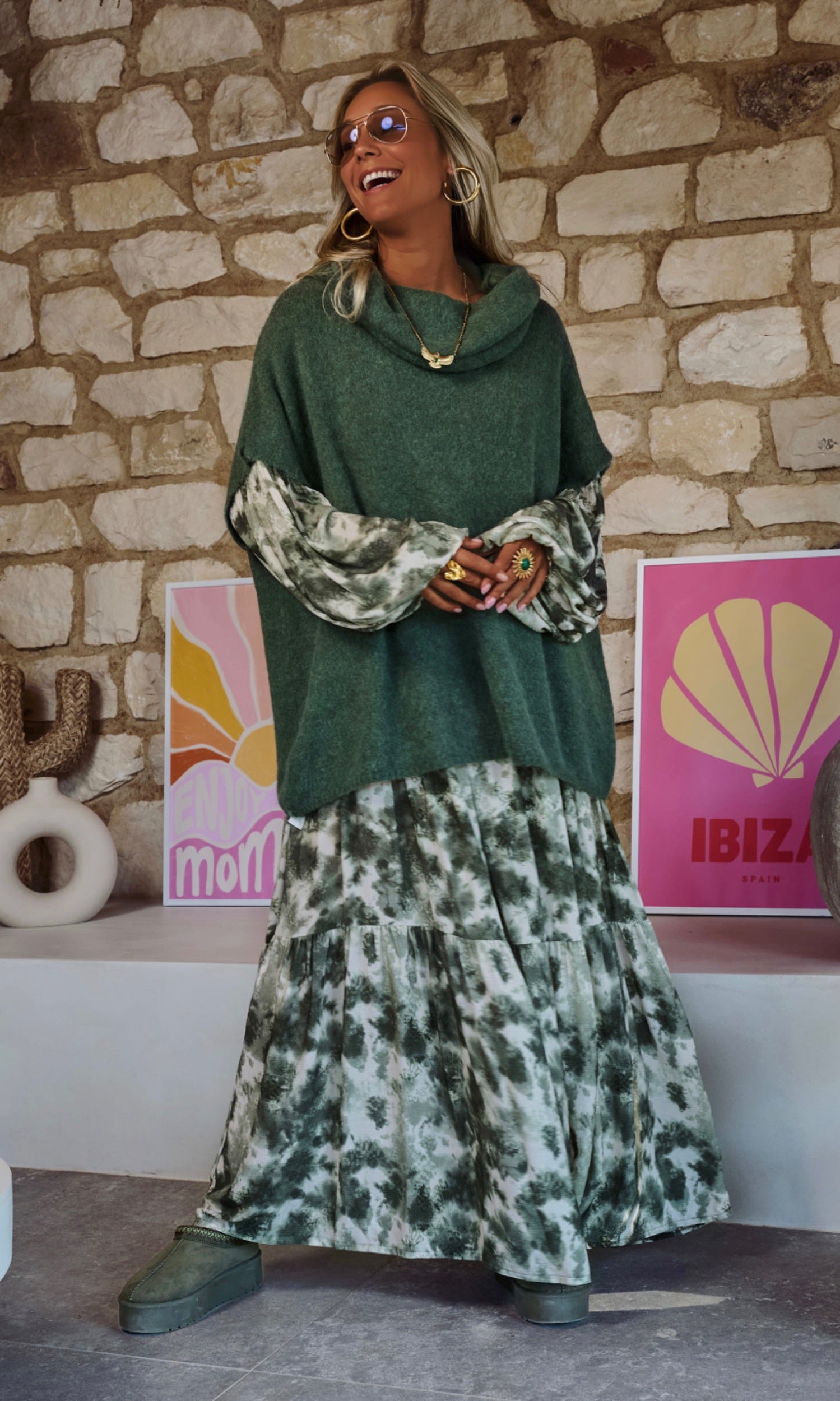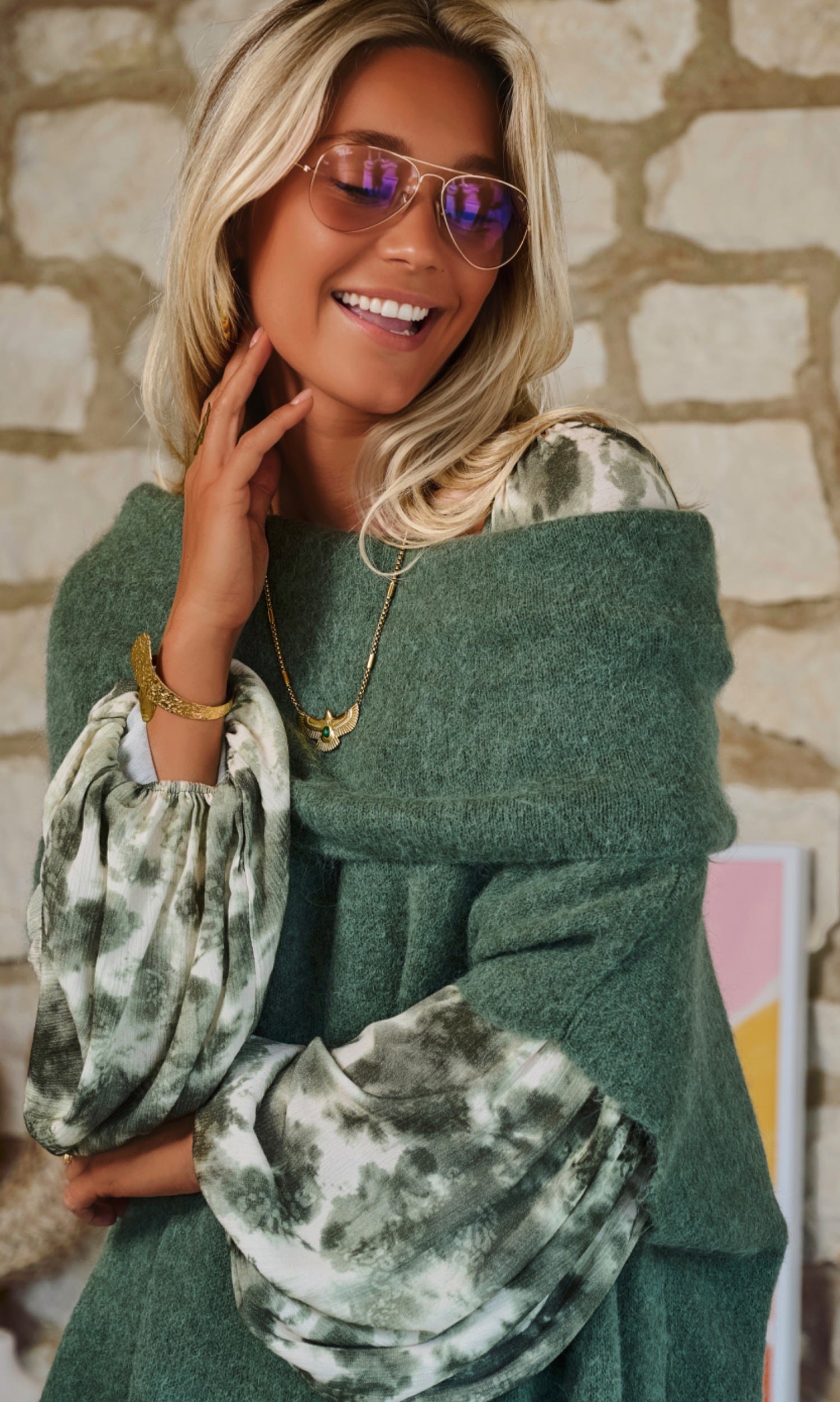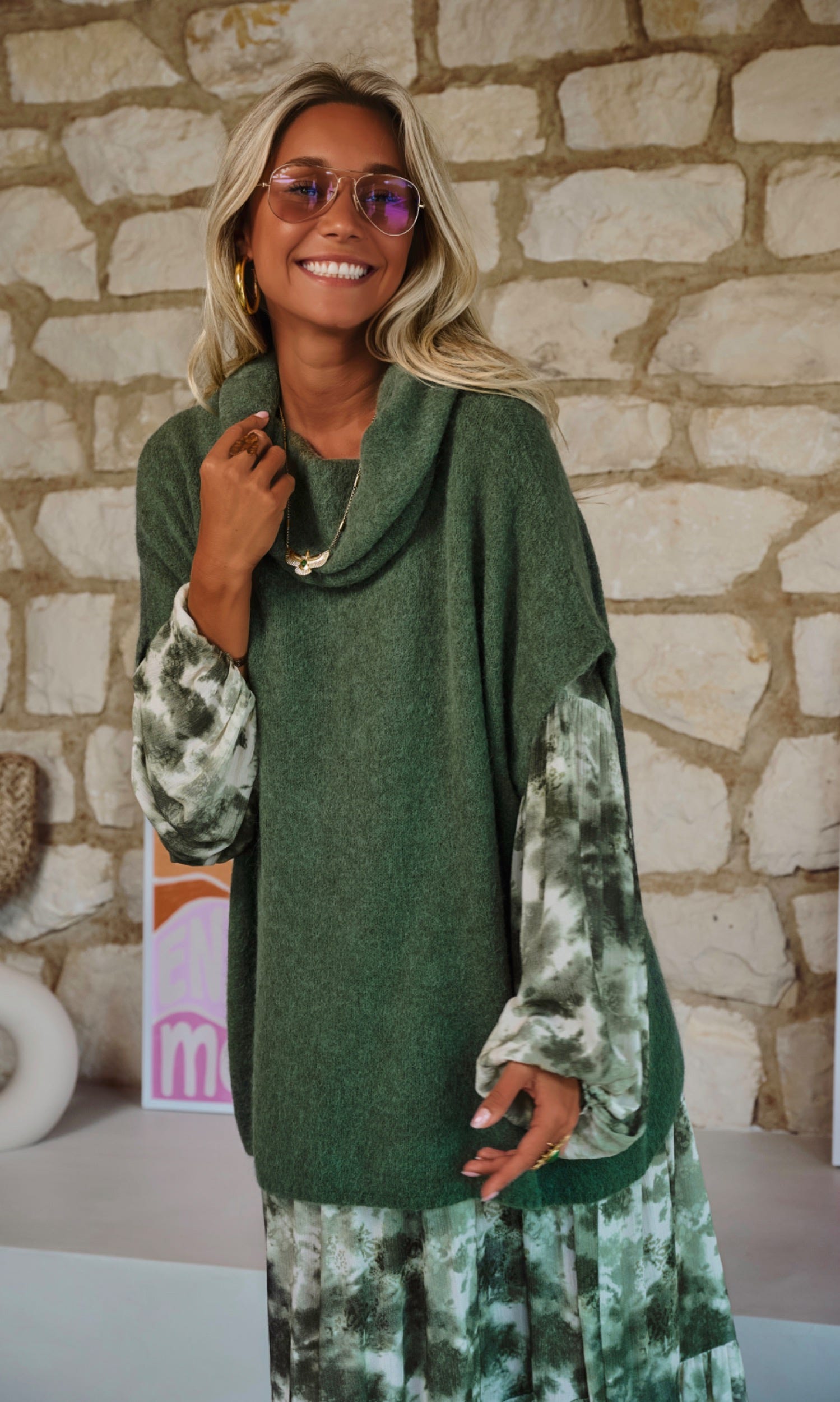 Découvrez ce pull kaki oversize ultra extensible, confectionné en maille fluffy toute douce