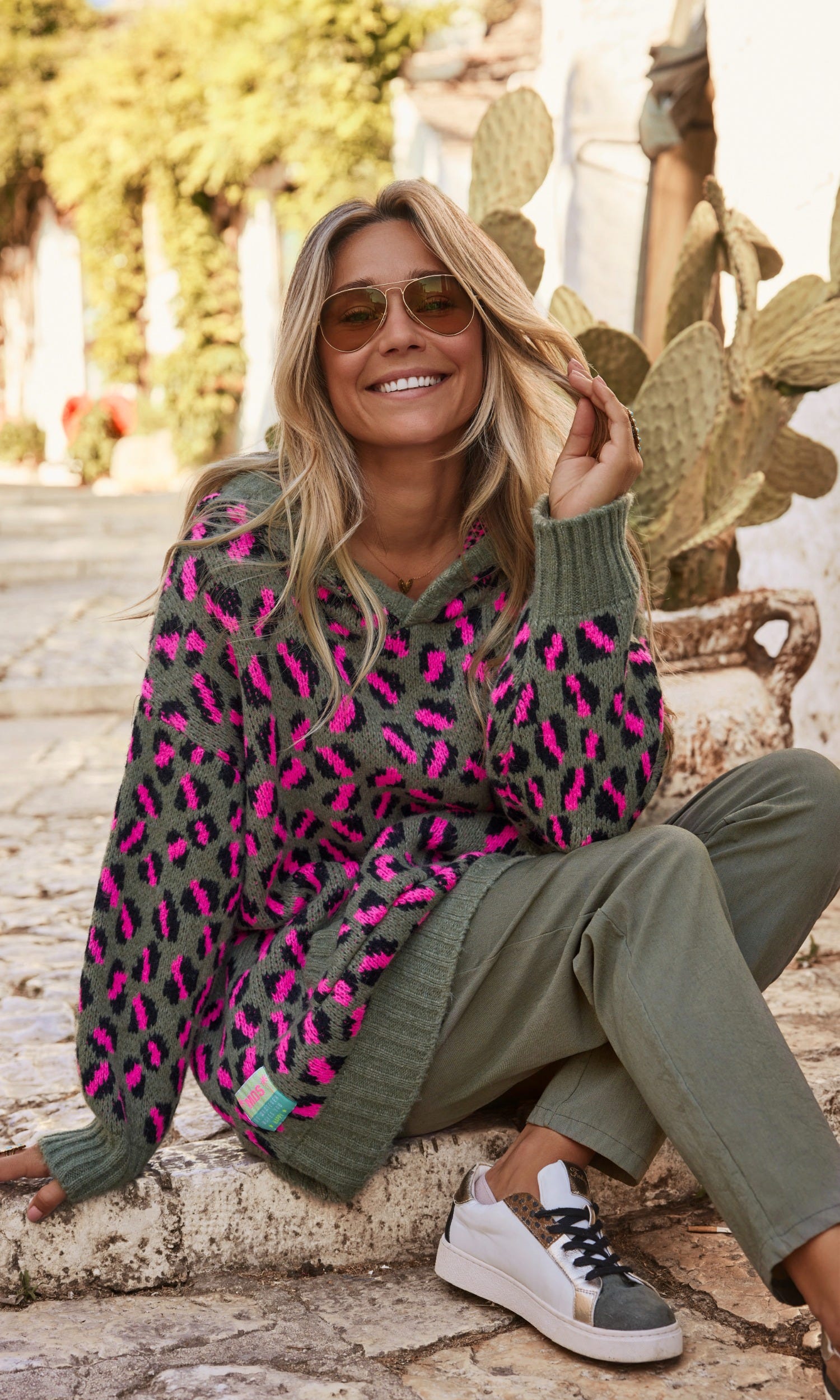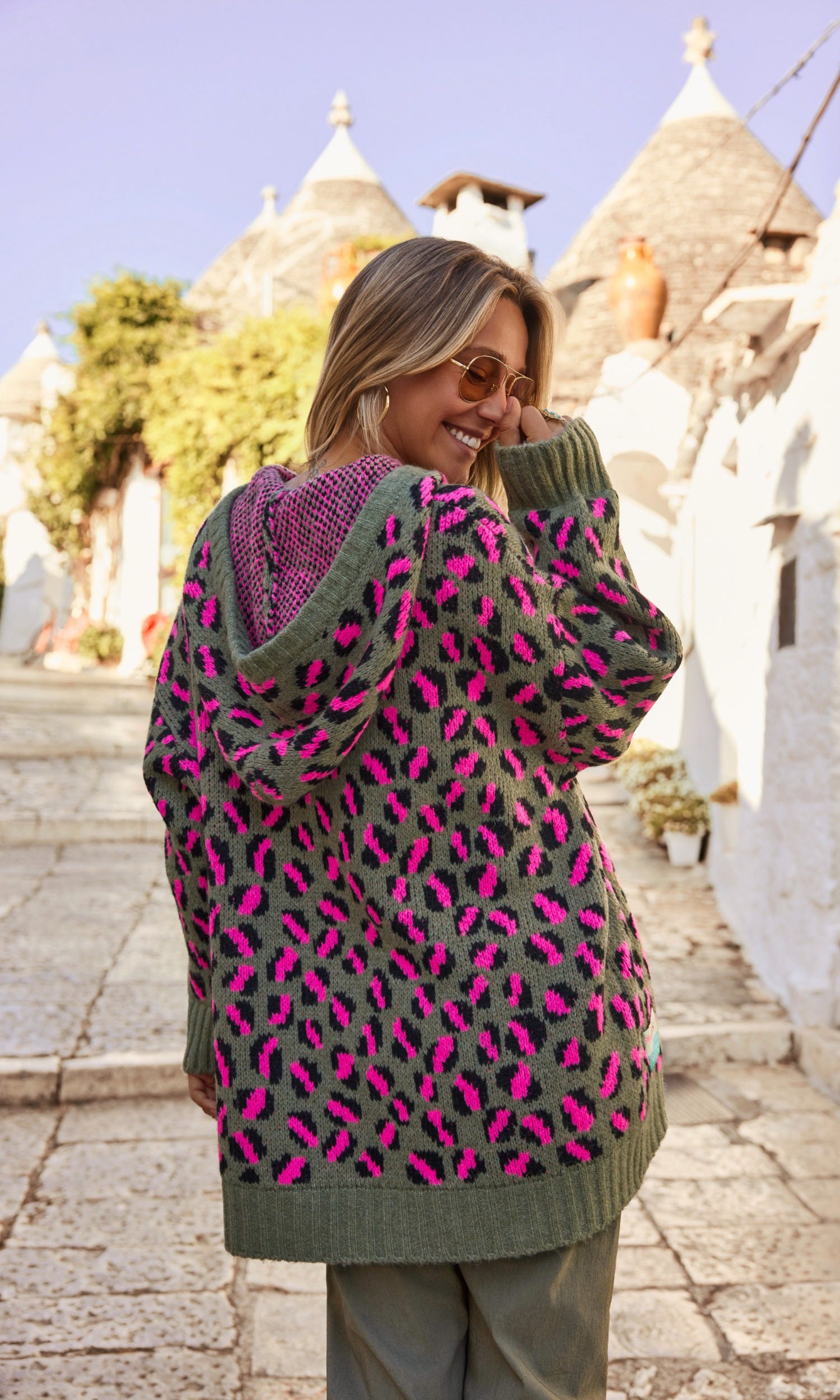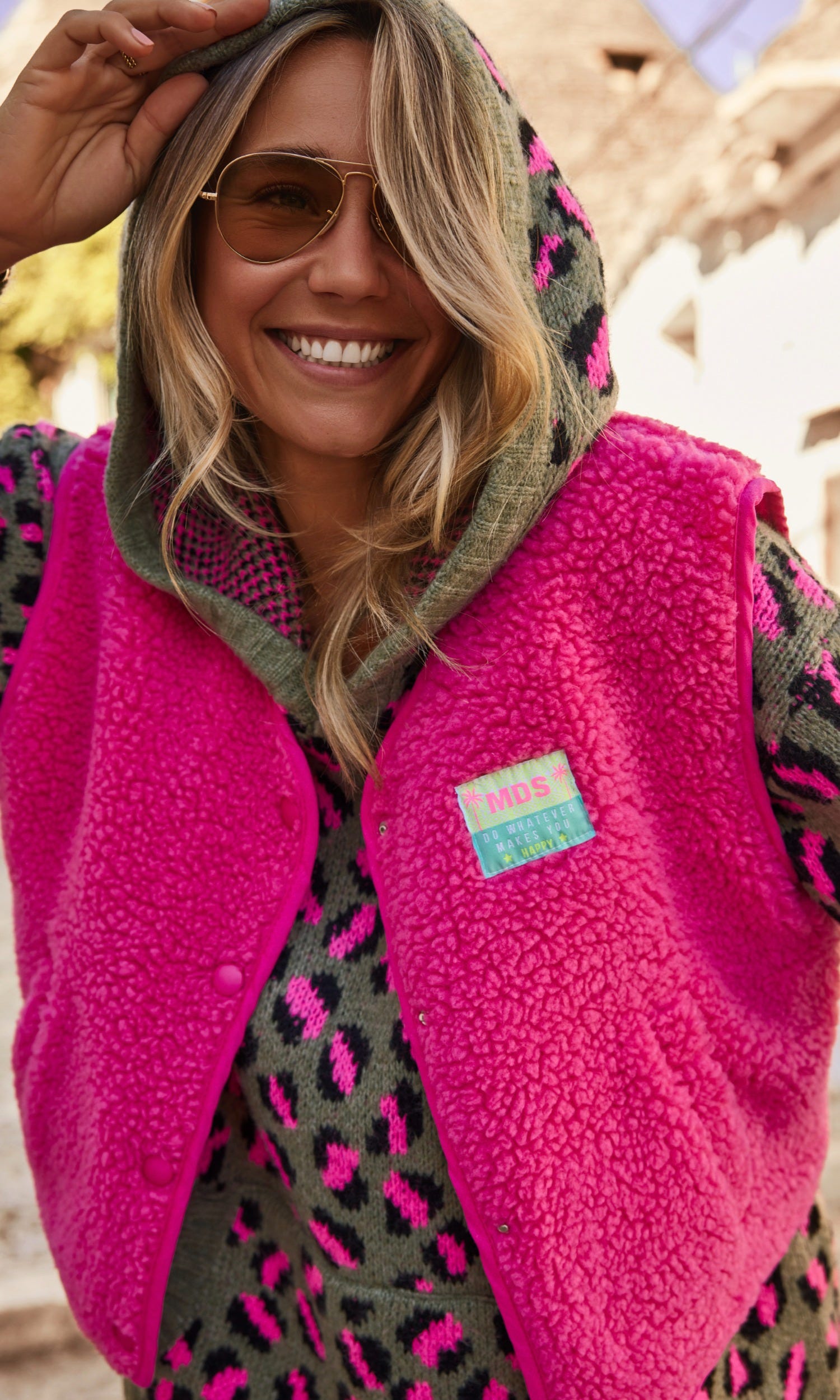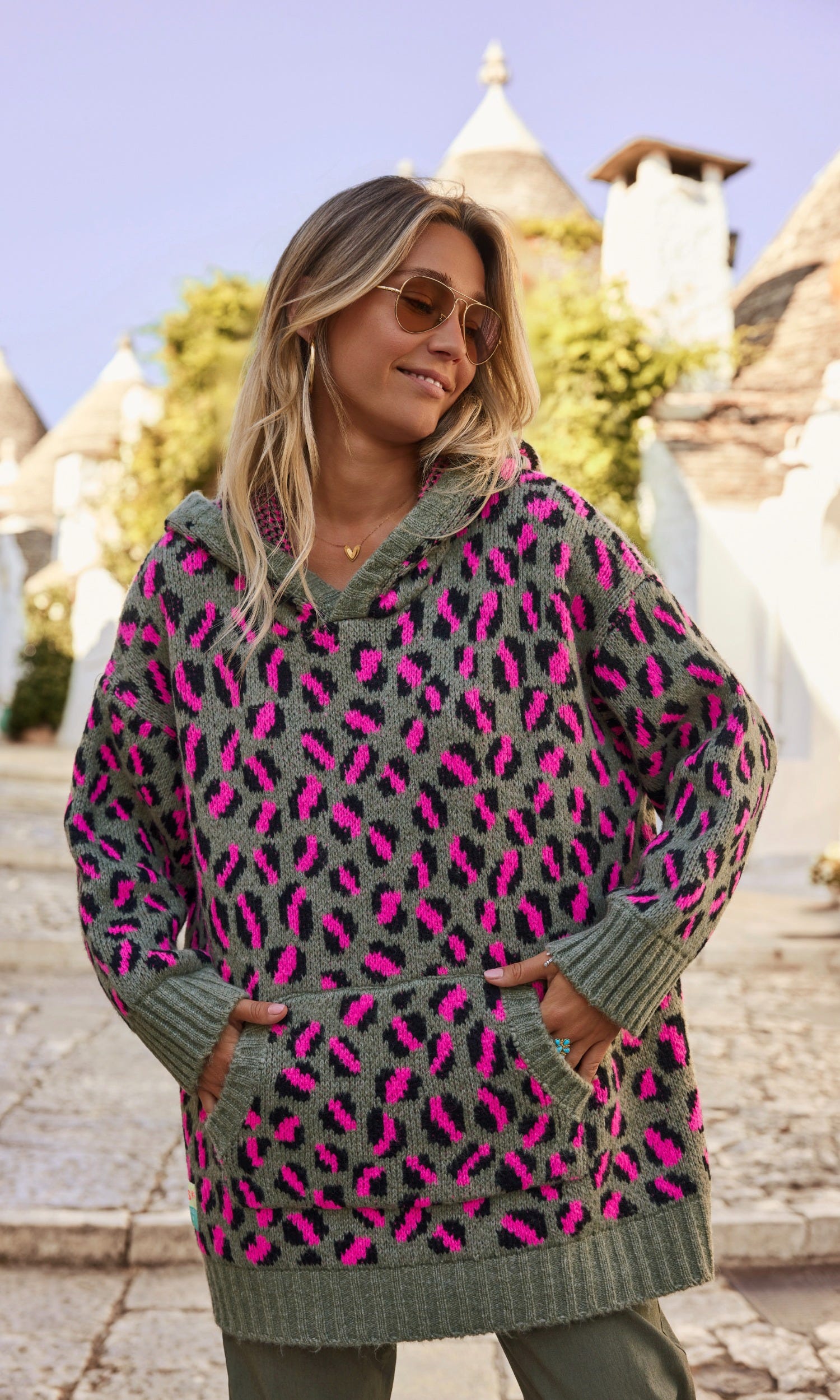 L'imprimé léopard rose sur l'ensemble ajoute une note féminine et moderne, tandis que la poche kangourou pratique apporte une touche fonctionnelle.