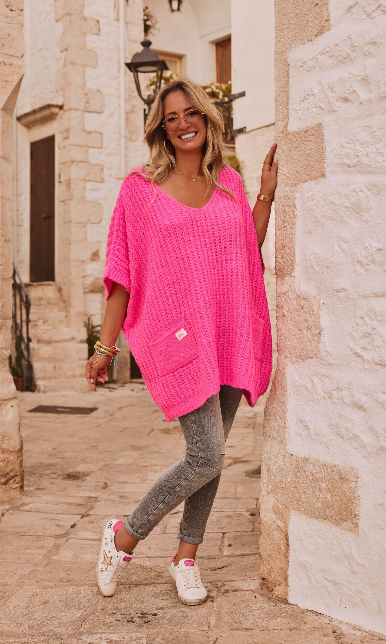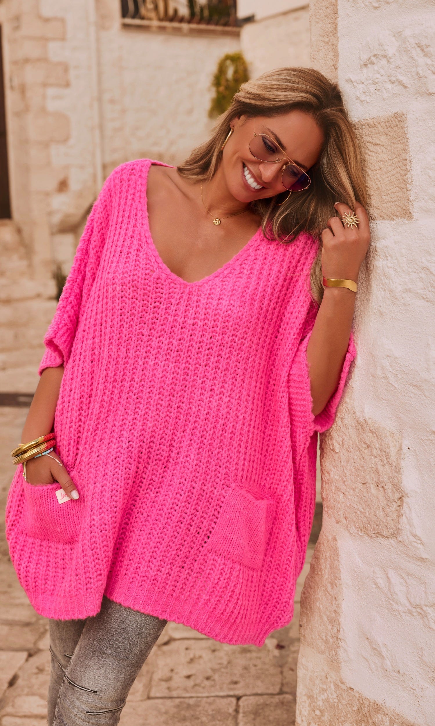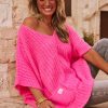 Découvrez ce pull rose fluo en coupe oversize, idéal pour un look décontracté.