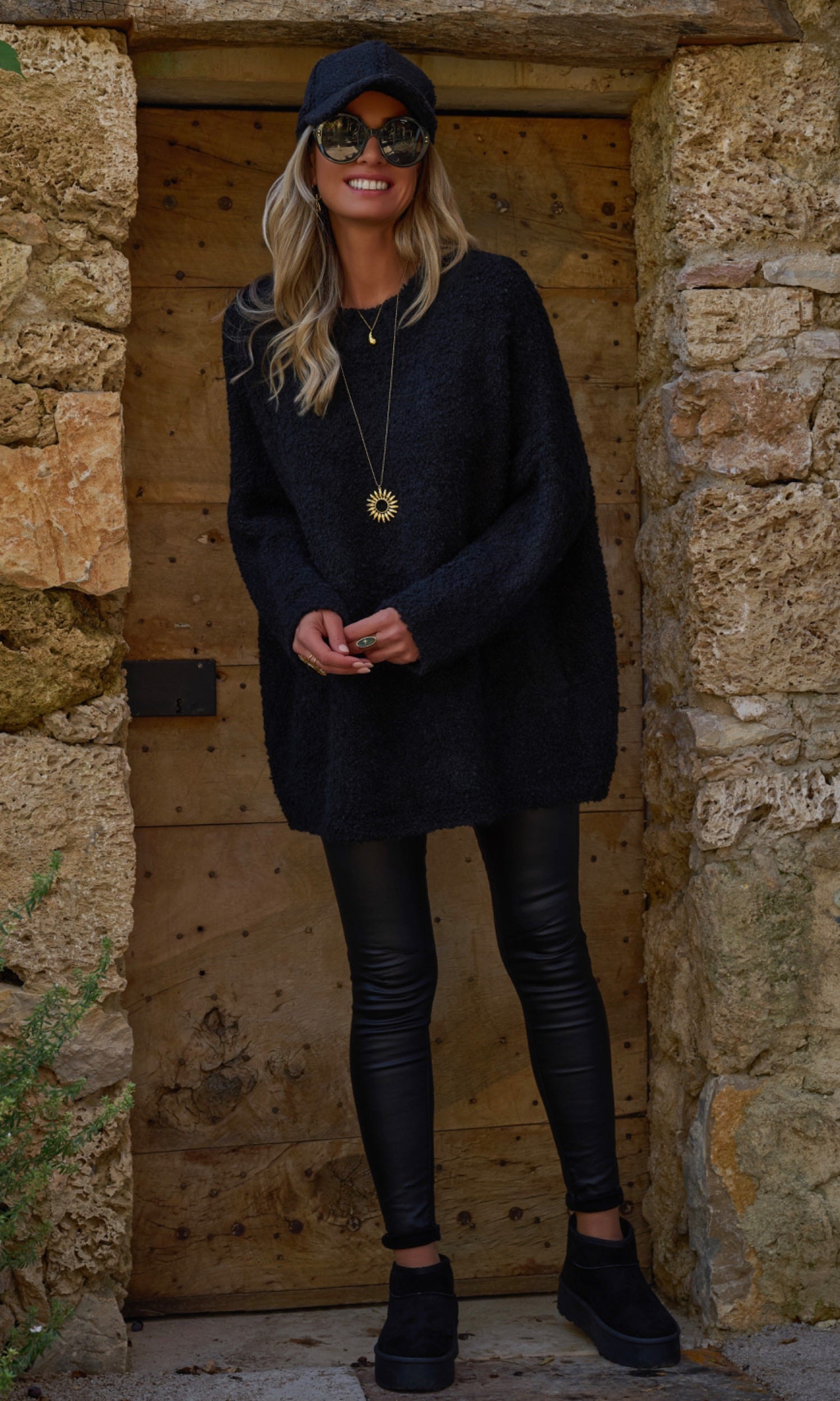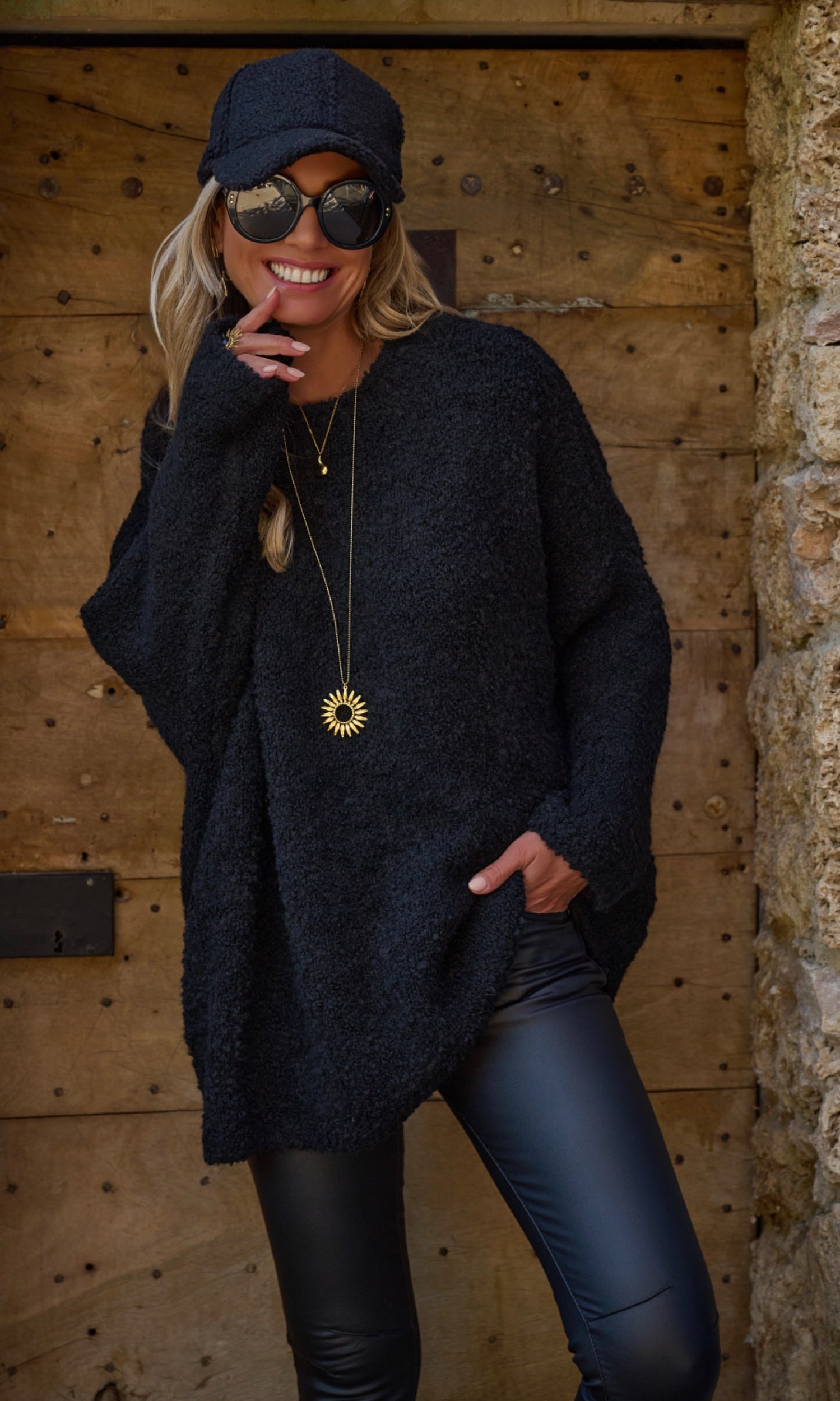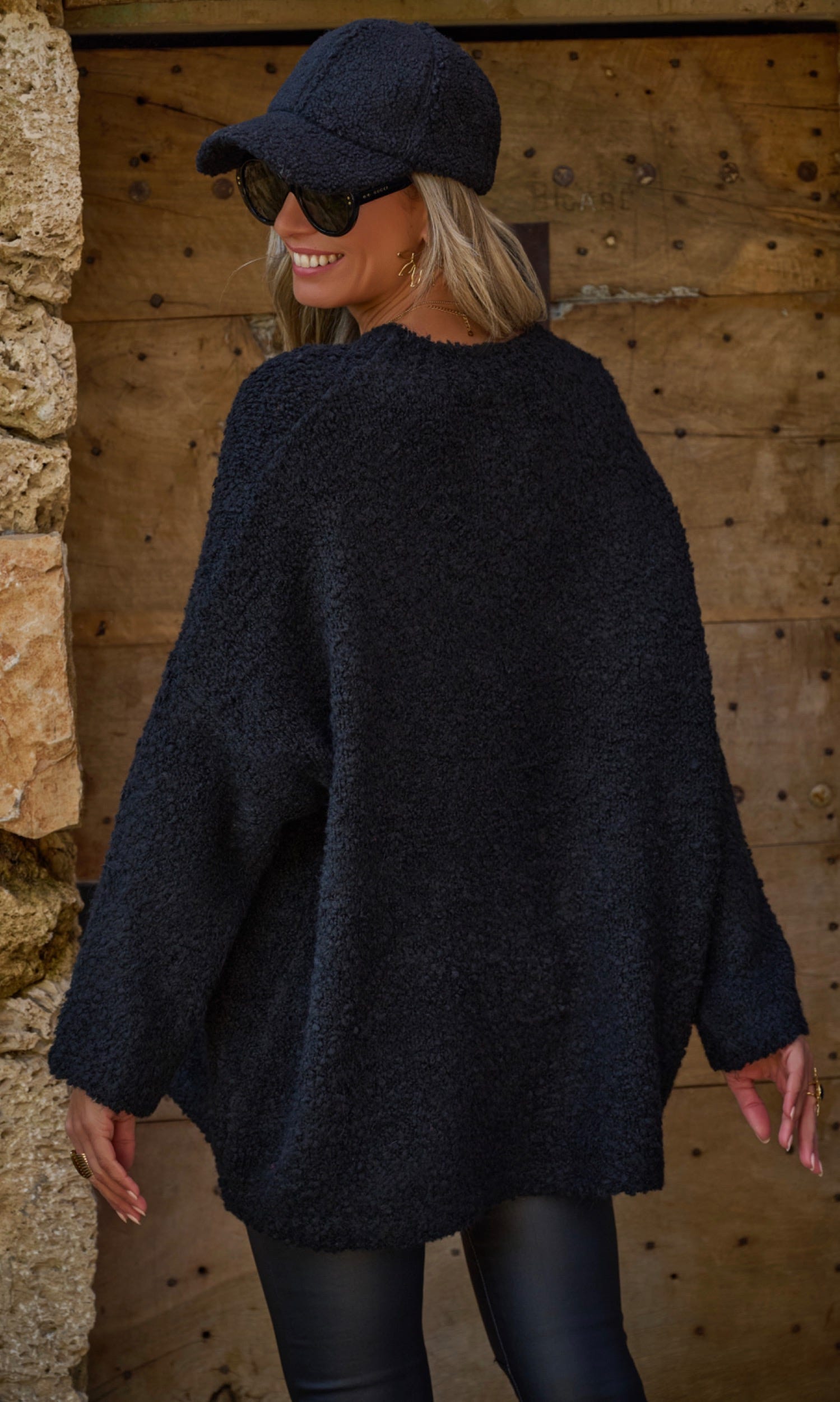 Ce pull noir en maille bouclette offre une coupe loose tendance, idéale pour un look décontracté.