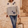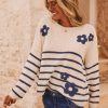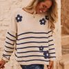 Avec son col rond et ses manches longues, il arbore un motif marinière sur l'ensemble, sublimé par de délicates fleurs en moumoute.