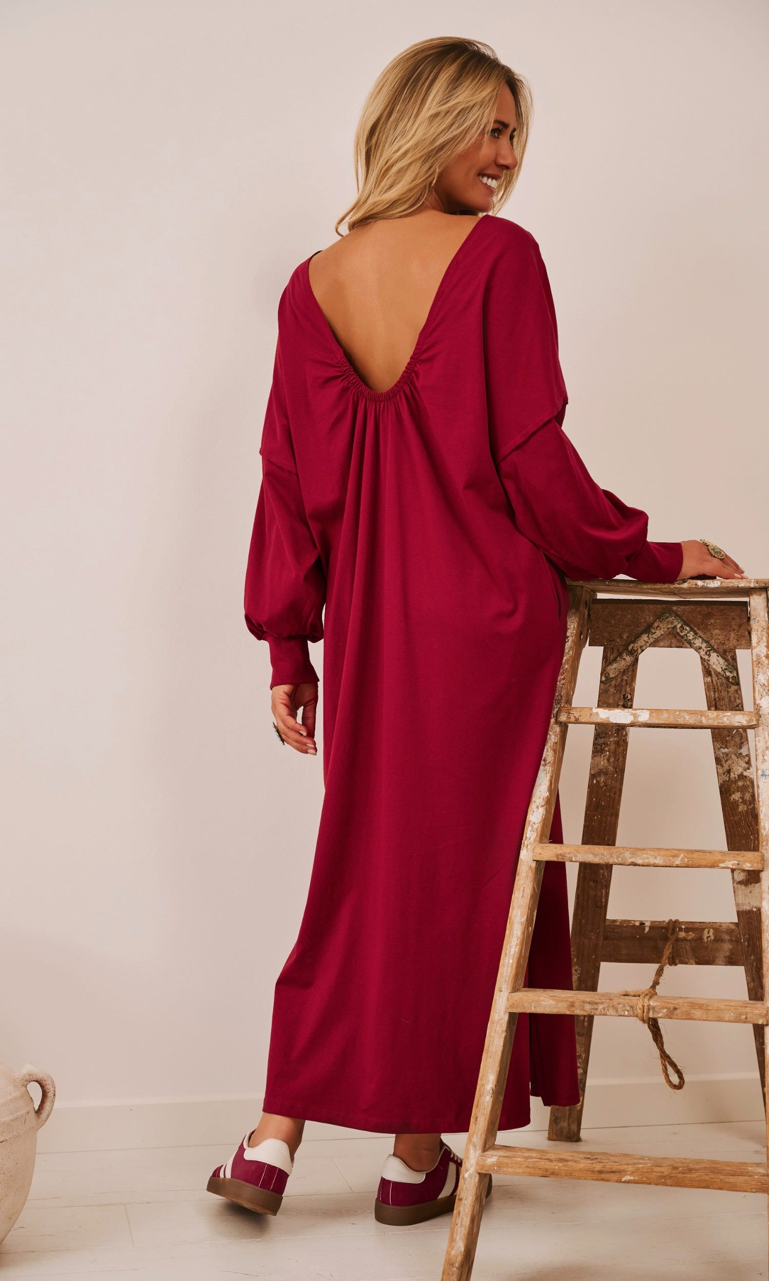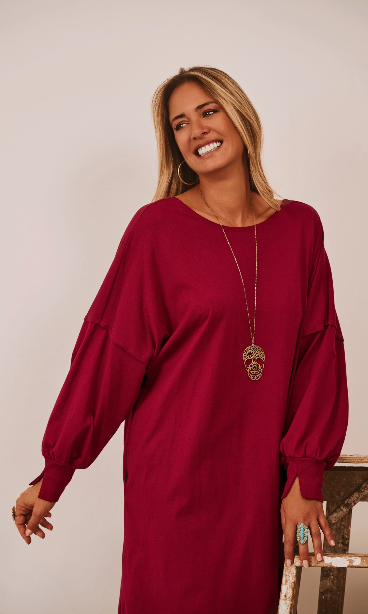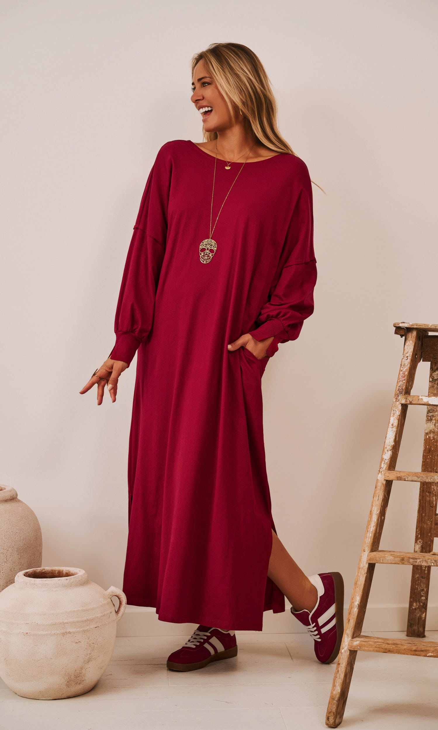 Découvrez notre robe bordeaux à la coupe loose, idéale pour allier confort et élégance.