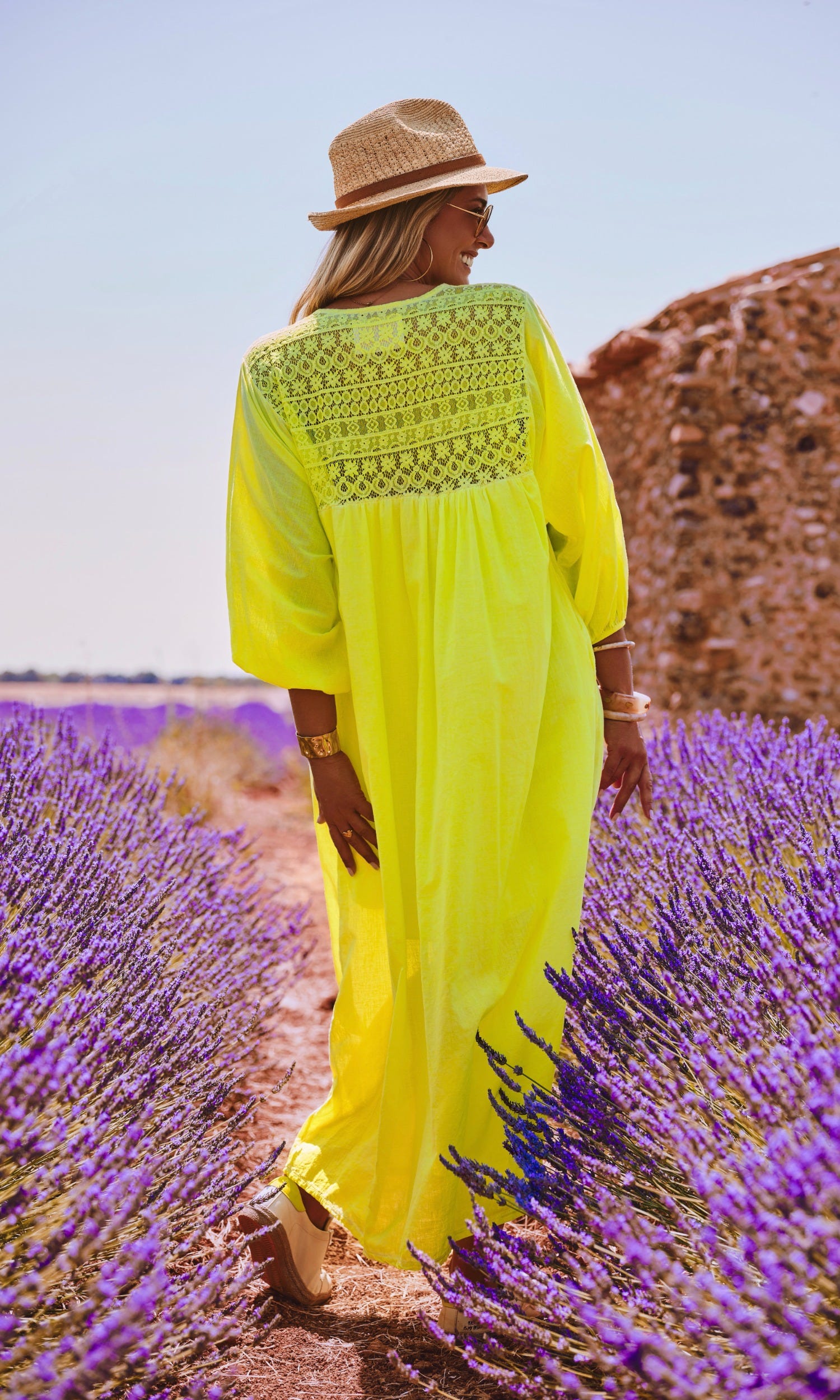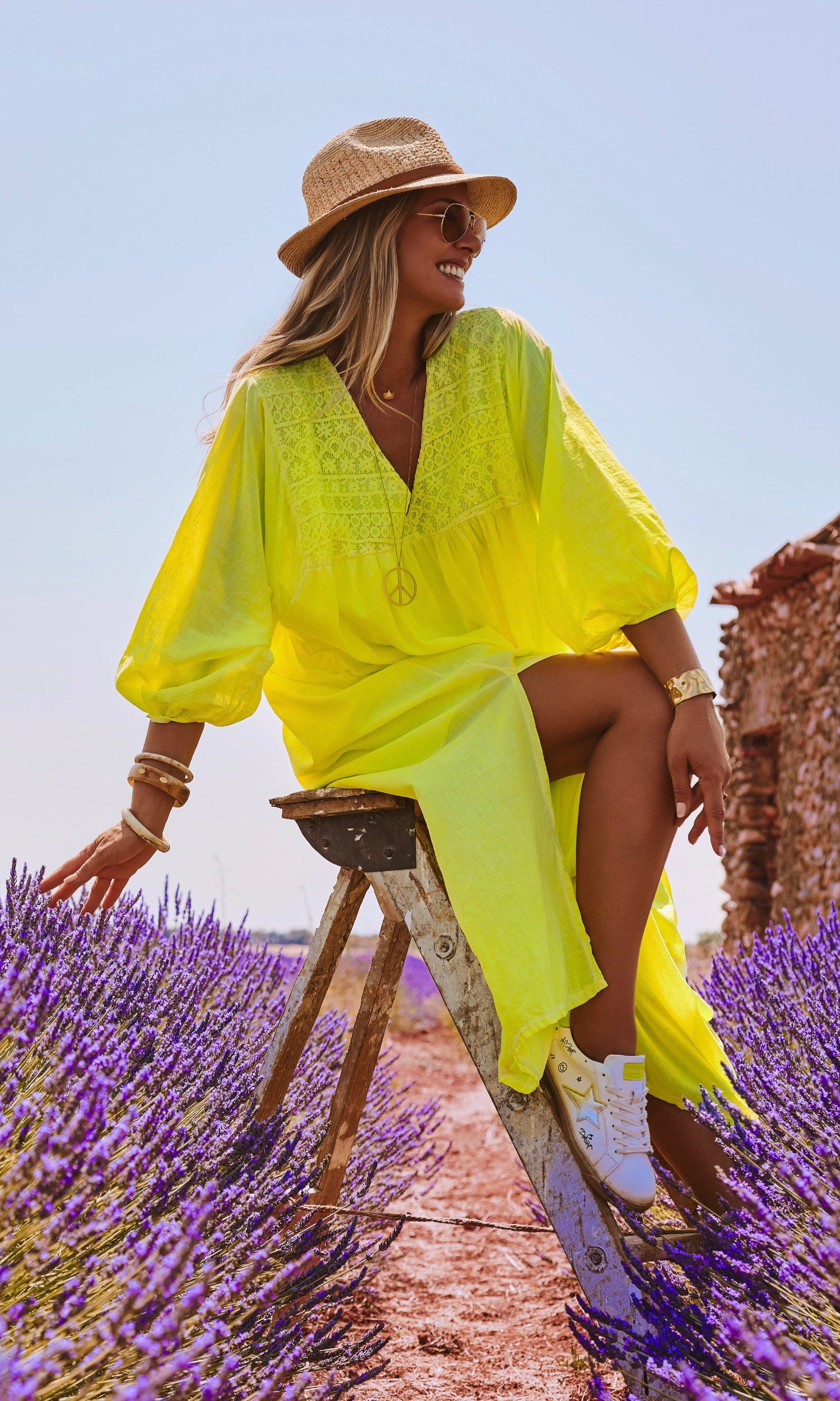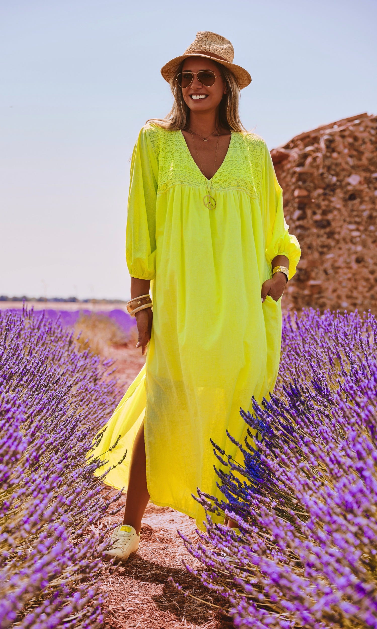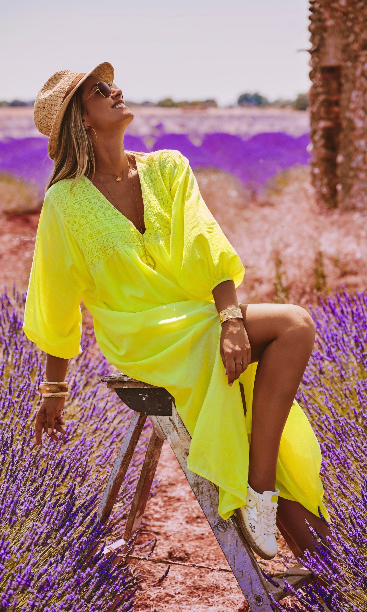 Découvrez cette robe jaune fluo en coton à la coupe oversize, alliant confort et élégance.