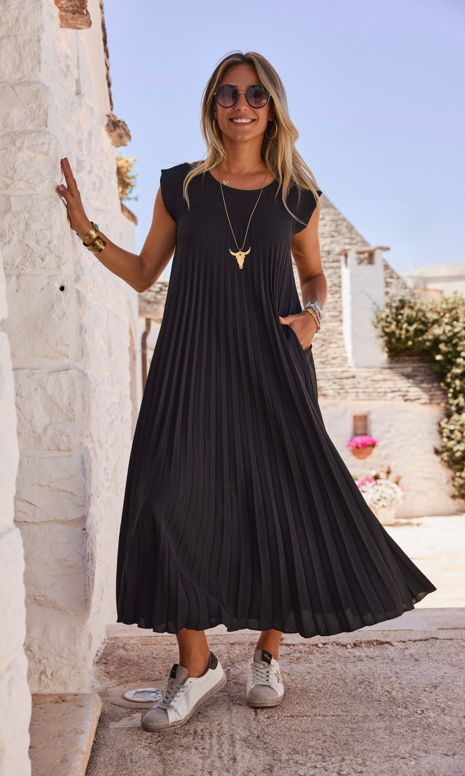 Découvrez notre robe noire fluide à manches courtes.Son col rond et ses deux poches latérales ajoutent une touche d'élégance à votre tenue.Longue et légère, elle est plissée sur son ensemble et offre un confort optimal tout en mettant en valeur votre silhouette.Idéale pour toutes les occasions, elle sera votre alliée mode.