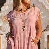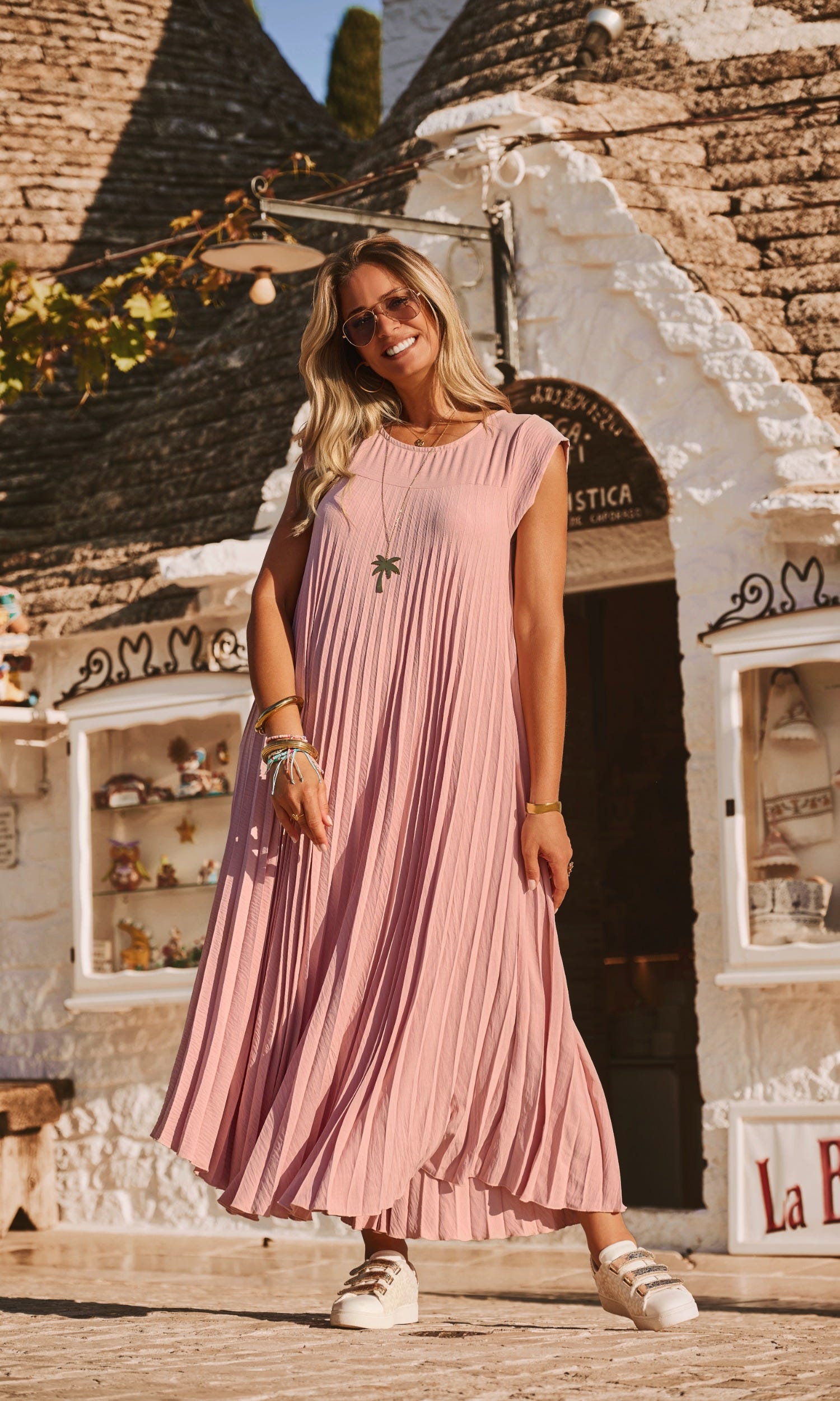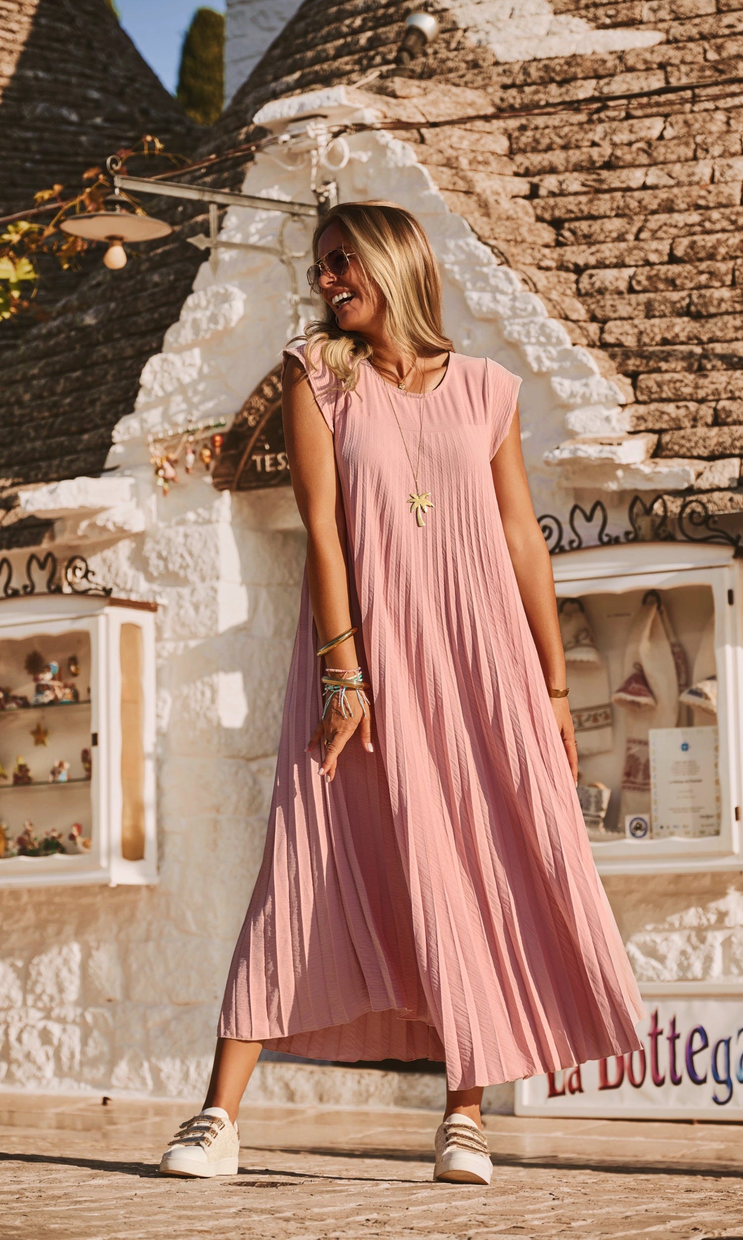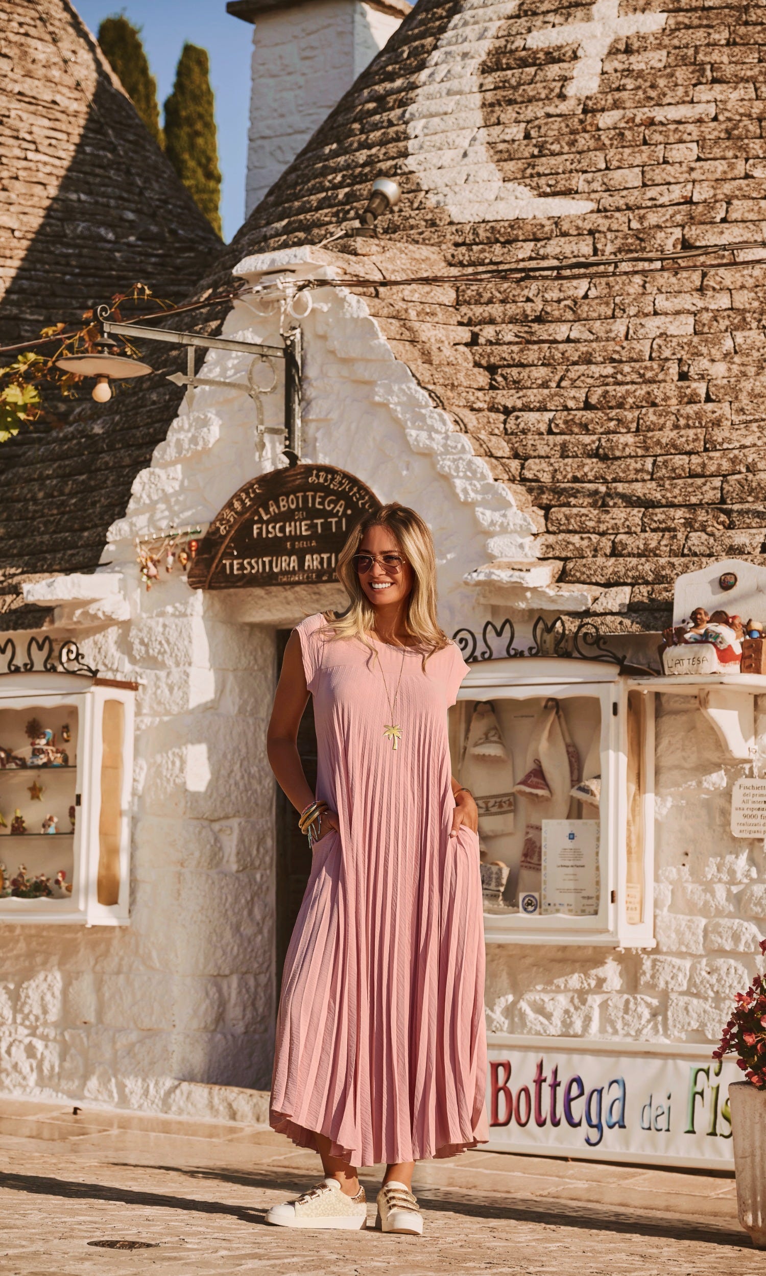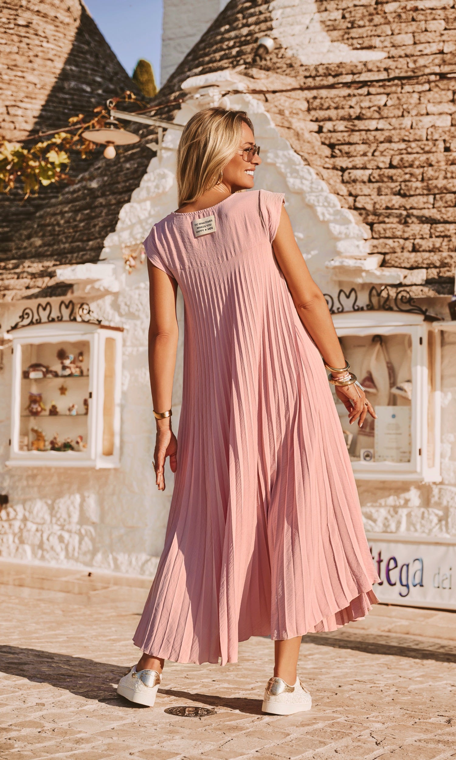 Découvrez notre robe rose fluide longue, idéale pour une allure élégante et décontractée.Dotée de manches courtes, elle présente un magnifique plissé sur une partie de la robe, apportant du mouvement à votre silhouette. Ella deux poches latérales.Son col rond complète ce modèle délicat, parfait pour toutes les occasions.Adoptez-la sans hésiter !