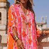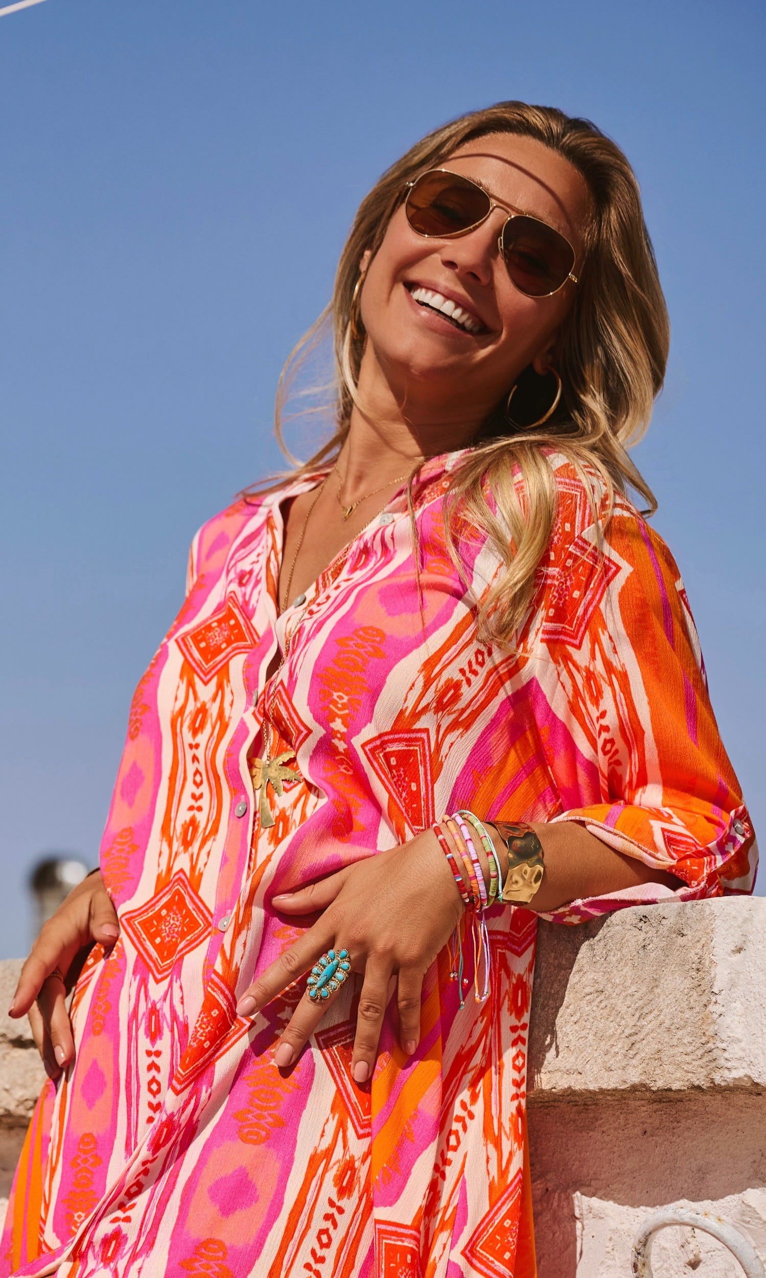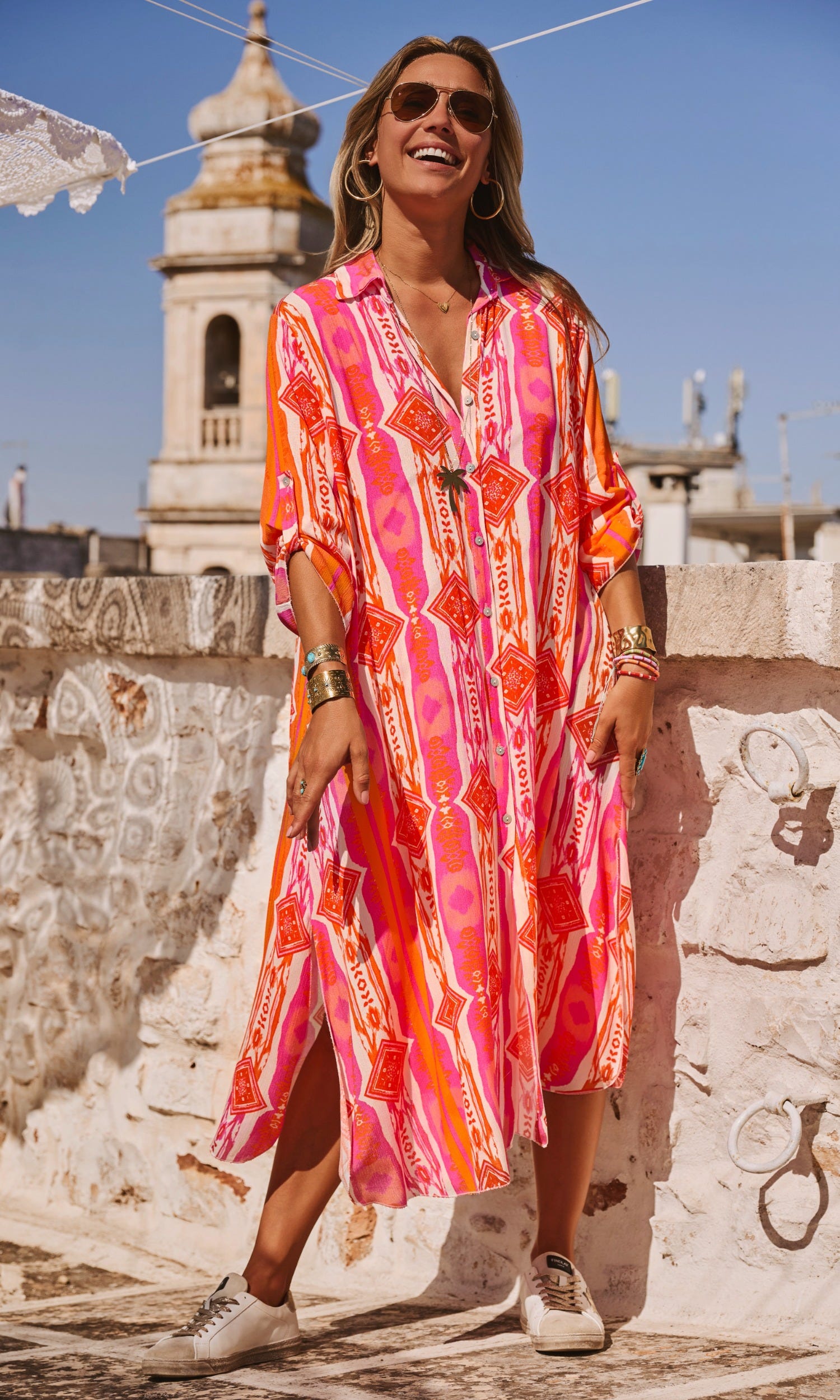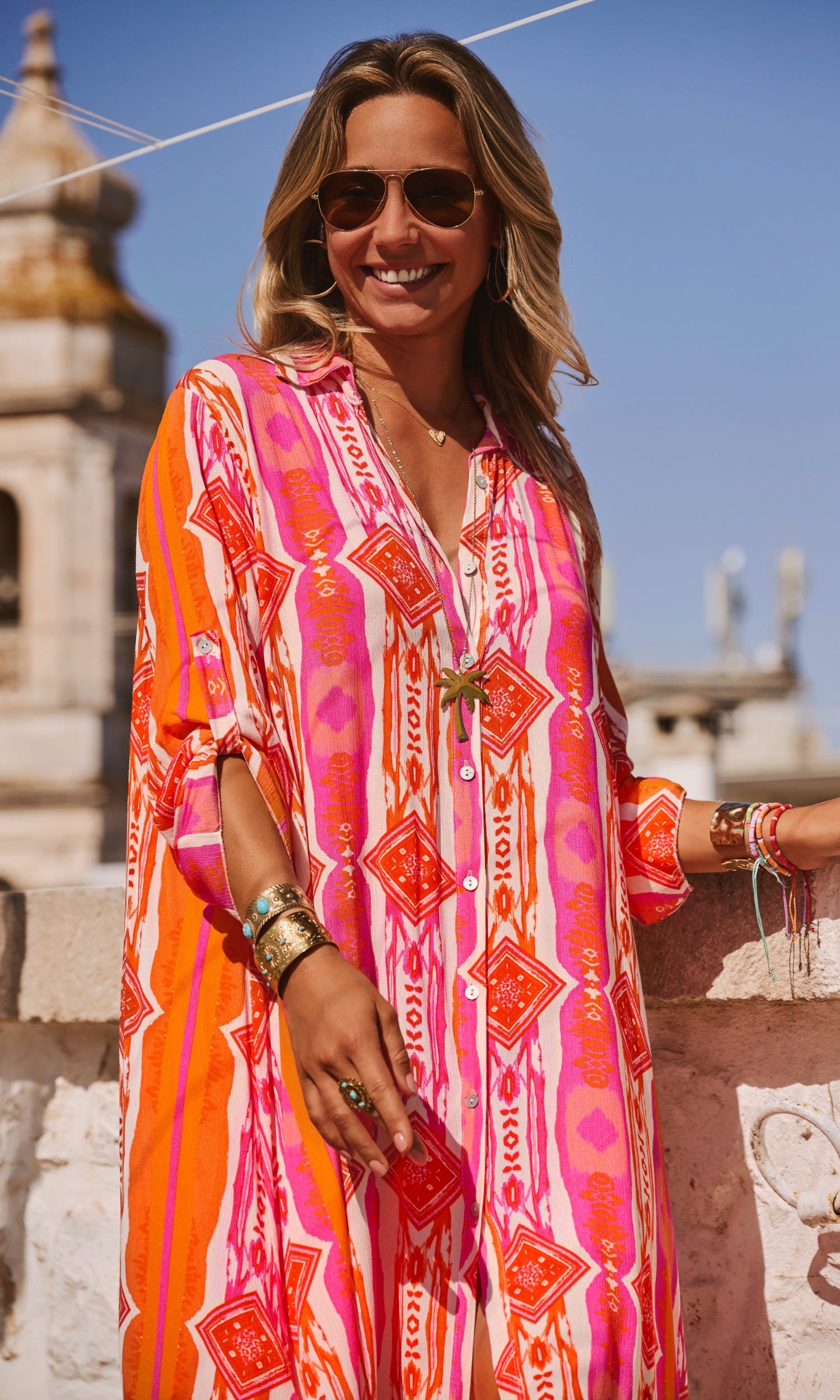 Découvrez notre élégante robe longue orange à la coupe trapèze.