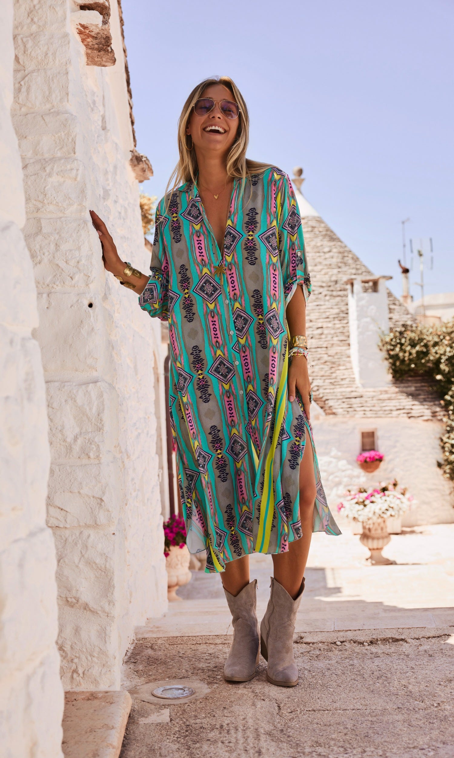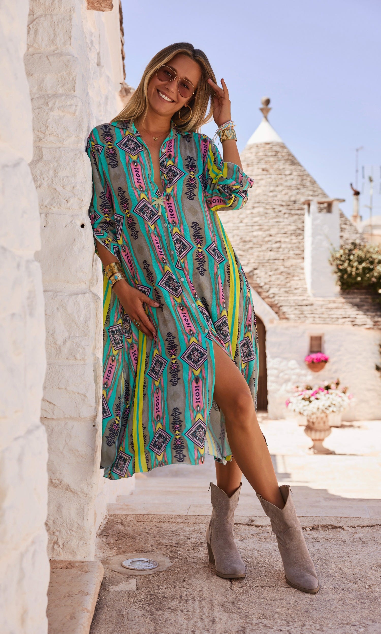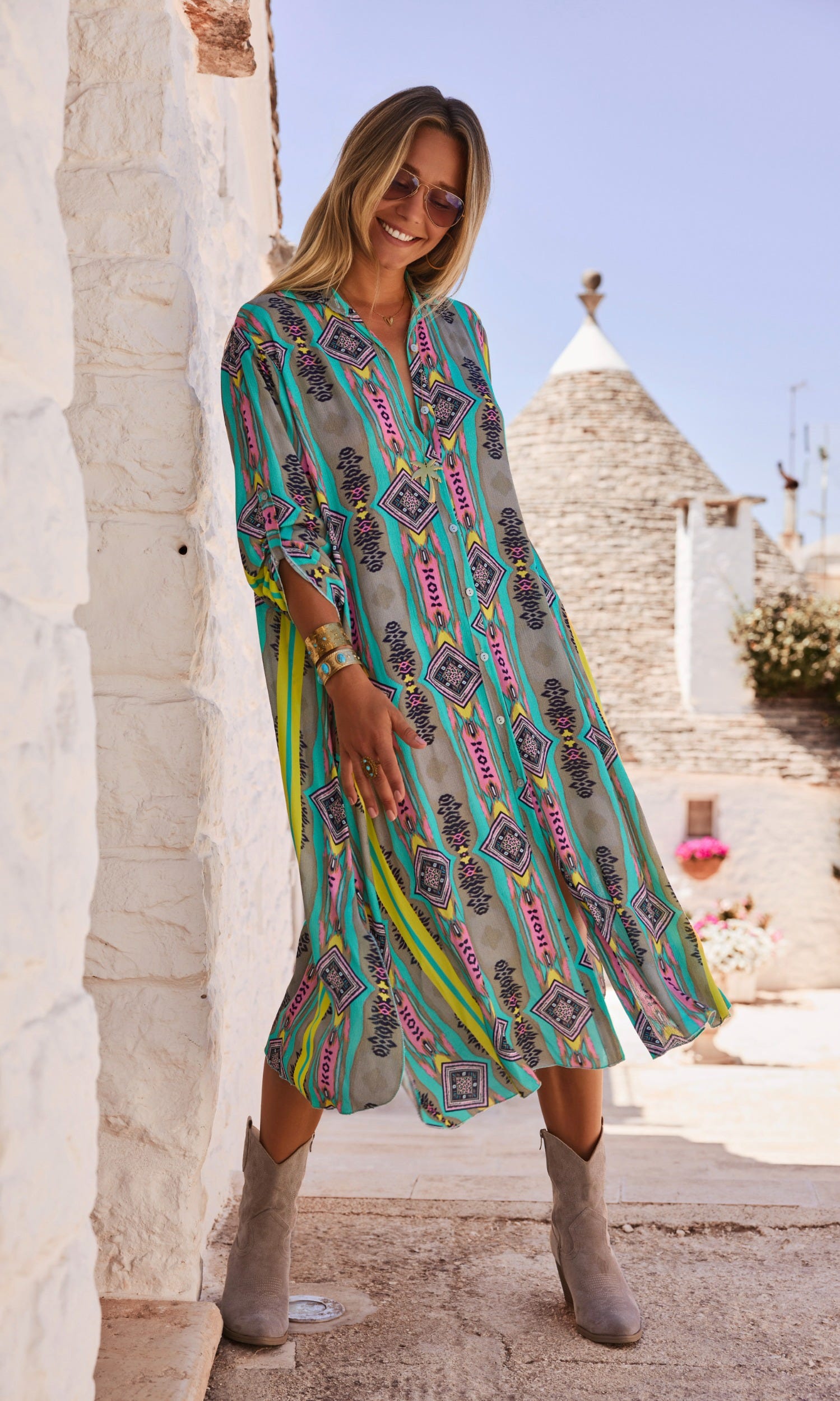 Boutonnée sur toute sa hauteur, elle arbore un col chemise et des manches longues ornées de pattes de boutonnage.