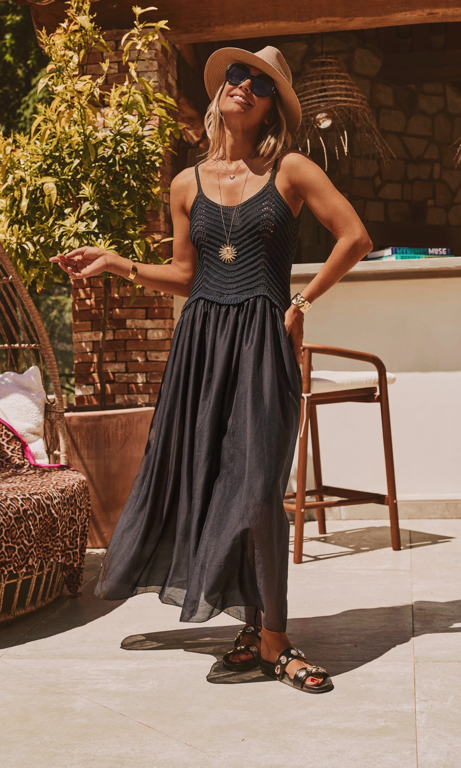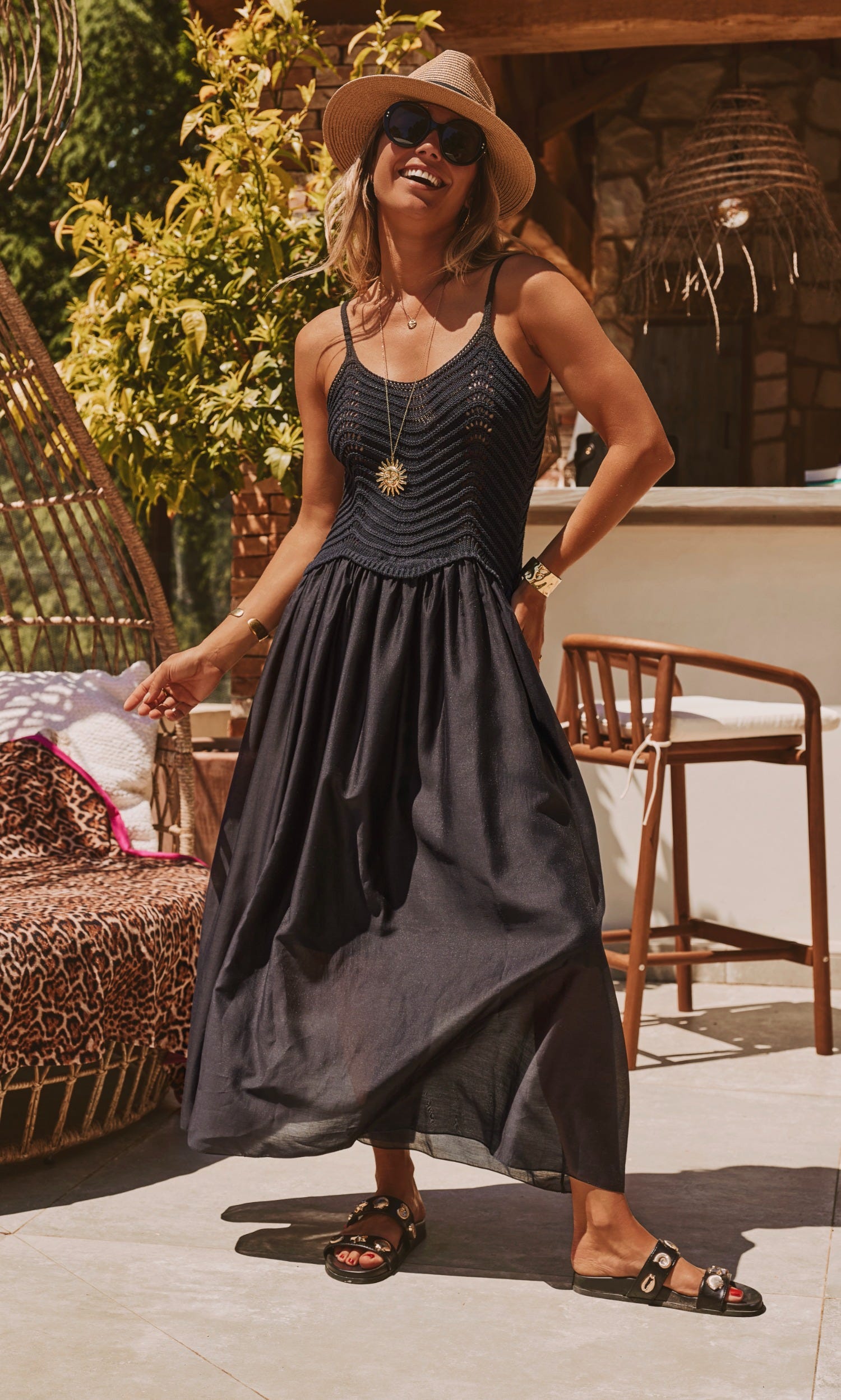 Découvrez notre robe noire légère, élégamment conçue avec un bustier en crochet au col V.