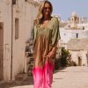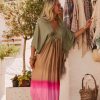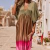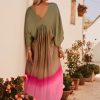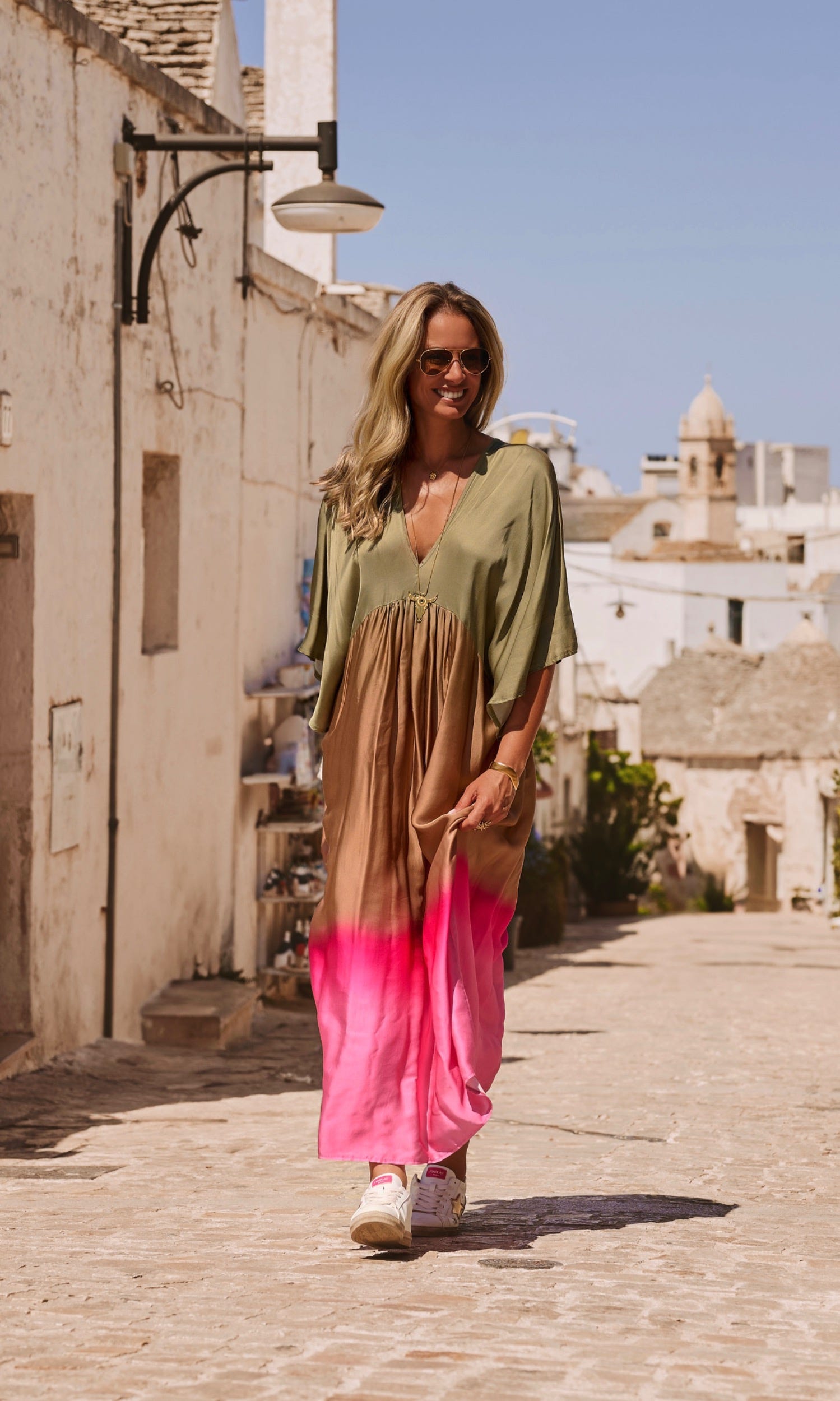 Découvrez cette robe longue envoûtante aux teintes kaki et rose, avec une coupe trapèze flatteuse.
