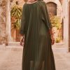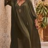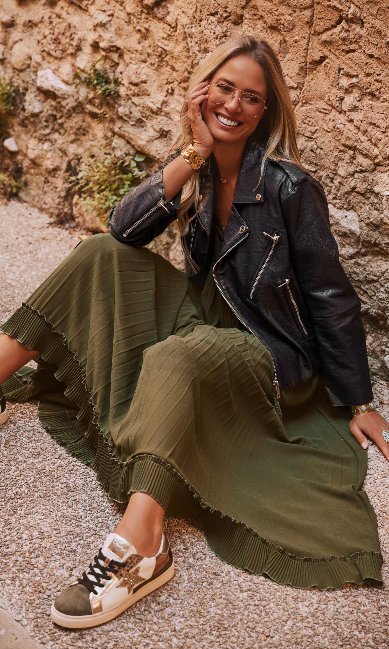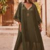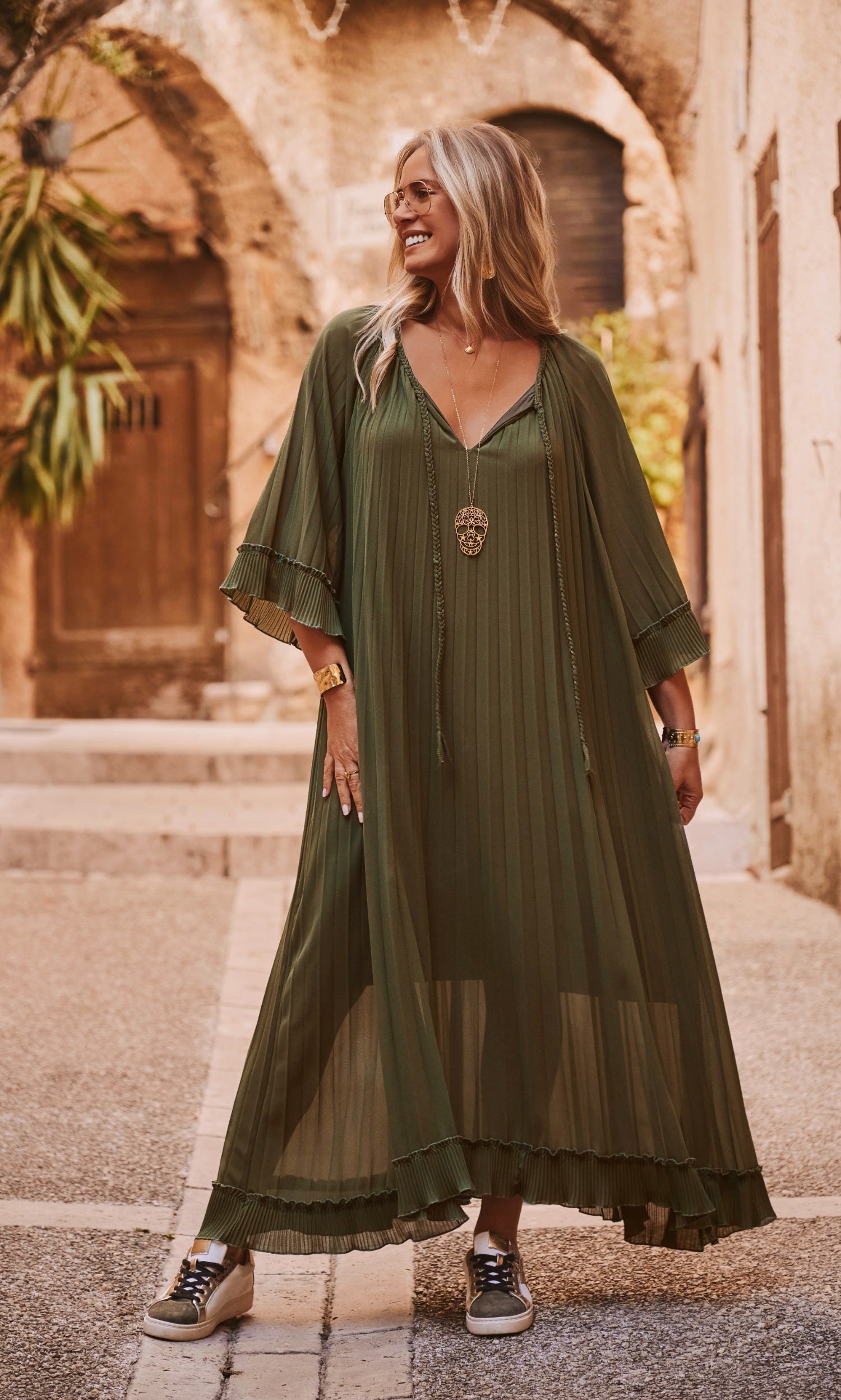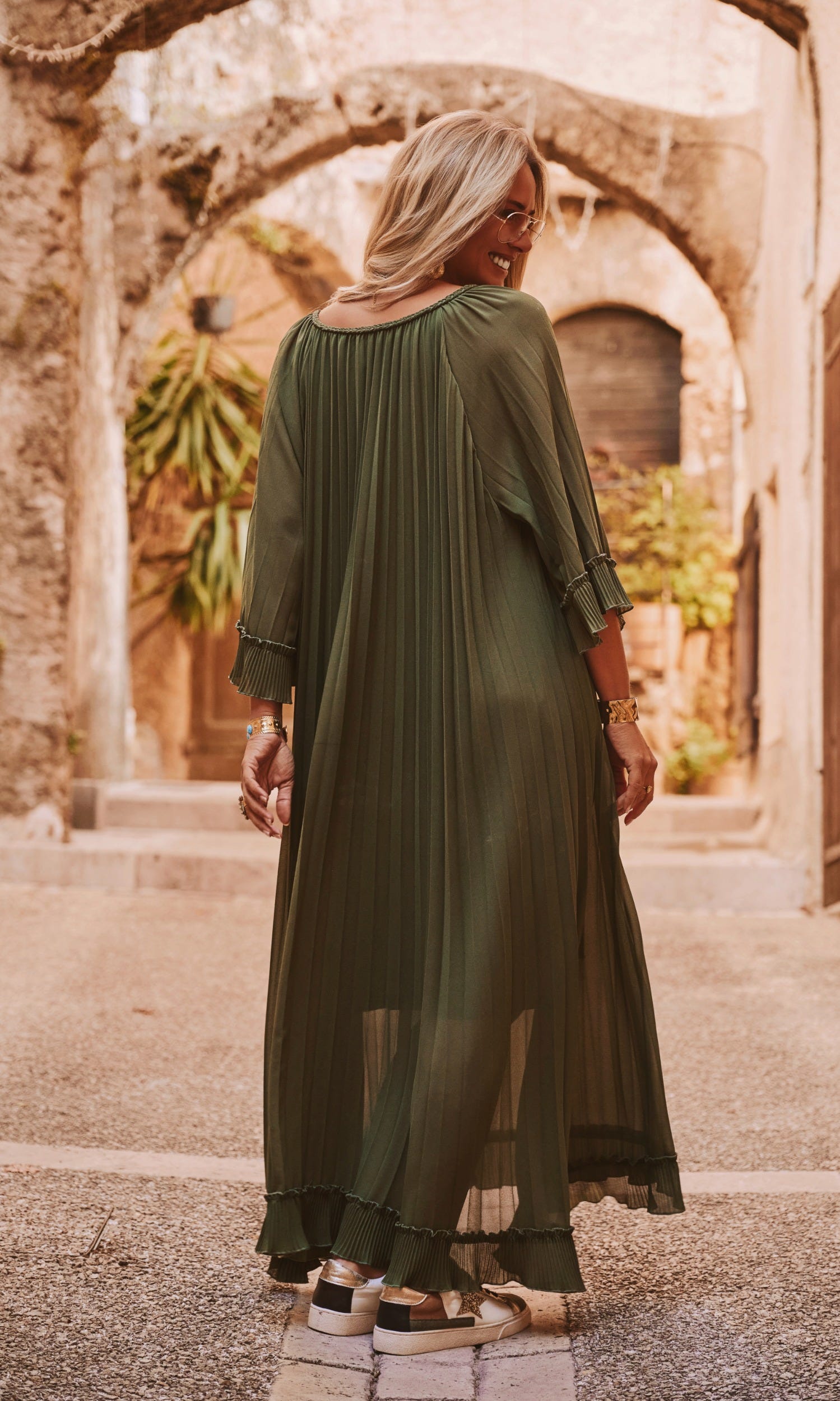 Découvrez cette élégante robe kaki en voile, plissée sur l'ensemble.