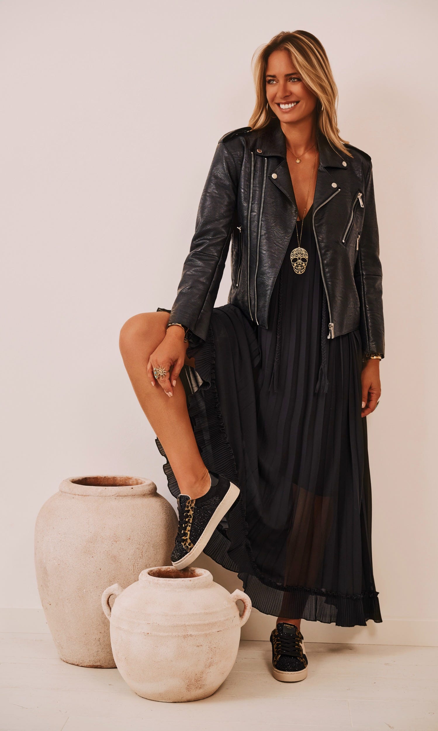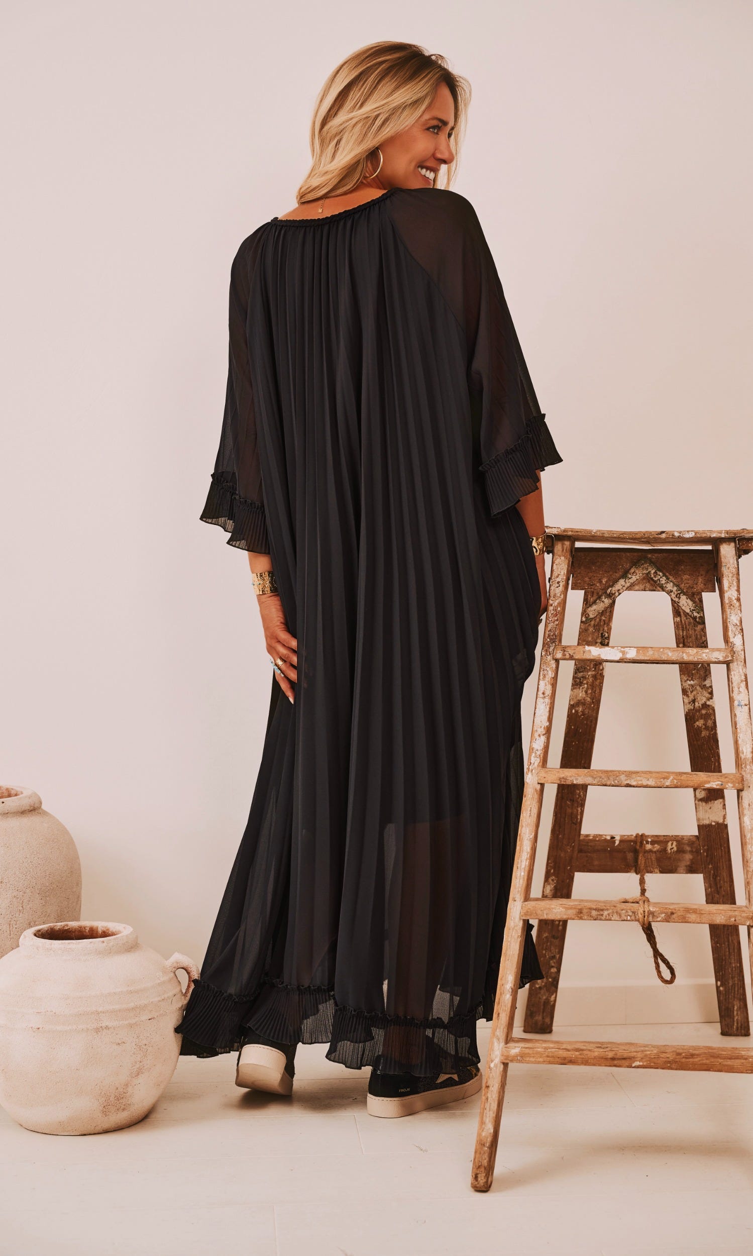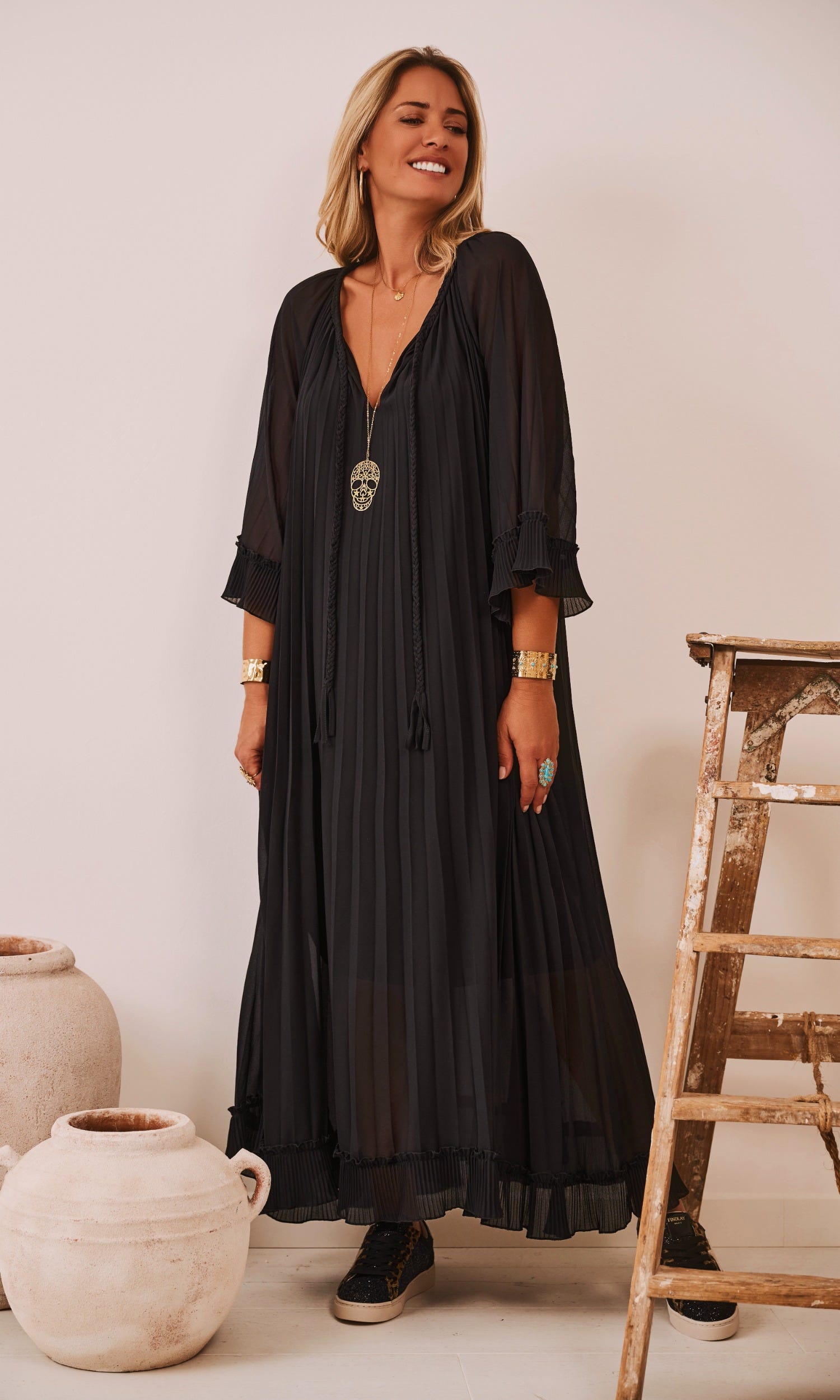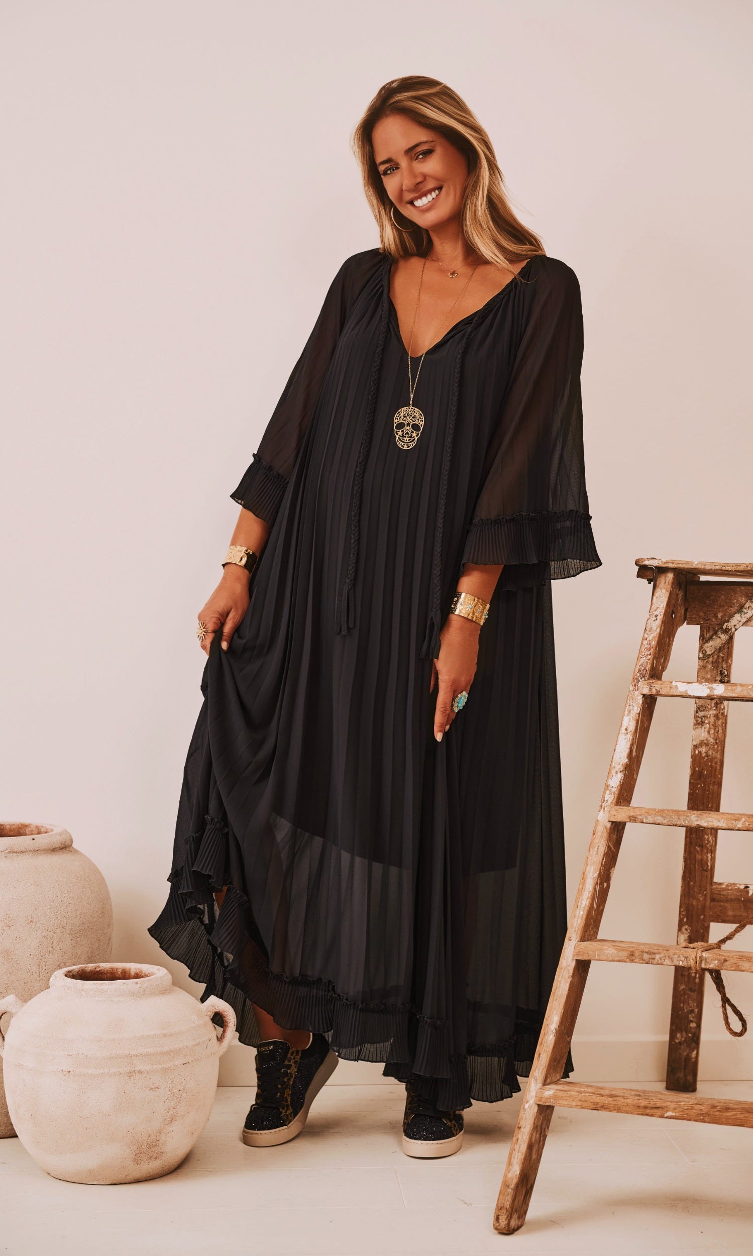 Découvrez notre élégante robe noire en voile, plissée sur l'ensemble.