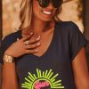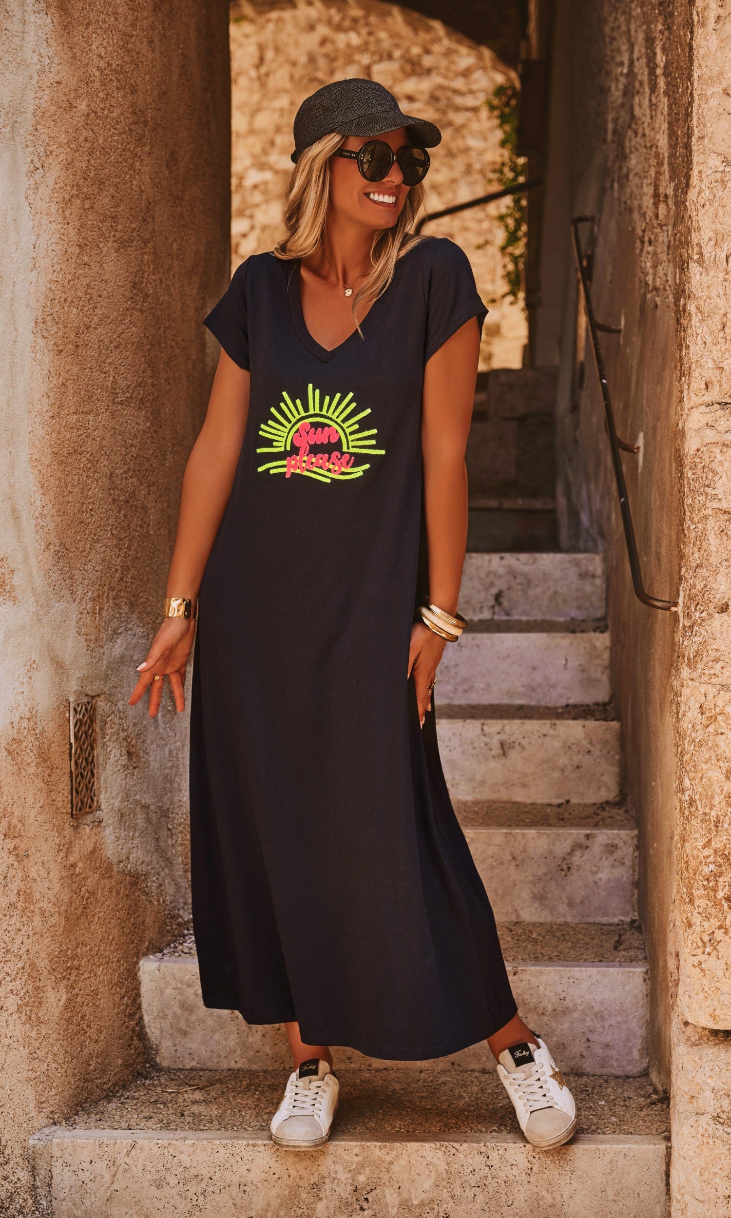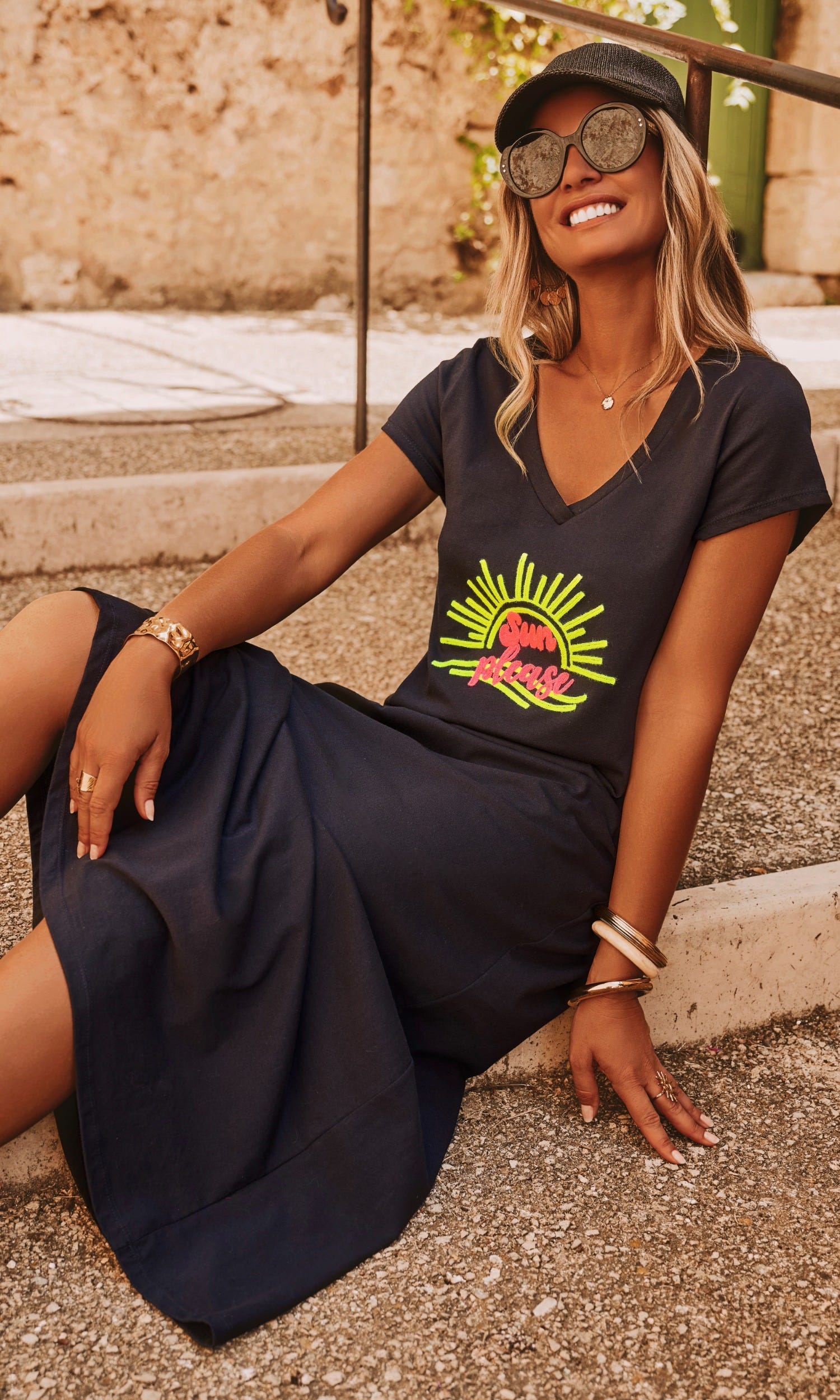 La broderie "Sun please" apporte une touche ludique et lumineuse.