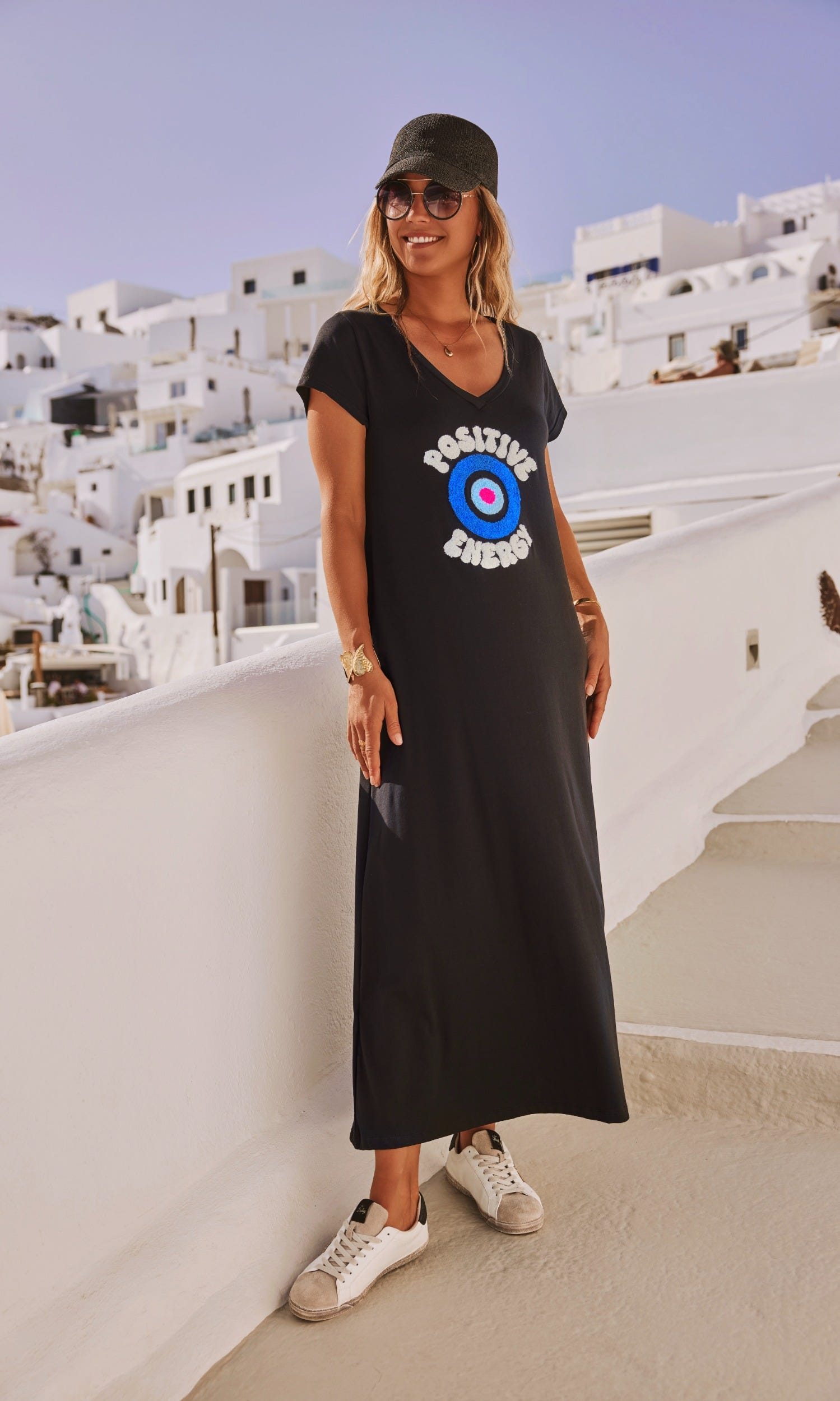Découvrez notre robe noire en coton à la coupe droite et au col V flatteur.