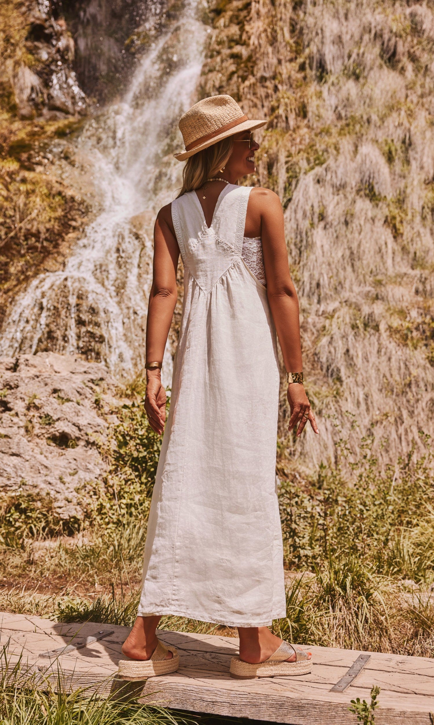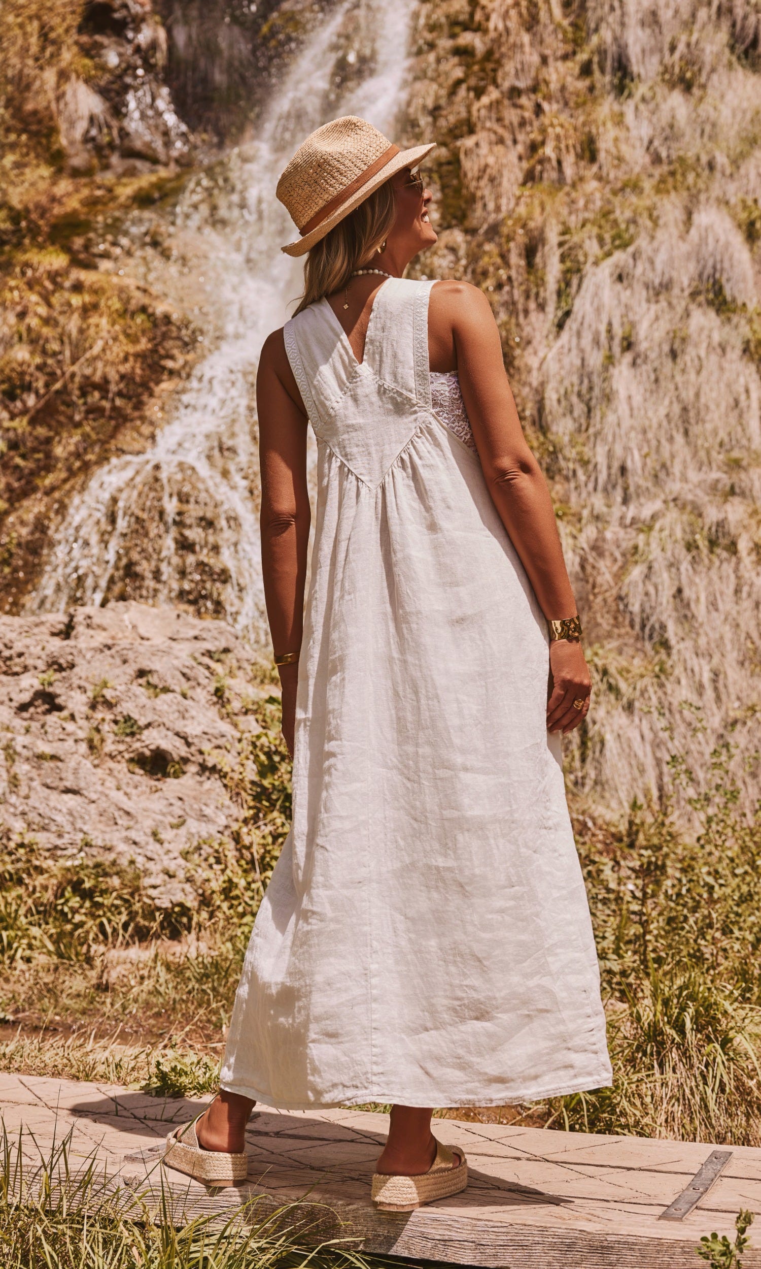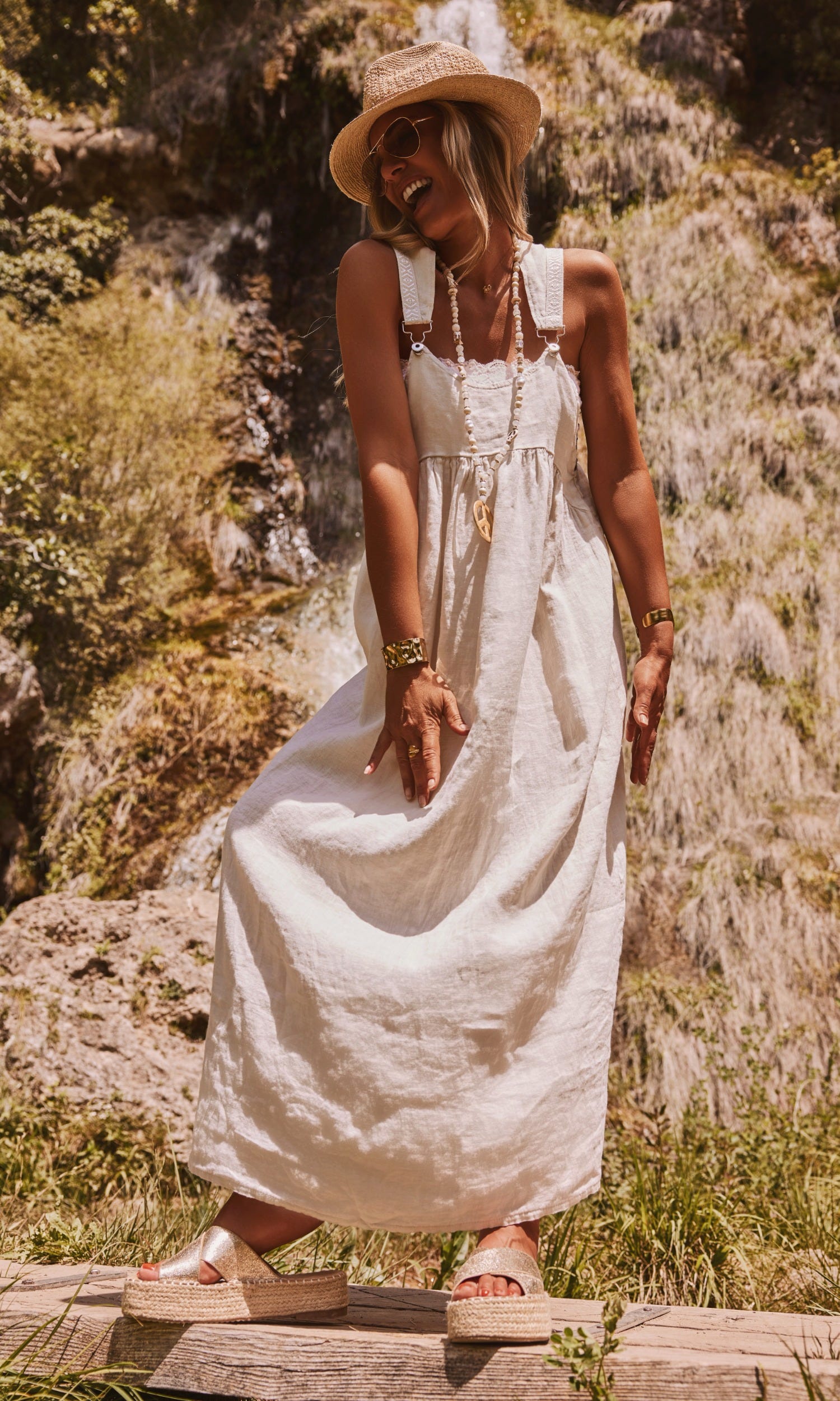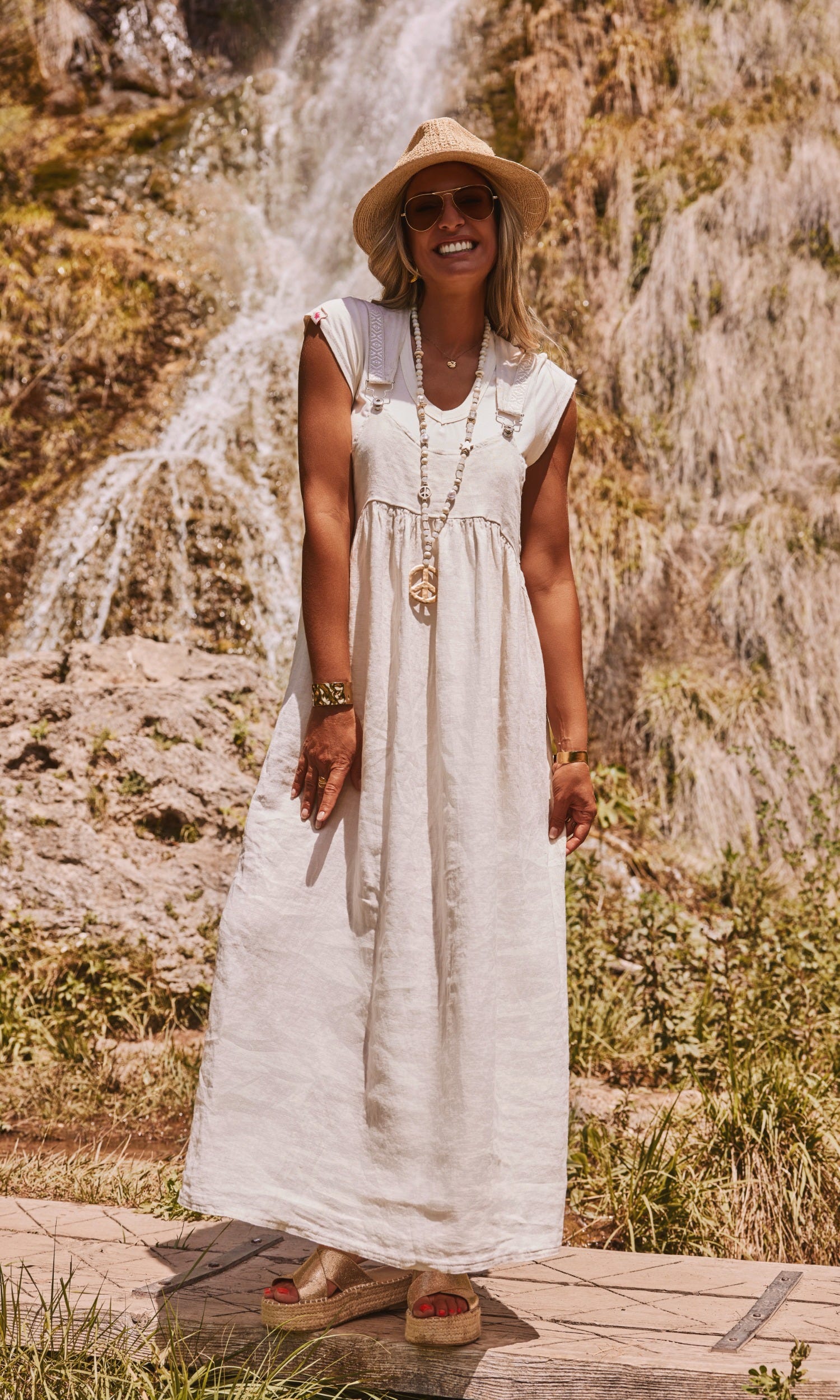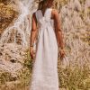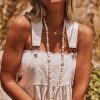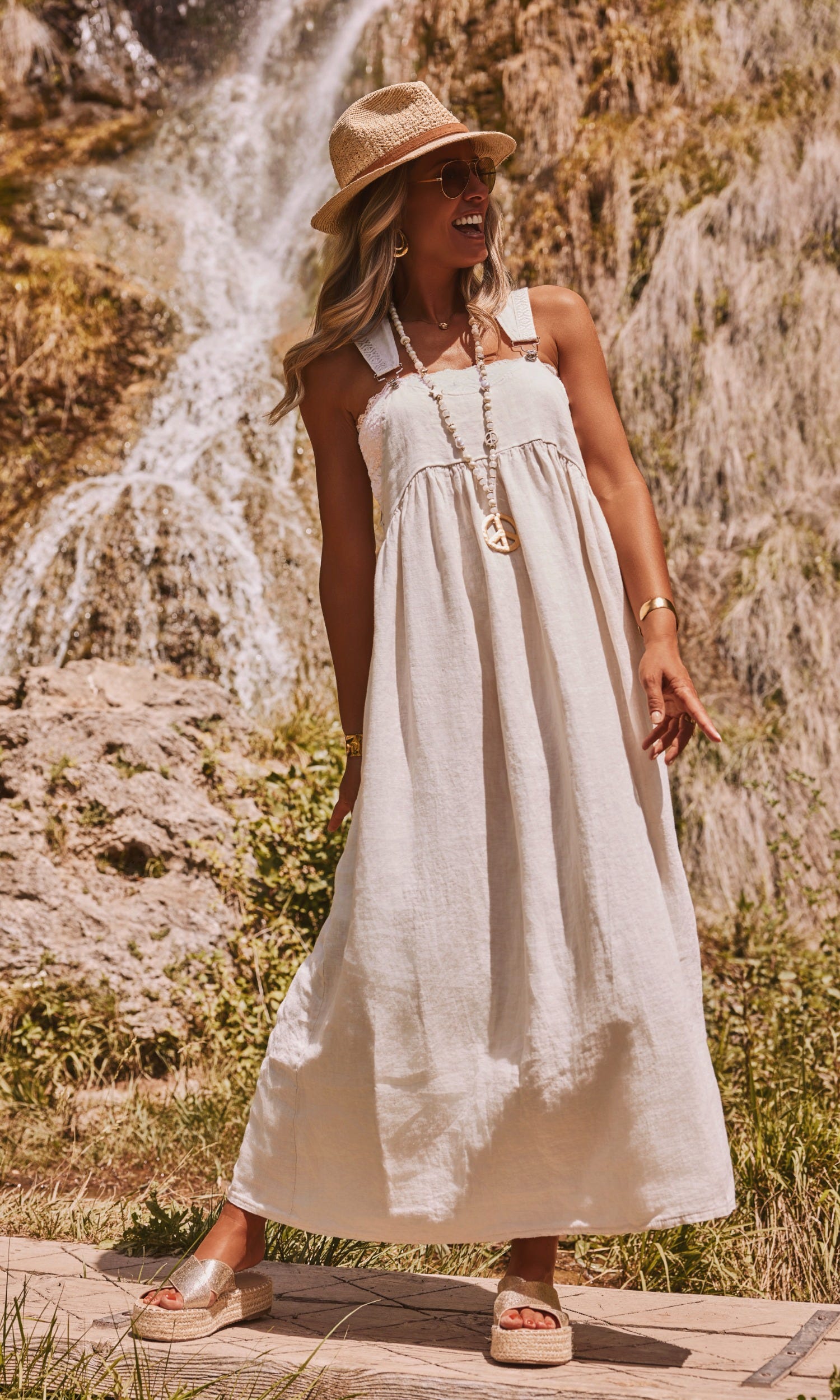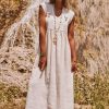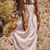 Cette robe salopette beige allie confort et style avec ses bretelles à boucle ornées de dentelle.