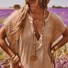 Sa coupe fluide et oversize met en valeur la silhouette, tandis que le col V et les manches courtes ajoutent une touche féminine.