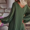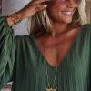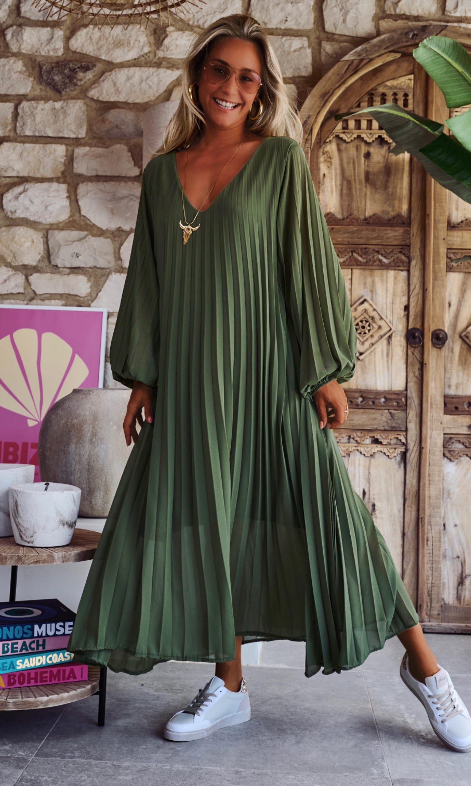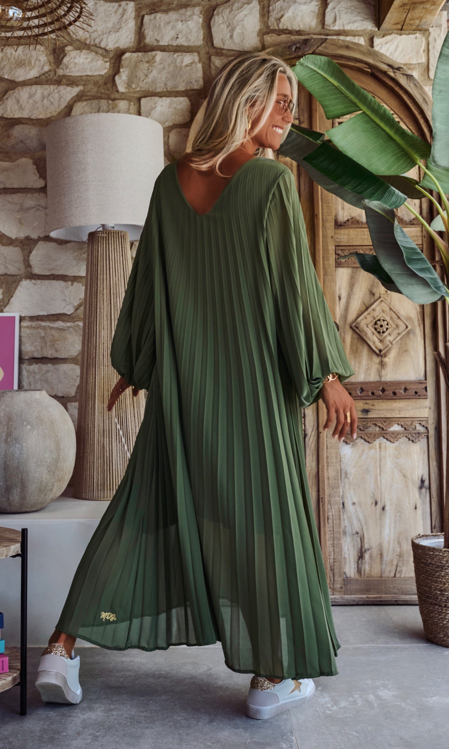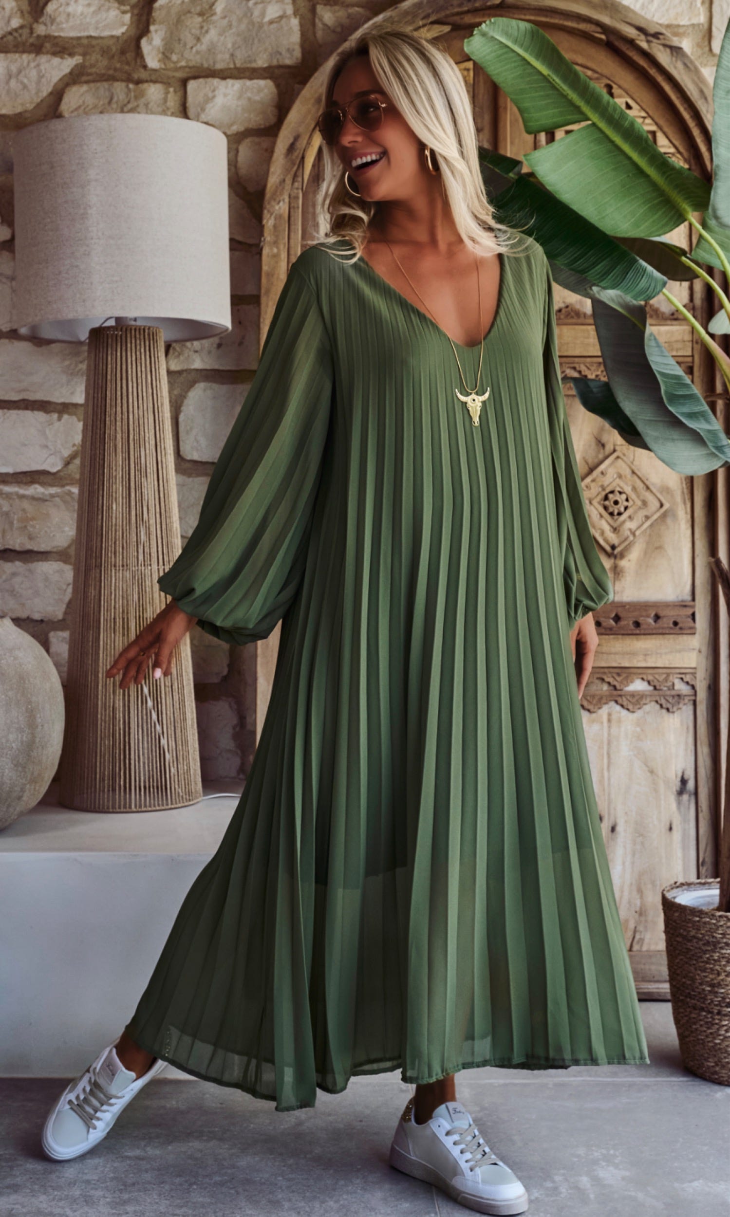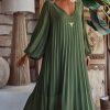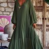 Craquez pour cette élégante robe kaki en voile plissée, dotée d'un col V flatteur.