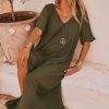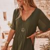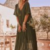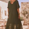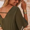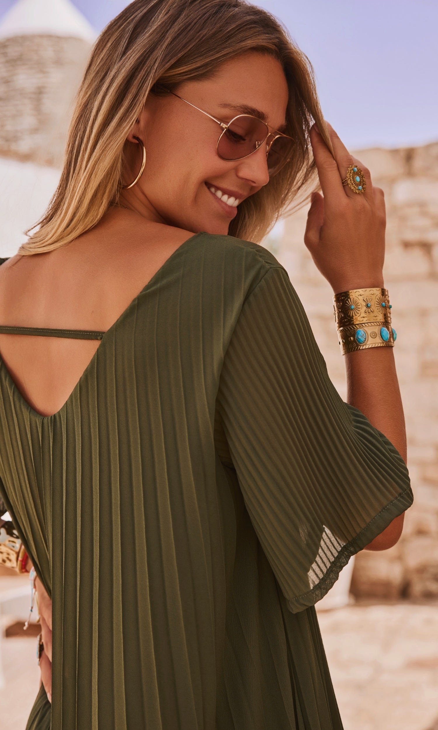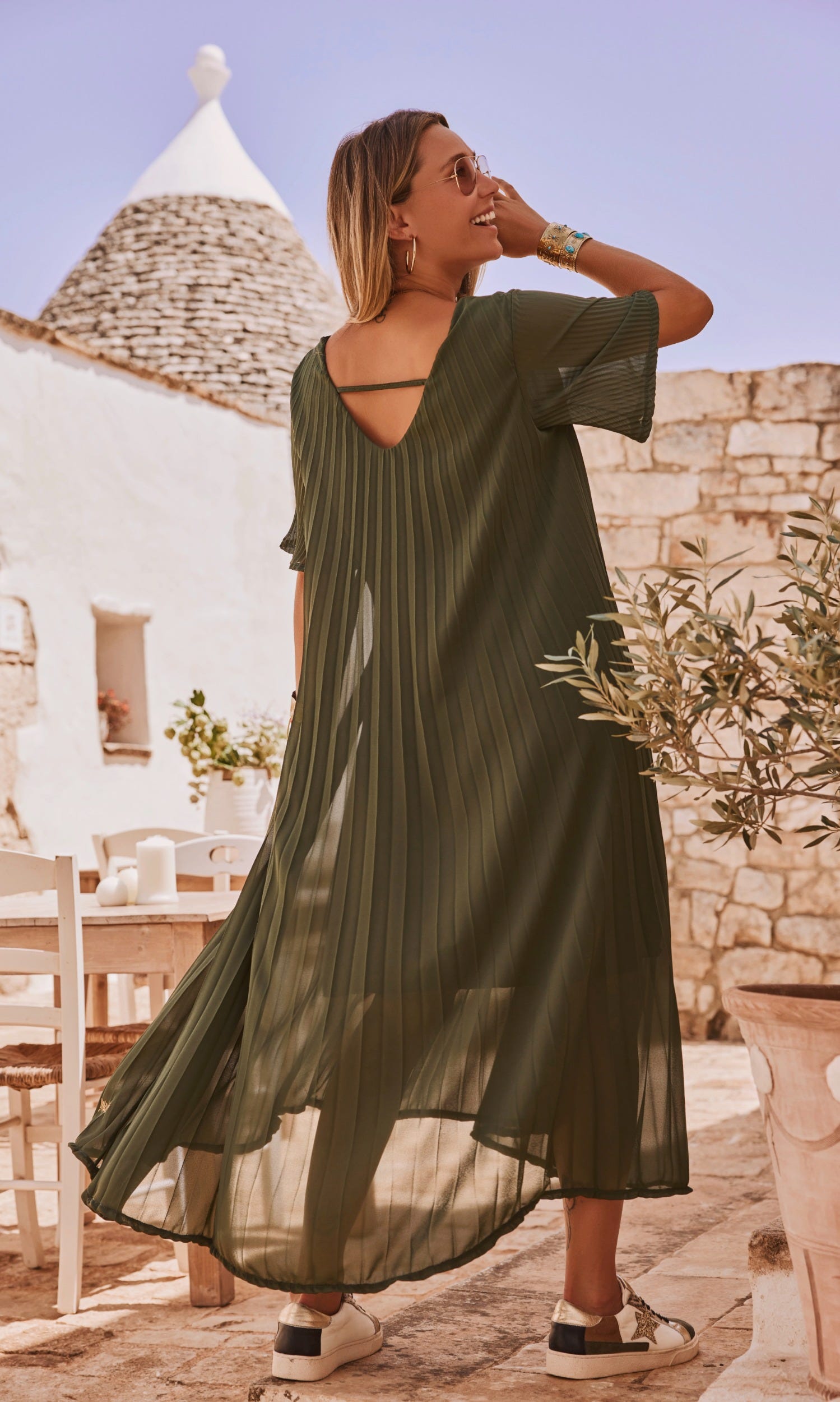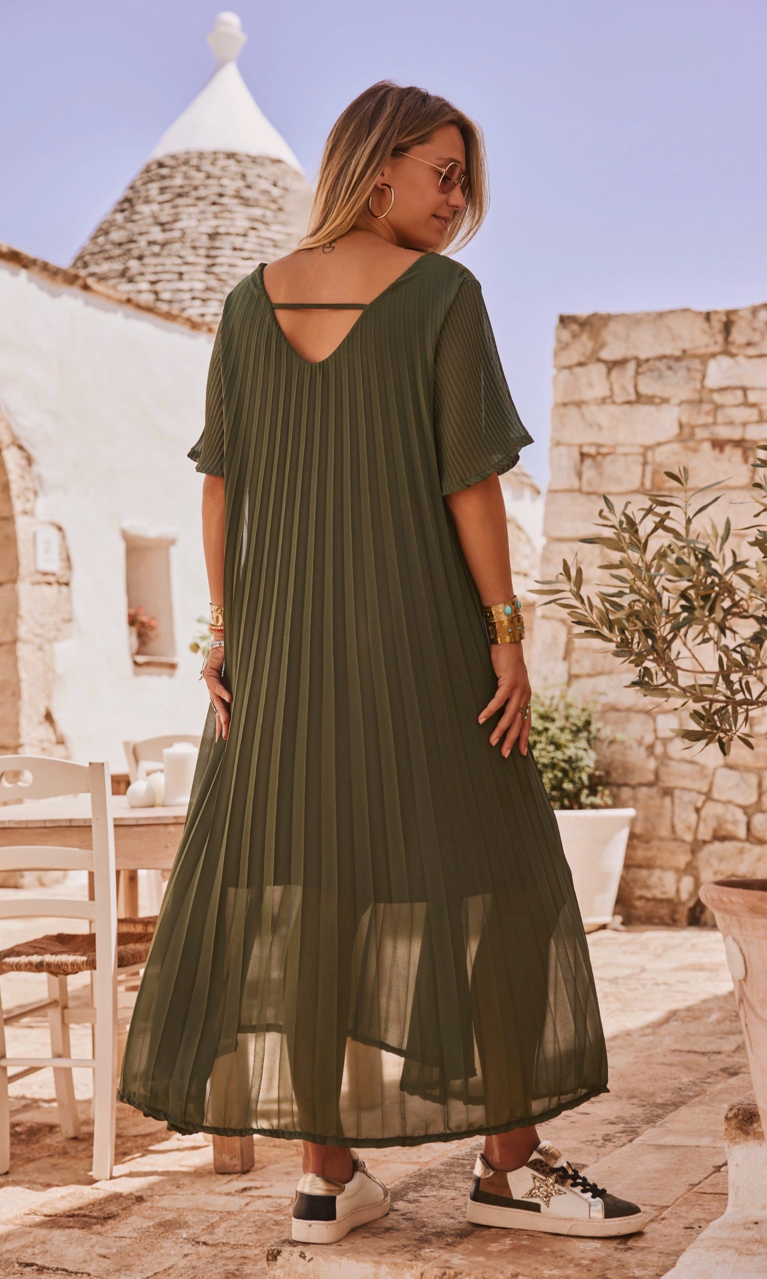 Découvrez cette élégante robe kaki en voile, plissée sur l'ensemble pour un tombé fluide.