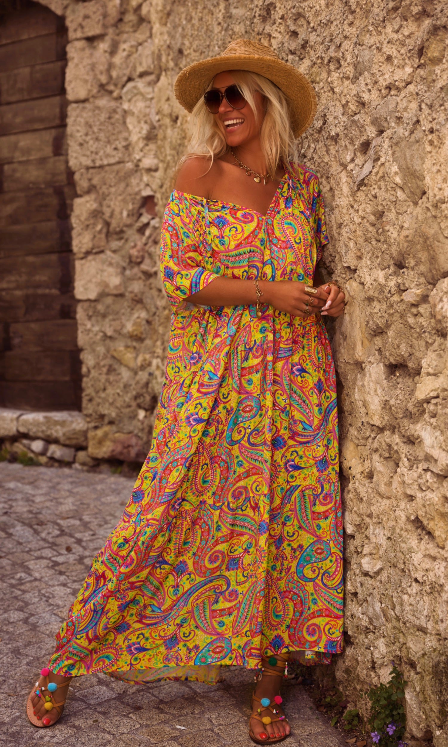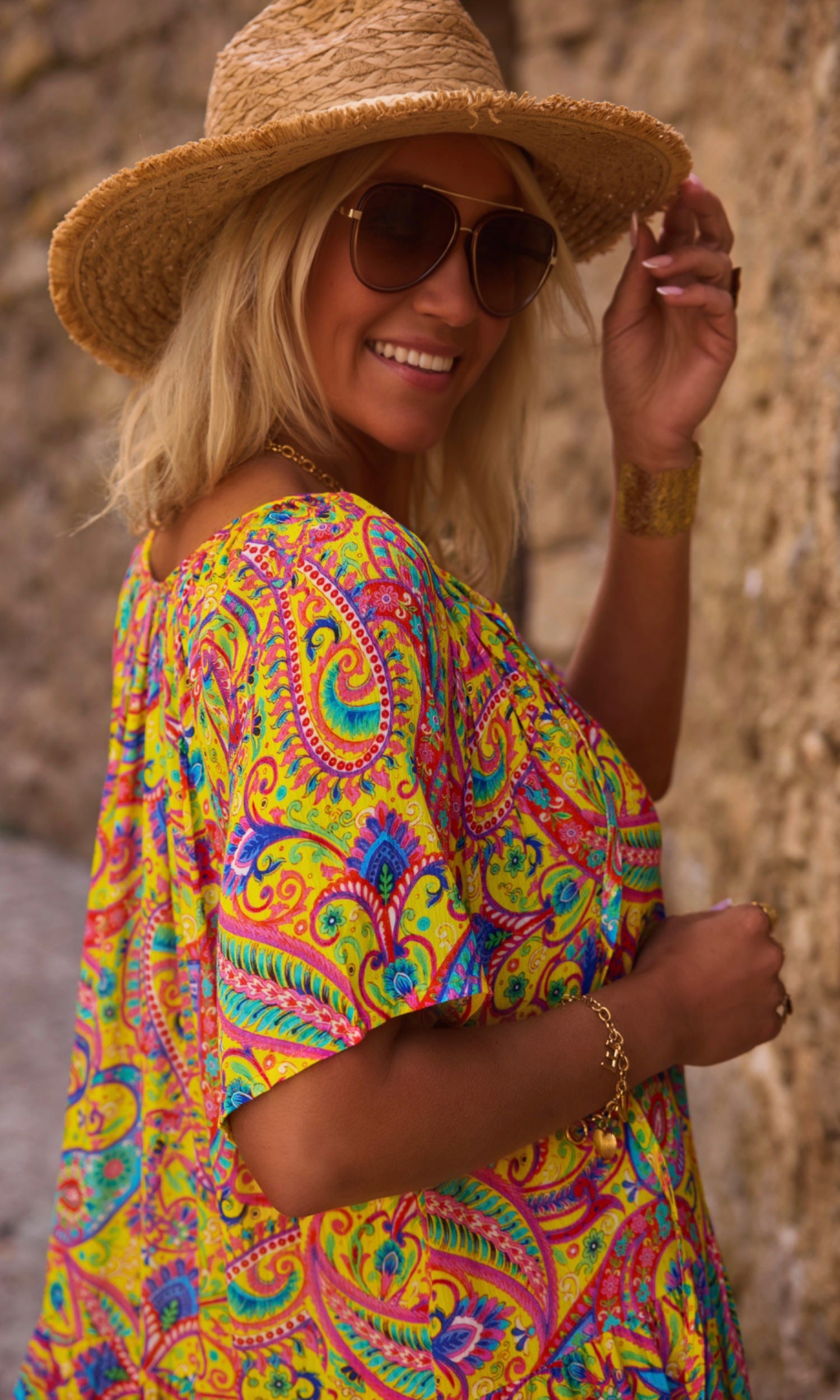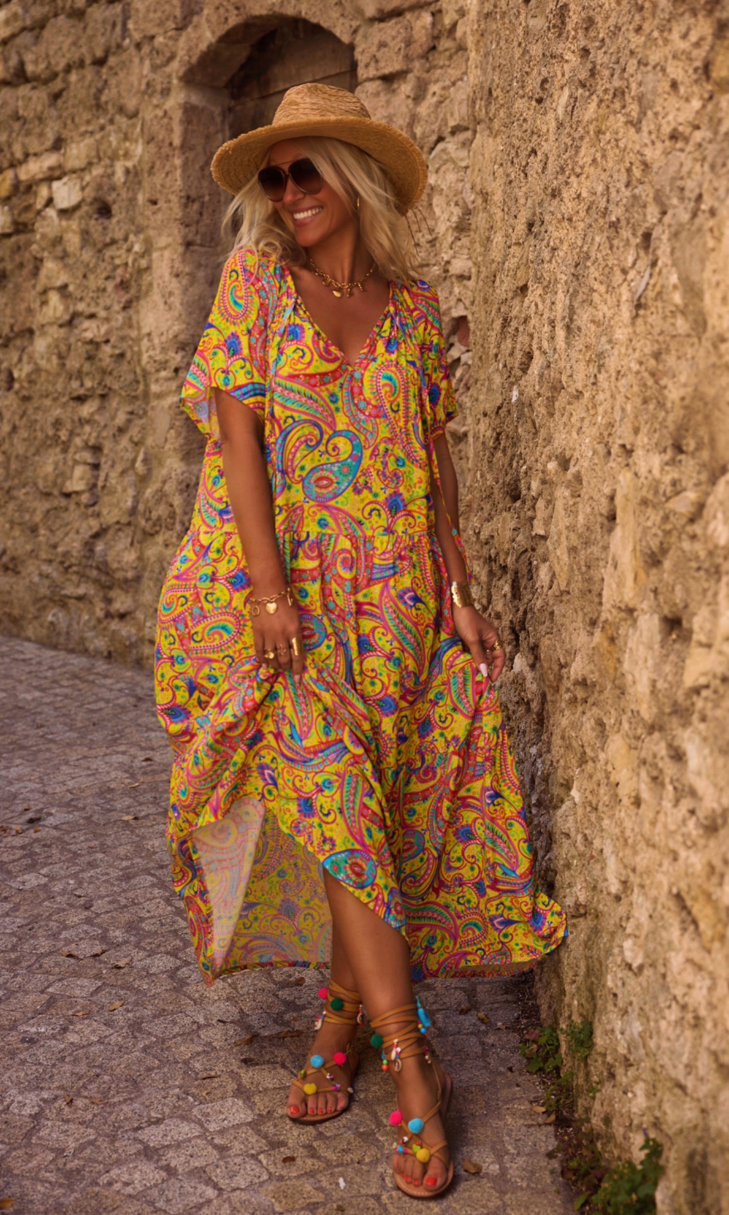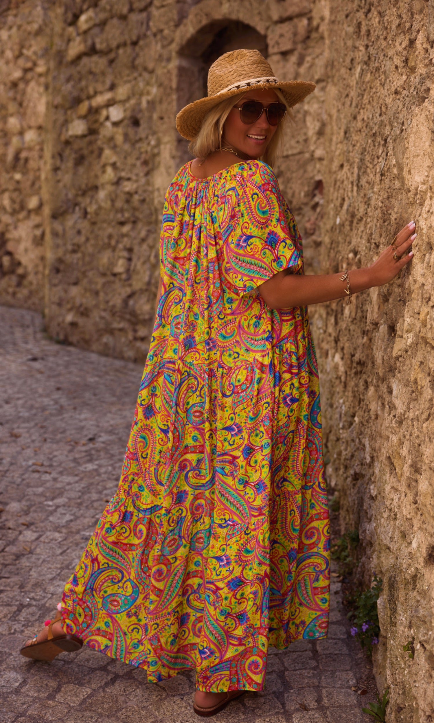 Les grands volants en partie basse apportent légèreté, tandis que le motif cachemire habille l'ensemble.