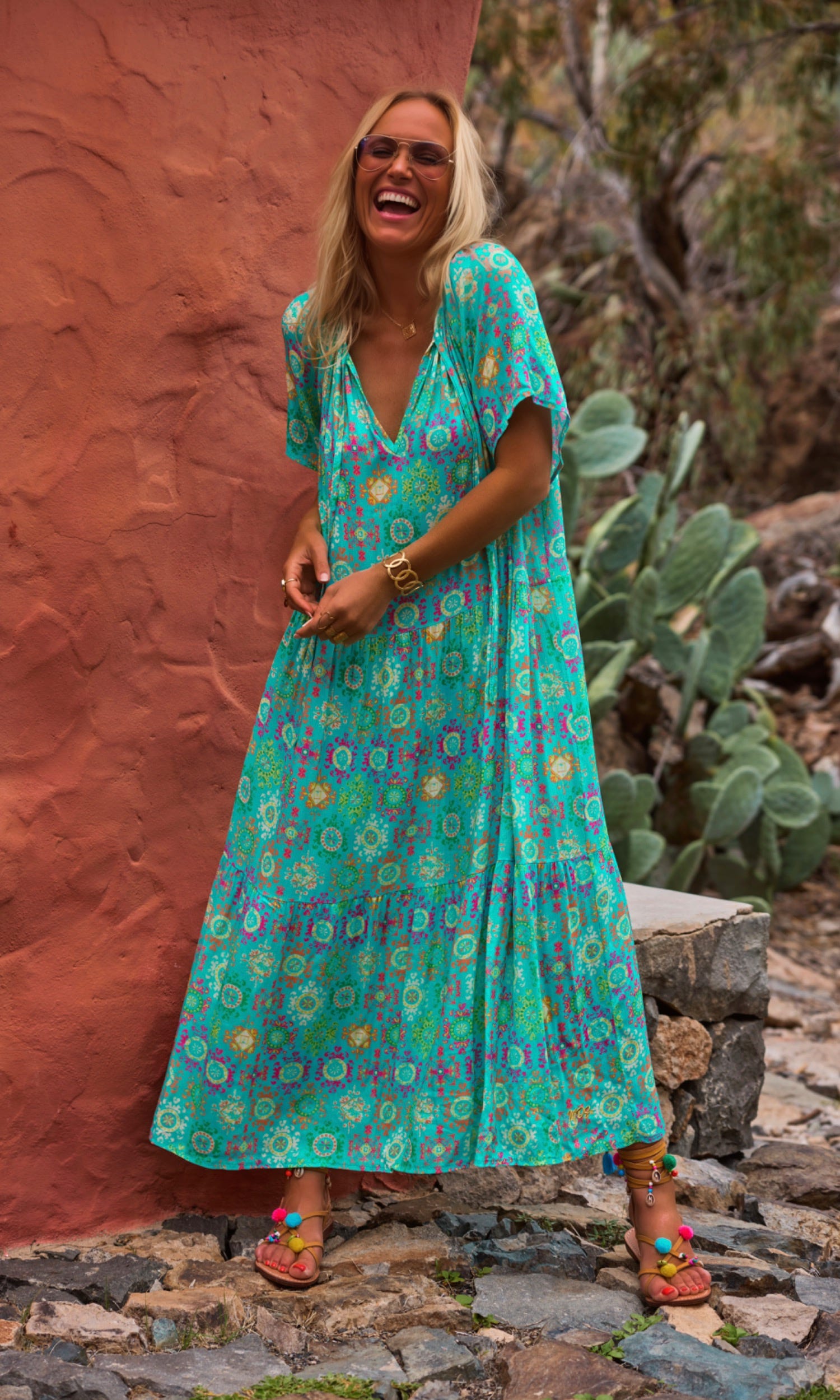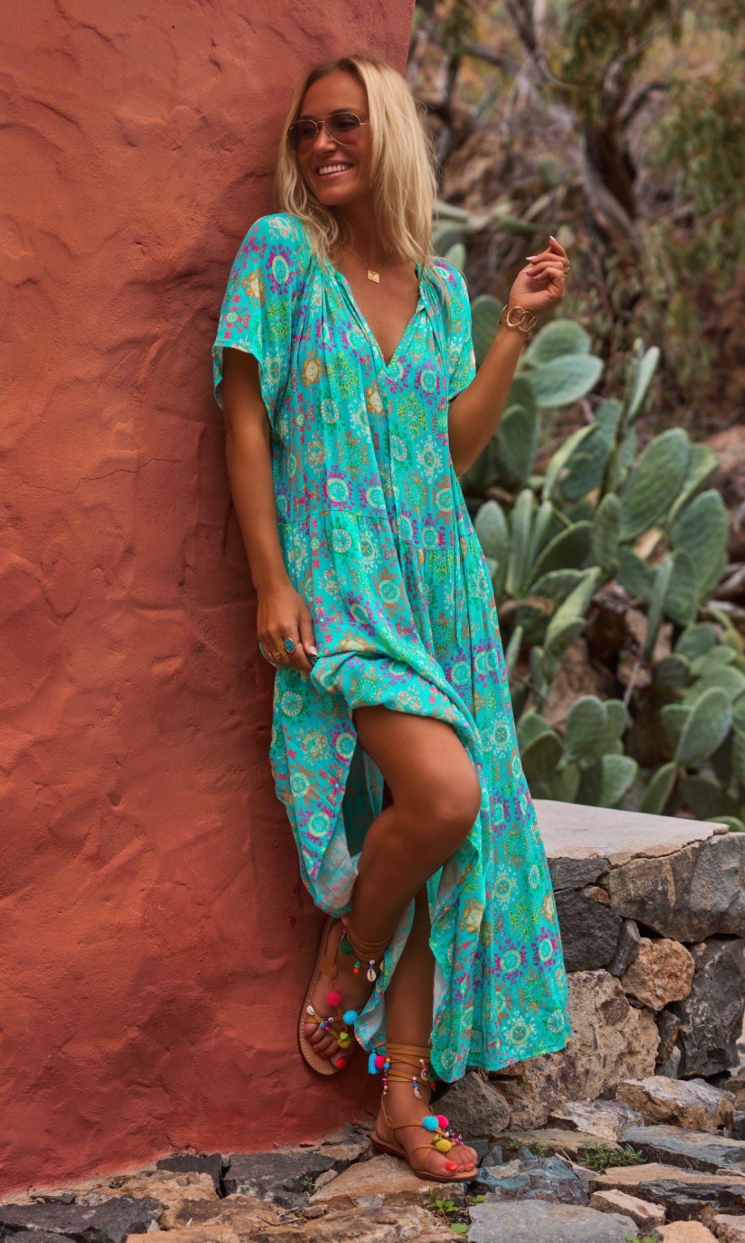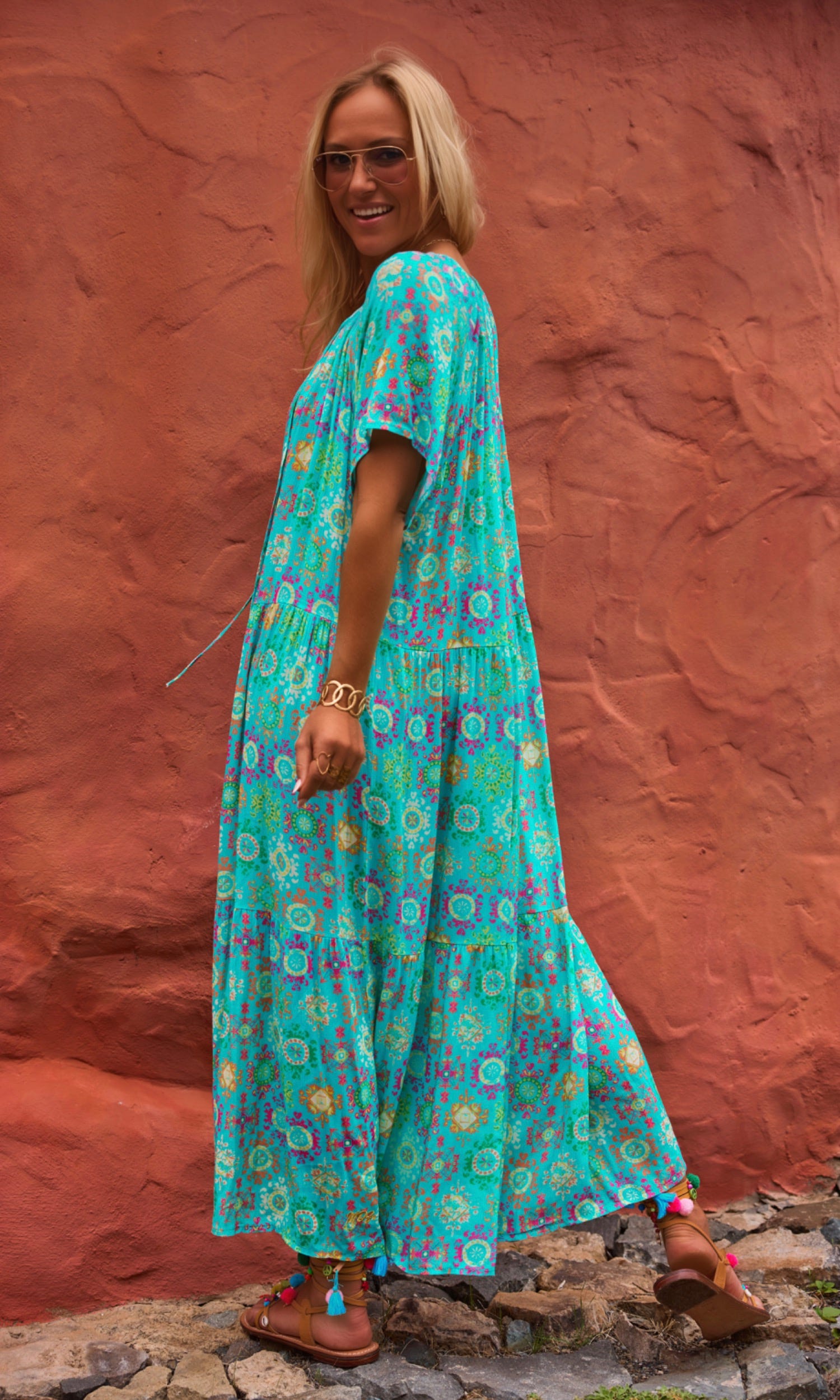 Découvrez cette robe turquoise longue fluide, à la coupe droite et loose, mettant en valeur un col V agrémenté de liens à nouer.