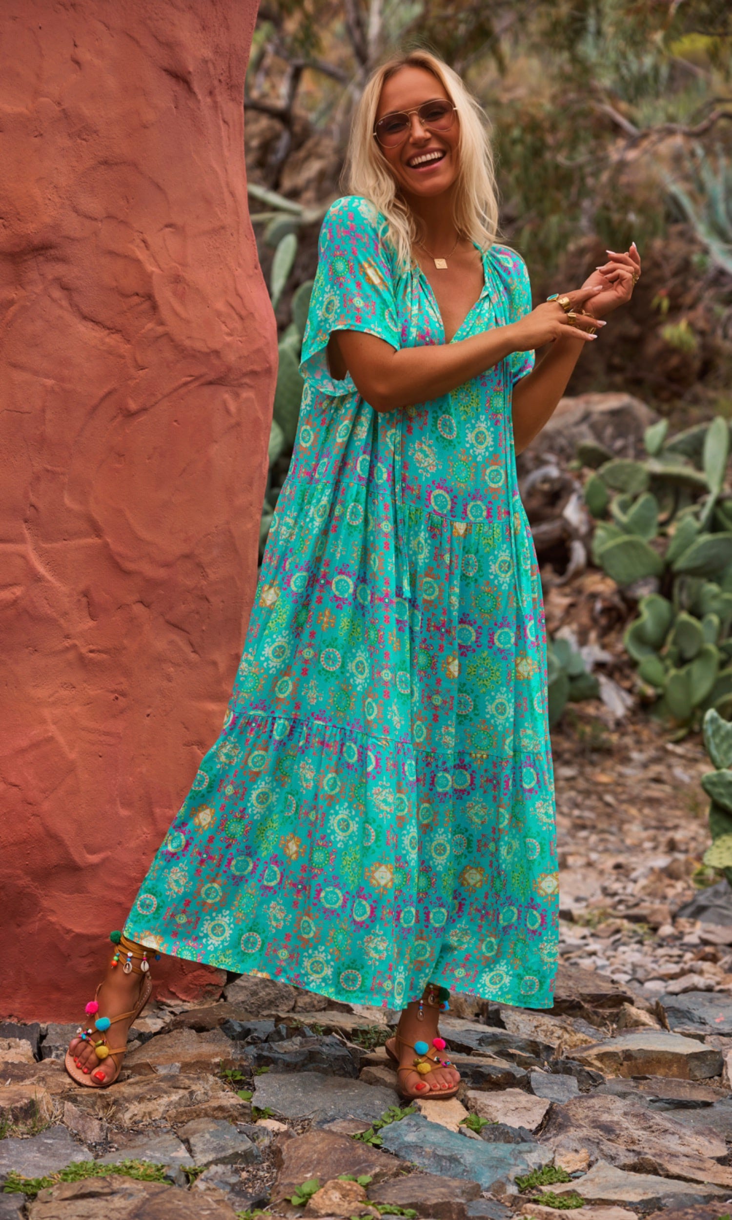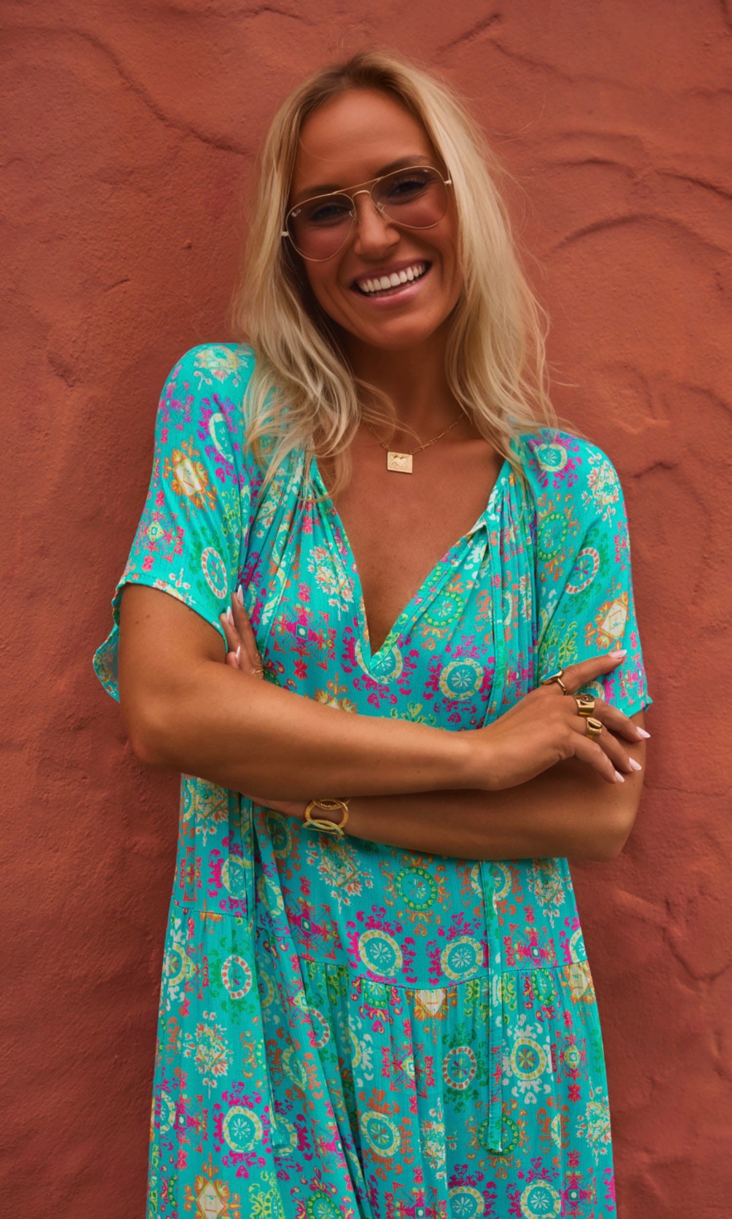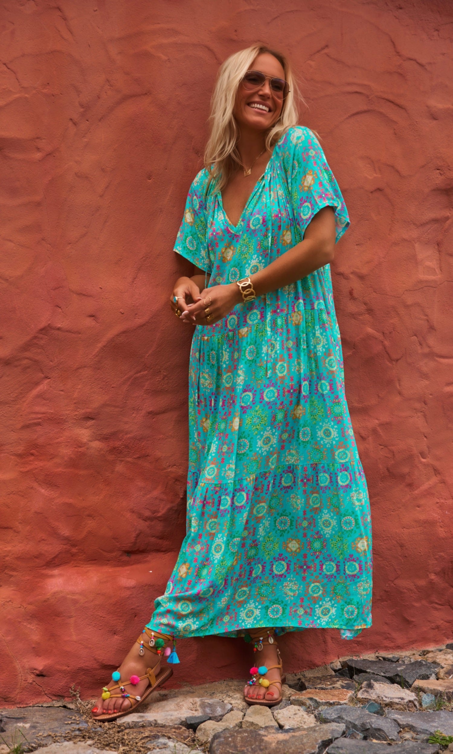 Découvrez cette robe turquoise longue fluide, à la coupe droite et loose, mettant en valeur un col V agrémenté de liens à nouer.