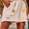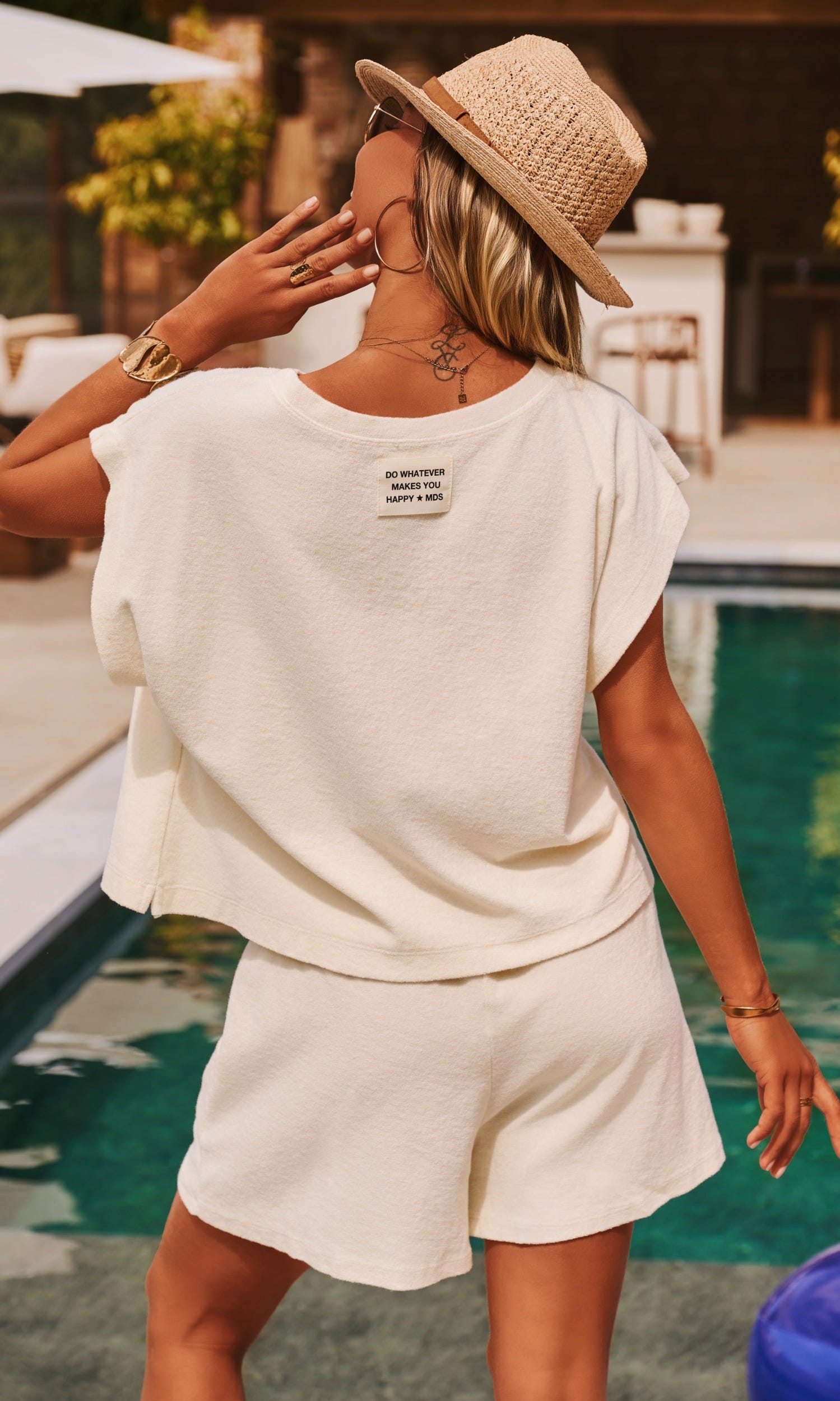 Découvrez notre short vanille en bouclette éponge agrémenté de broderies, alliant confort et style.