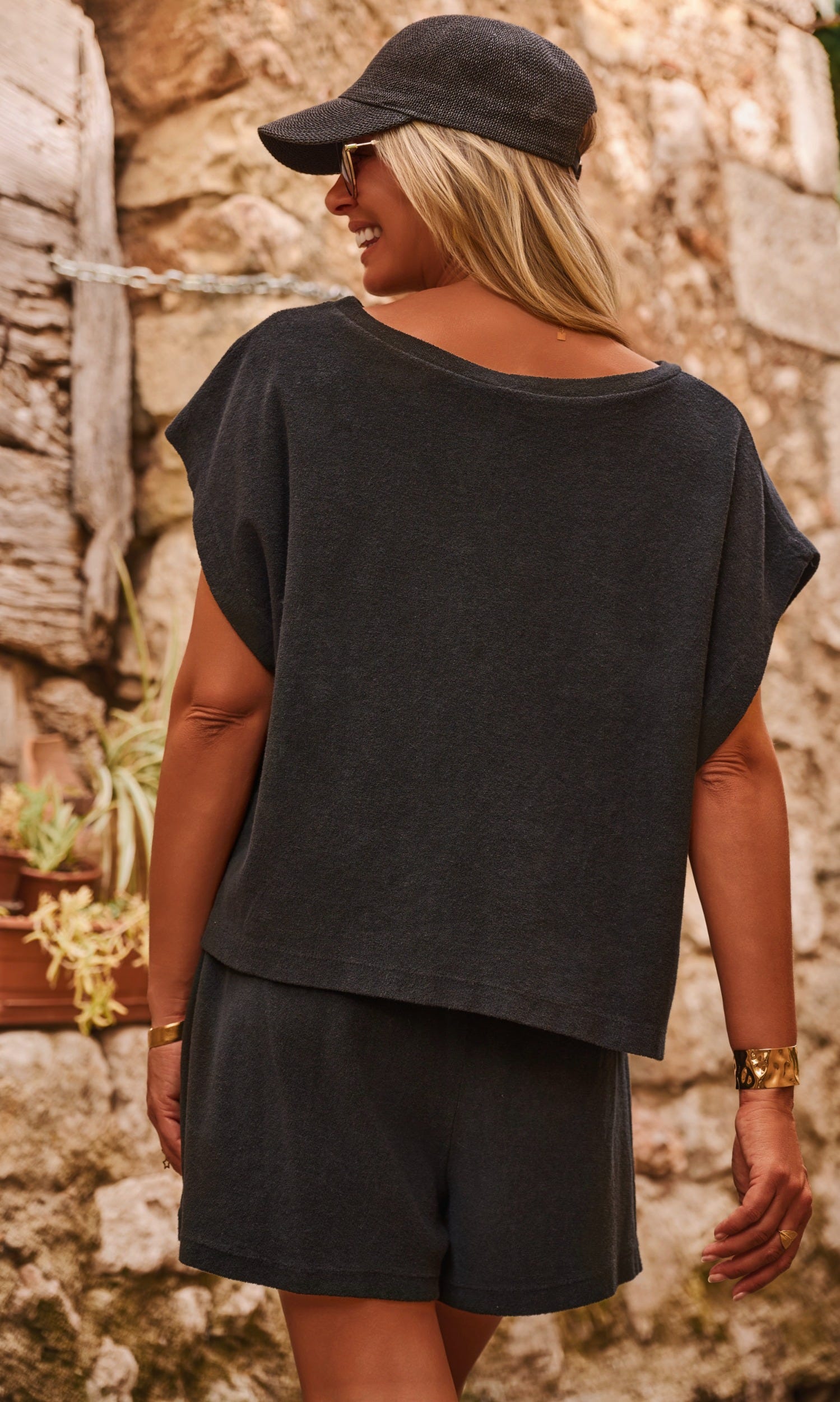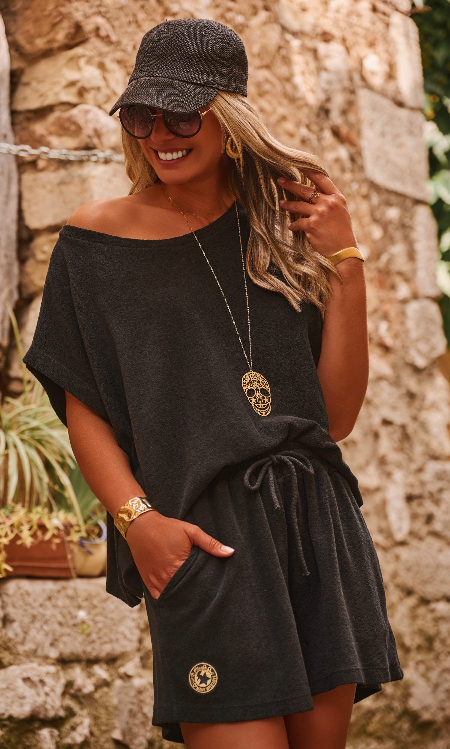 Craquez pour ce short noir en bouclette éponge, à la fois confortable et tendance.