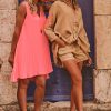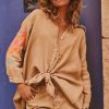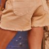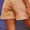 Découvrez ce short à revers au style décontracté de couleur camel, doté de passants à la taille et d'une fermeture à boutons apparente finie par des bords frangés.