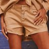Découvrez ce short à revers au style décontracté de couleur camel, doté de passants à la taille et d'une fermeture à boutons apparente finie par des bords frangés.