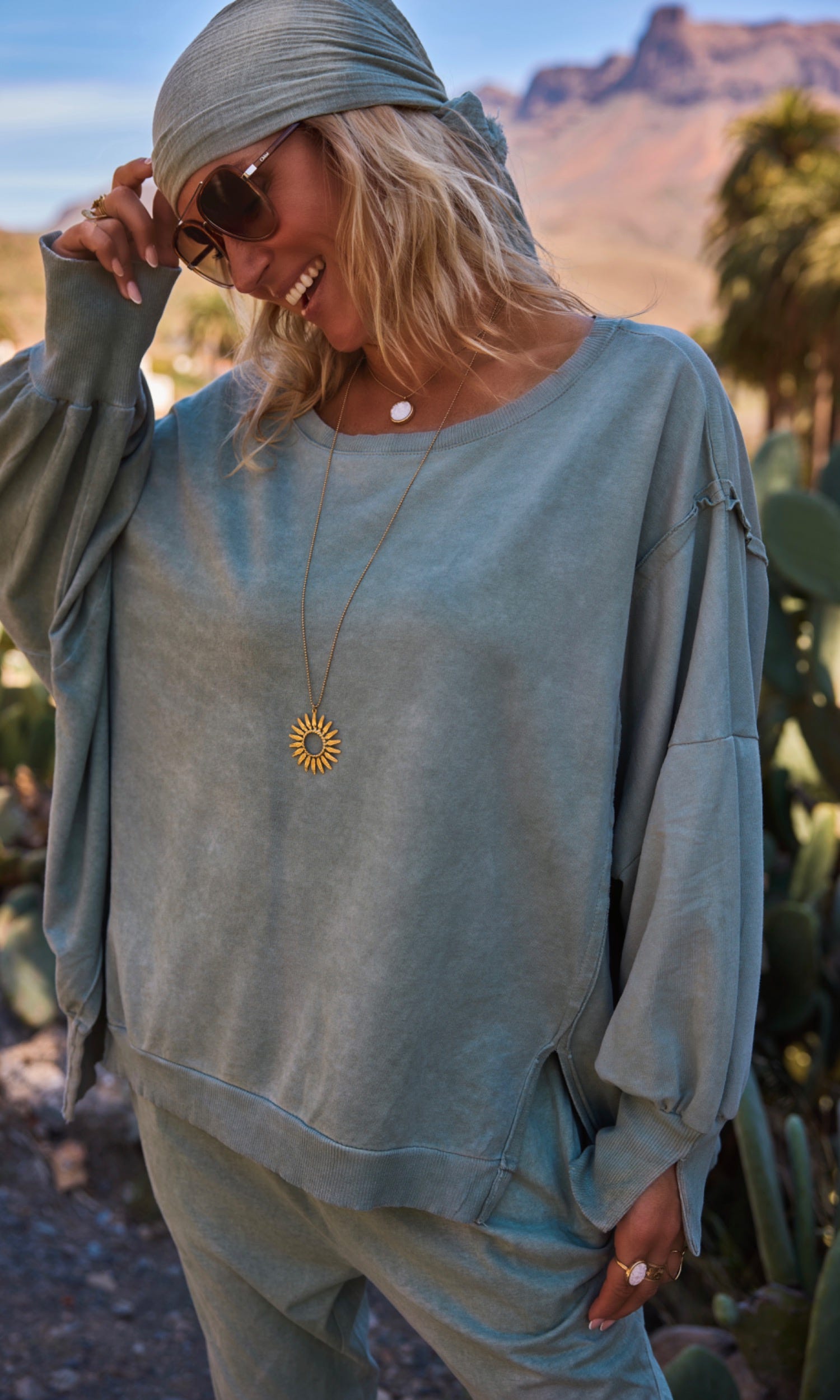 Ses manches longues bouffantes avec emmanchures tombantes ajoutent une touche tendance, tandis que les poignets côtelés avec fendu accentuent le confort