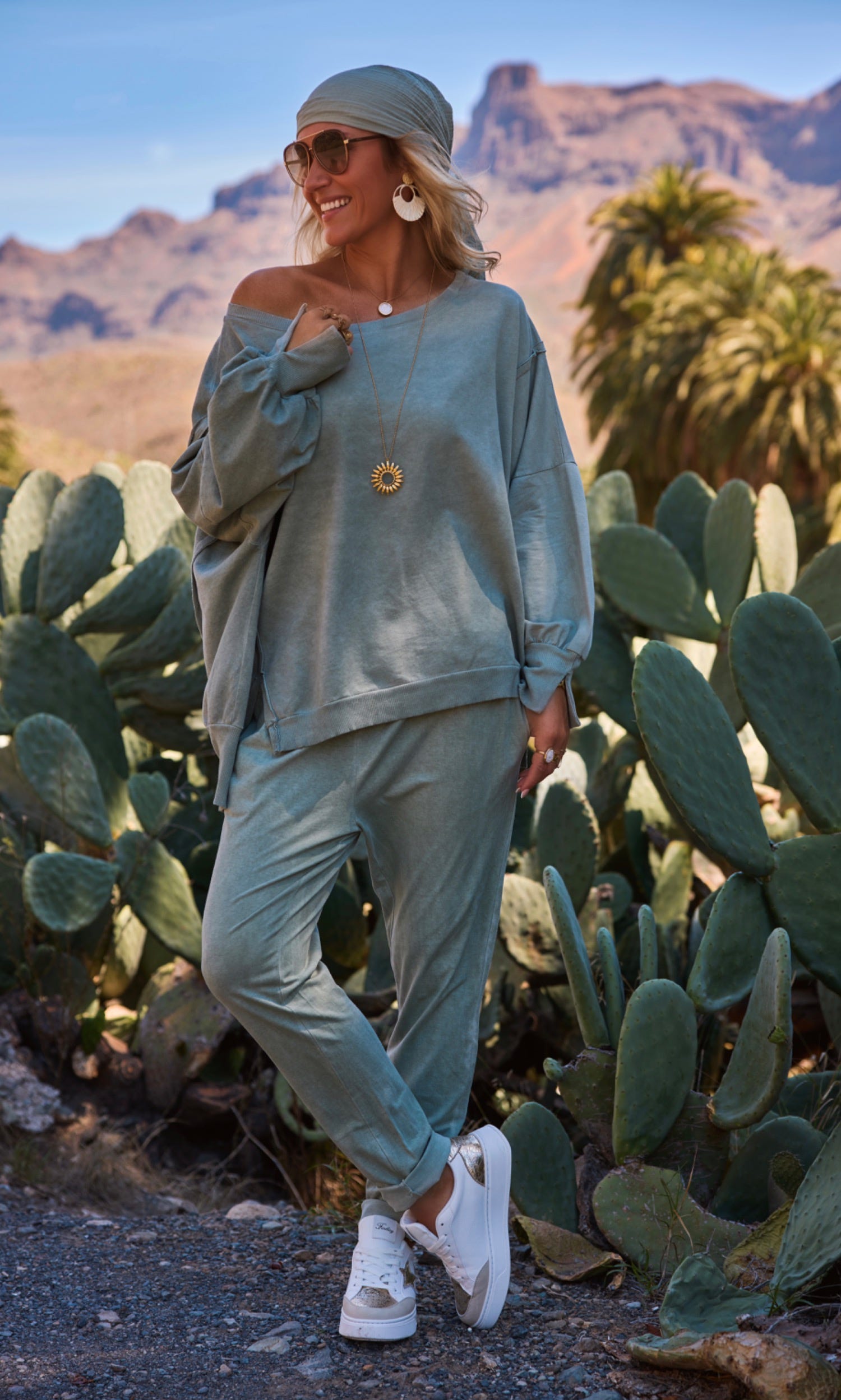 Ce sweat kaki clair au style décontracté arbore une coupe loose et un col bateau