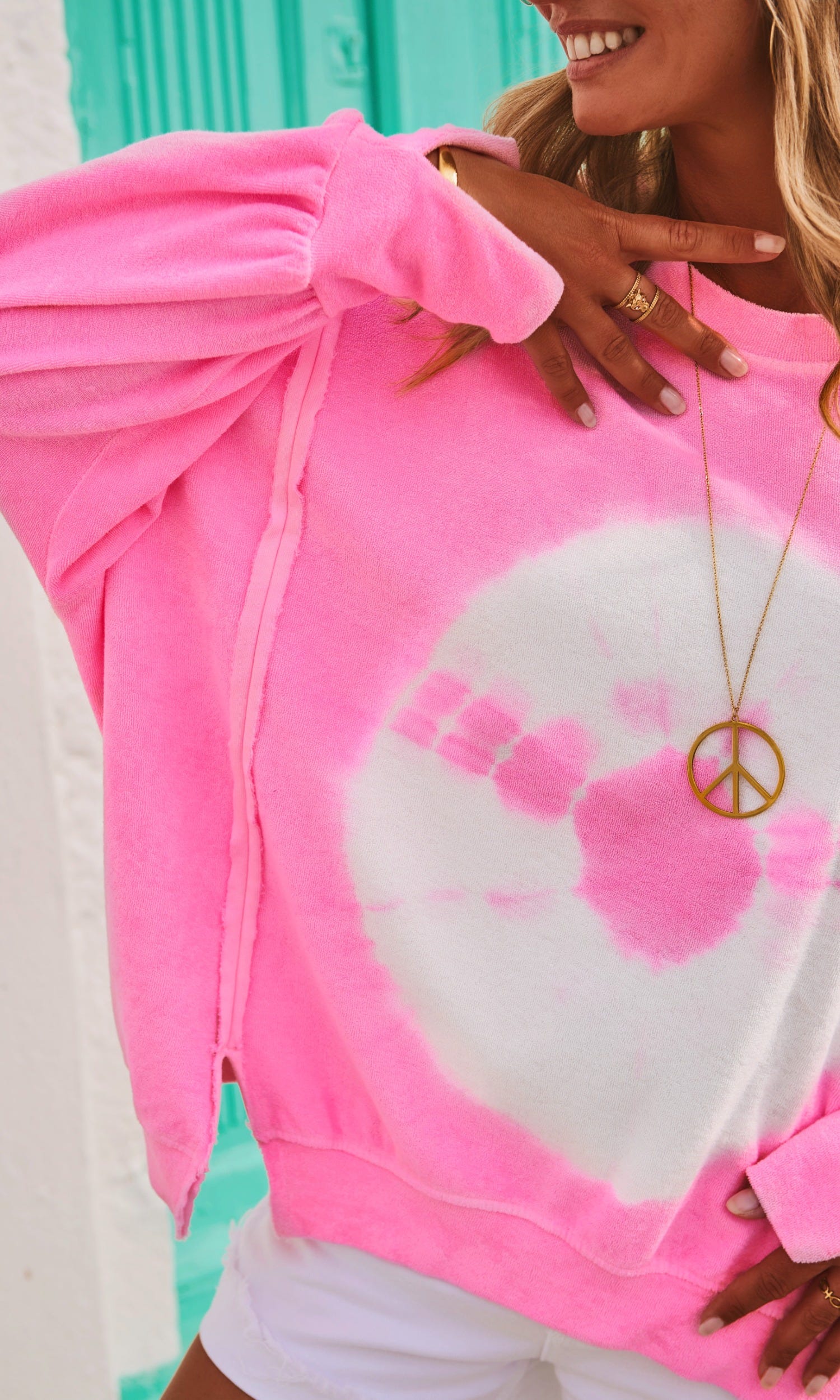 Avec des découpes à finition bord franc et un motif tie and dye tendance, il est plus court sur le devant et doté d'un large bord côtelé aux poignets.
