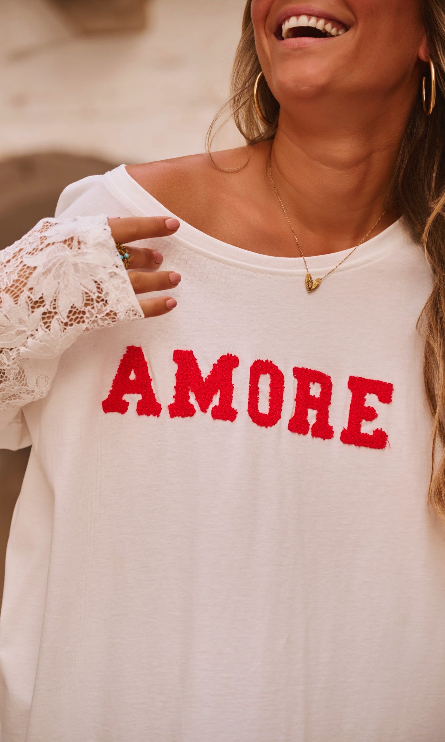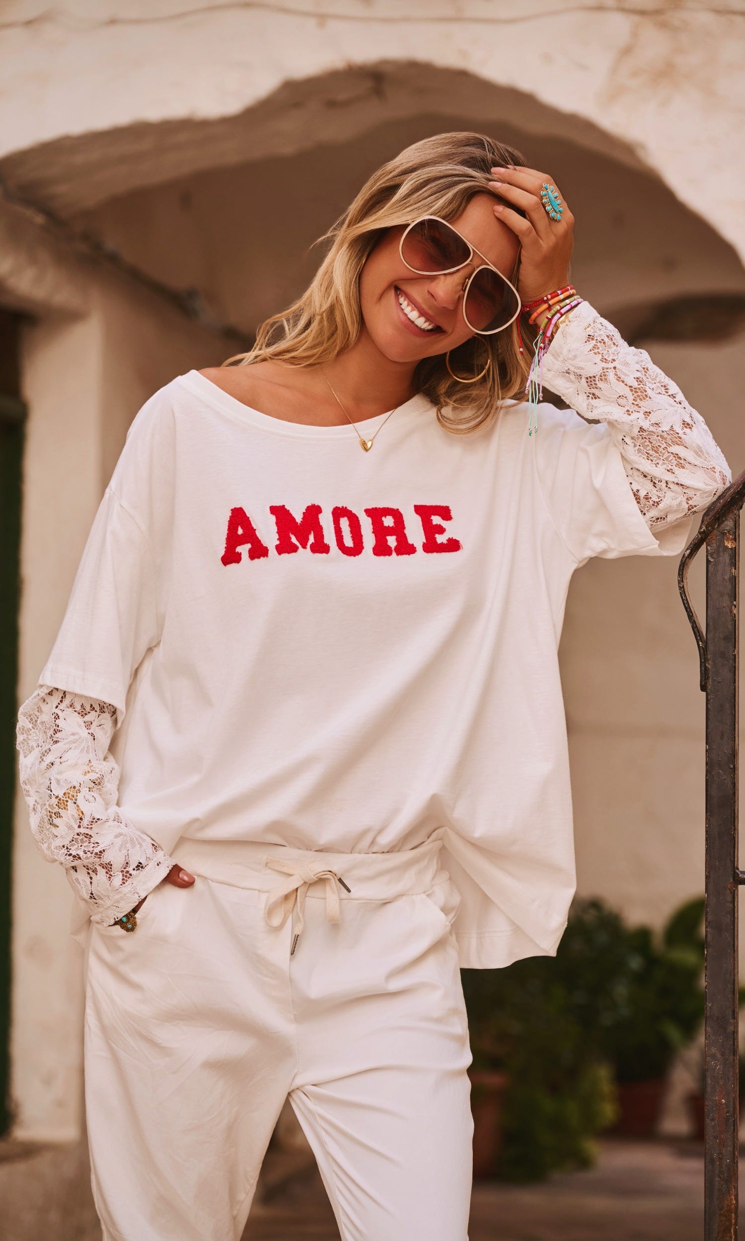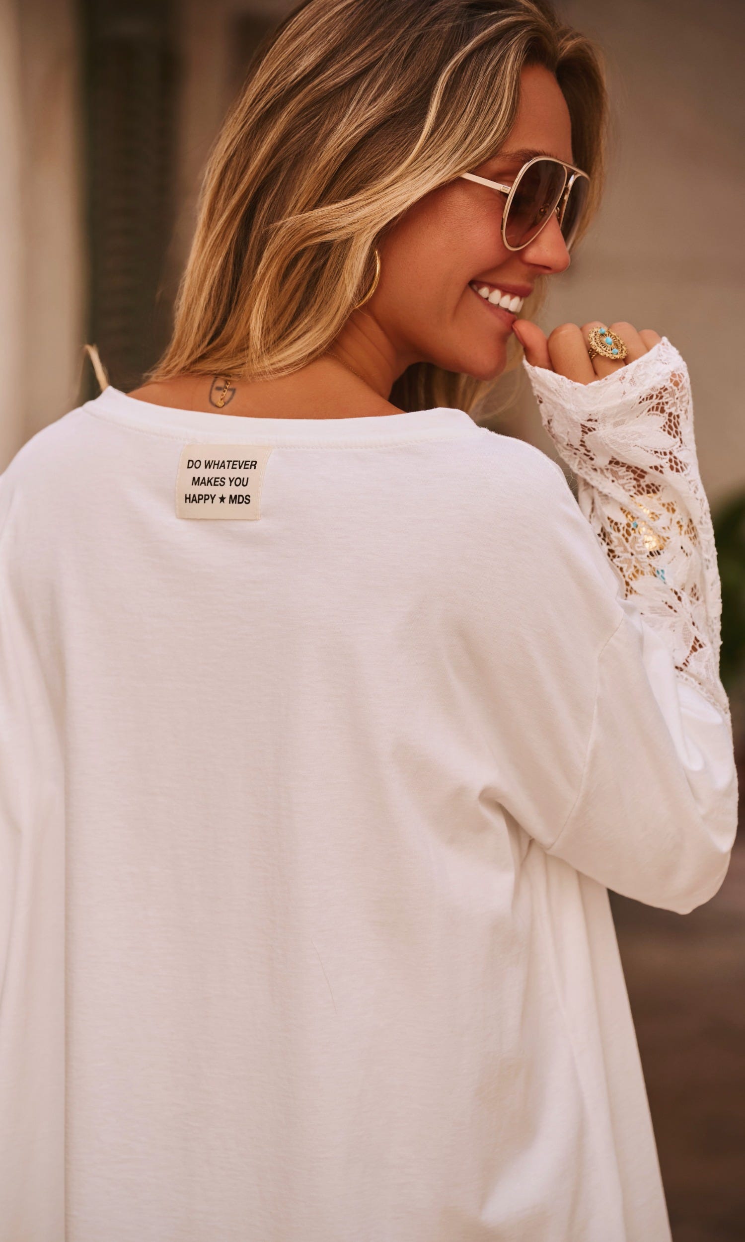 Découvrez notre sweat blanc oversize au col rond et aux manches longues, sublimé par une délicate finition dentelle.