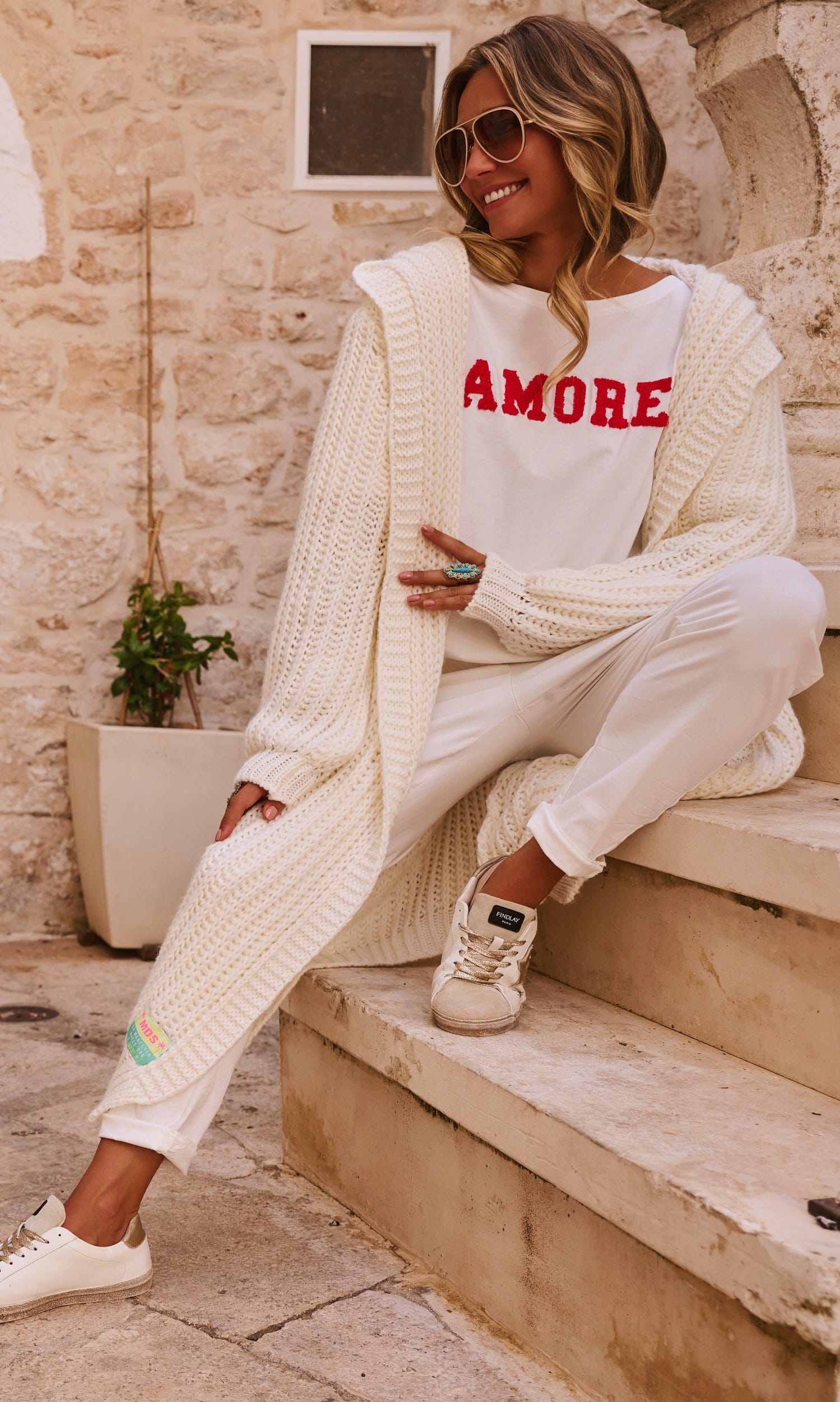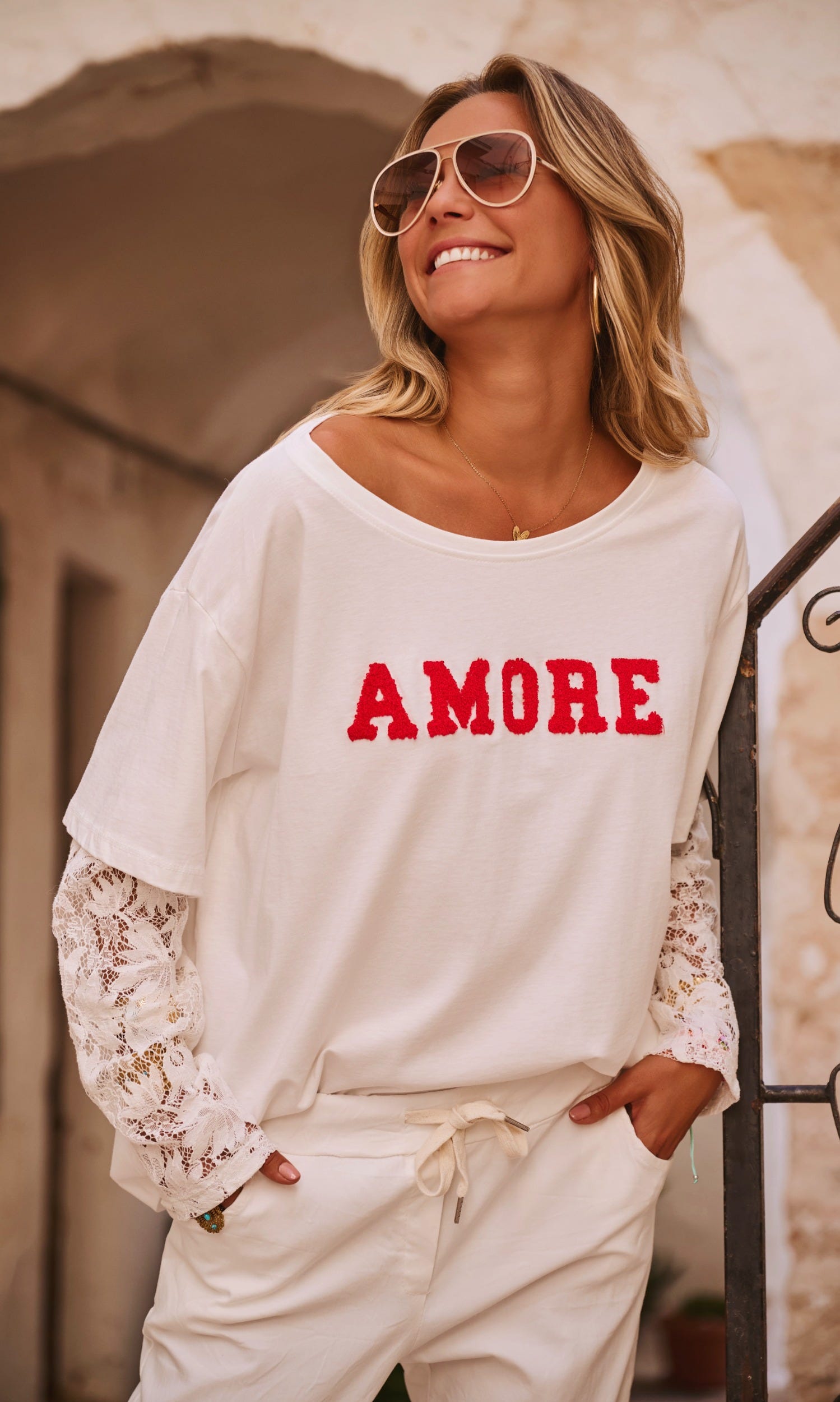 Son imprimé moumoutte Amore rouge apporte une touche tendance et chaleureuse.