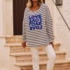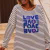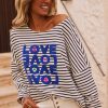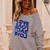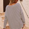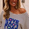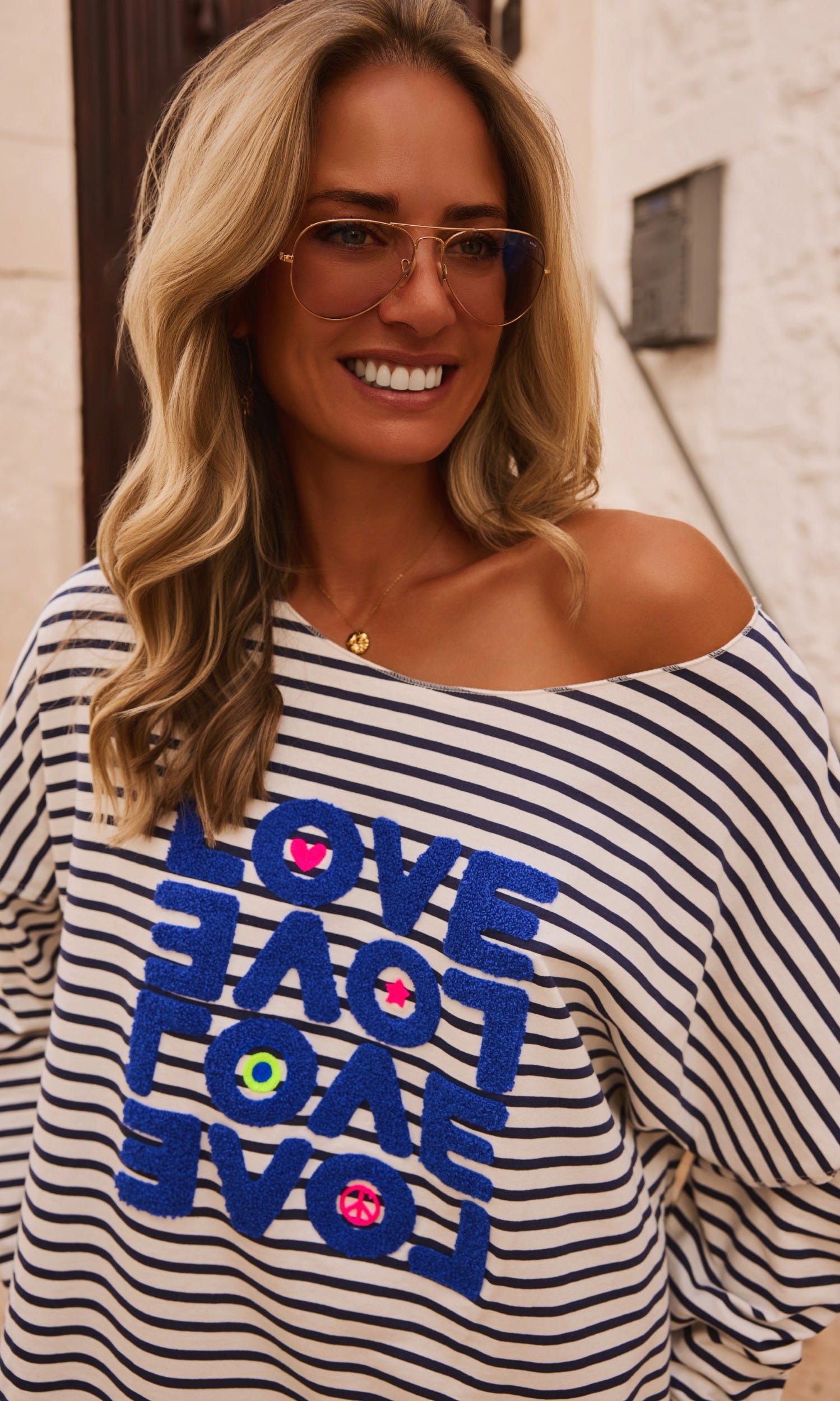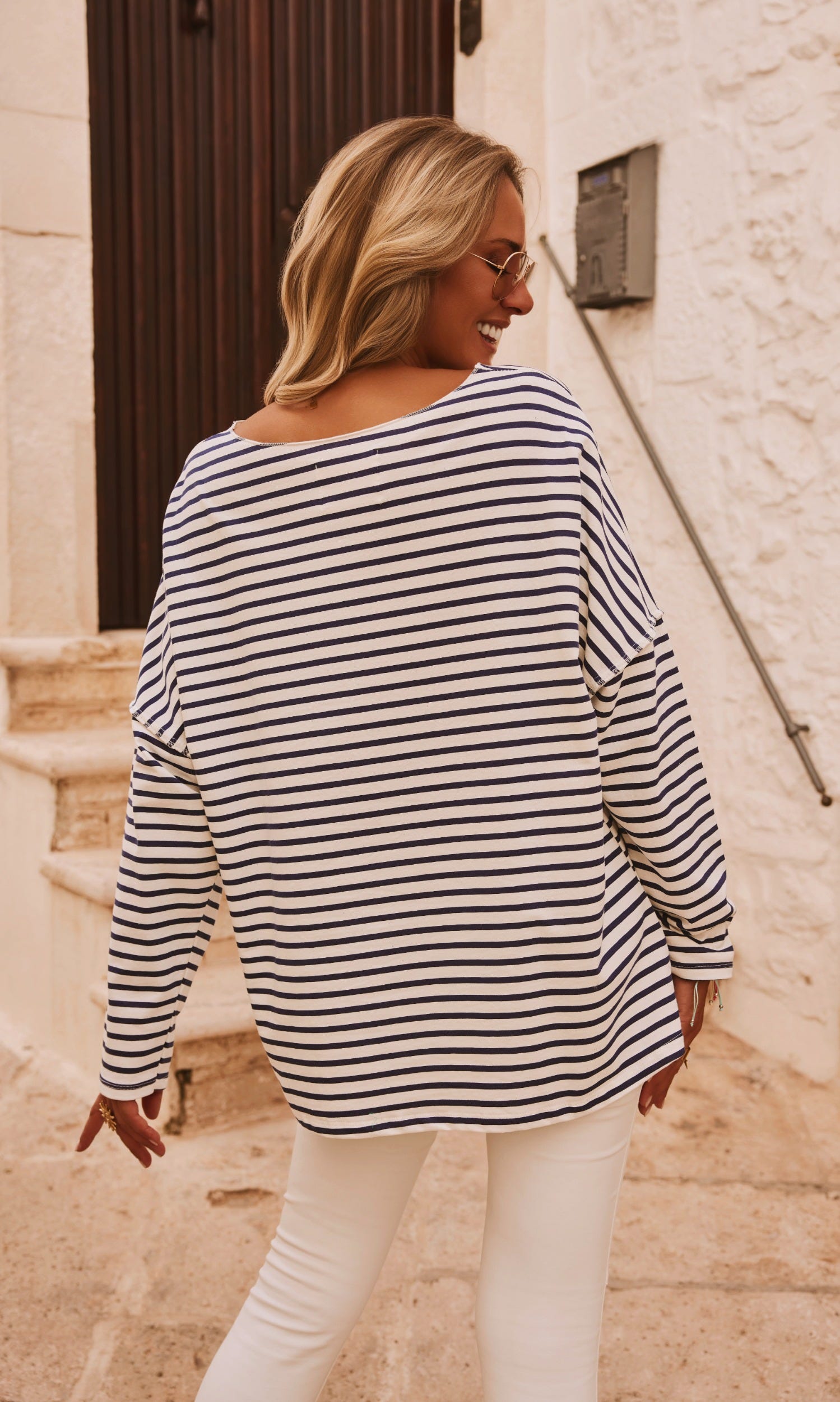 Ce sweat blanc marinière à la coupe droite met en avant un col bateau élégant et des manches longues accentuées de surpiqûres.