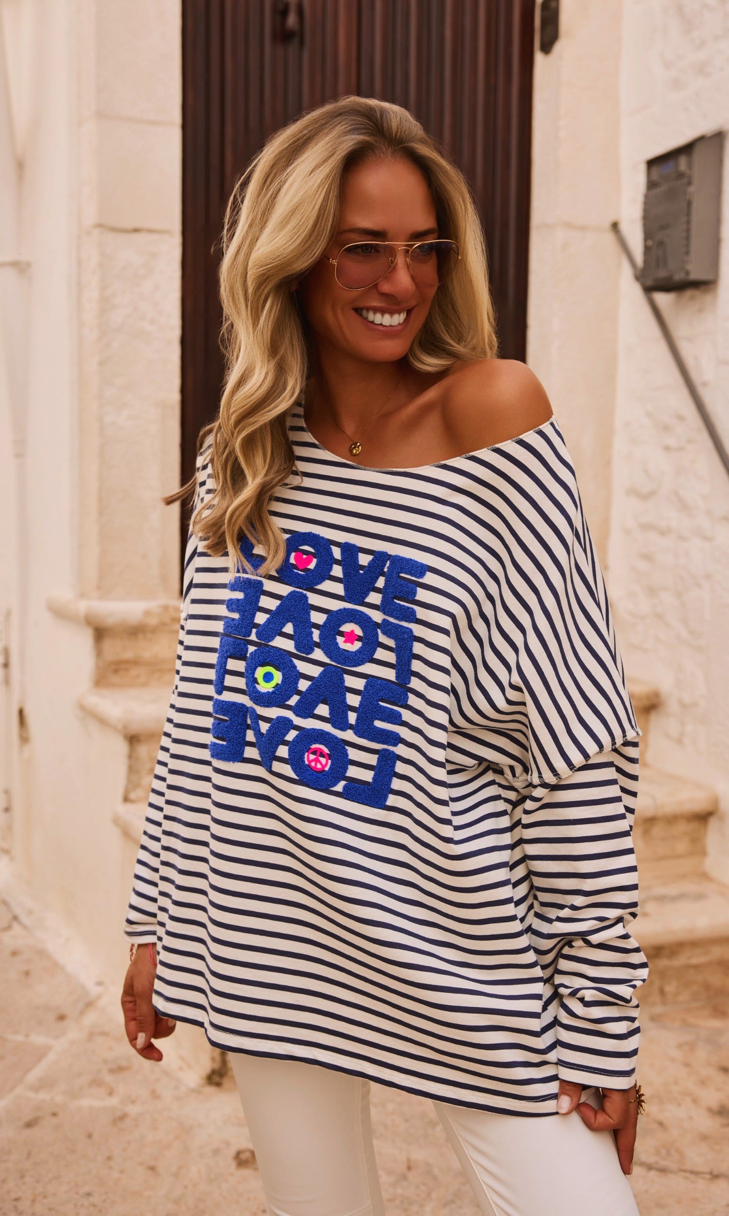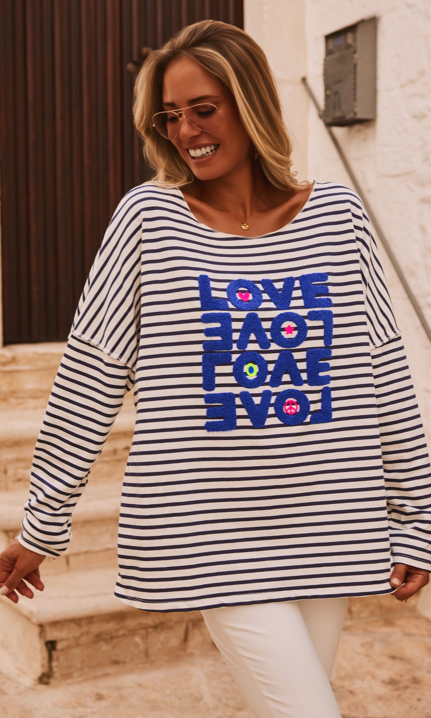 L'inscription "Love" bleu apporte une touche girly et chaleureuse.