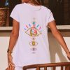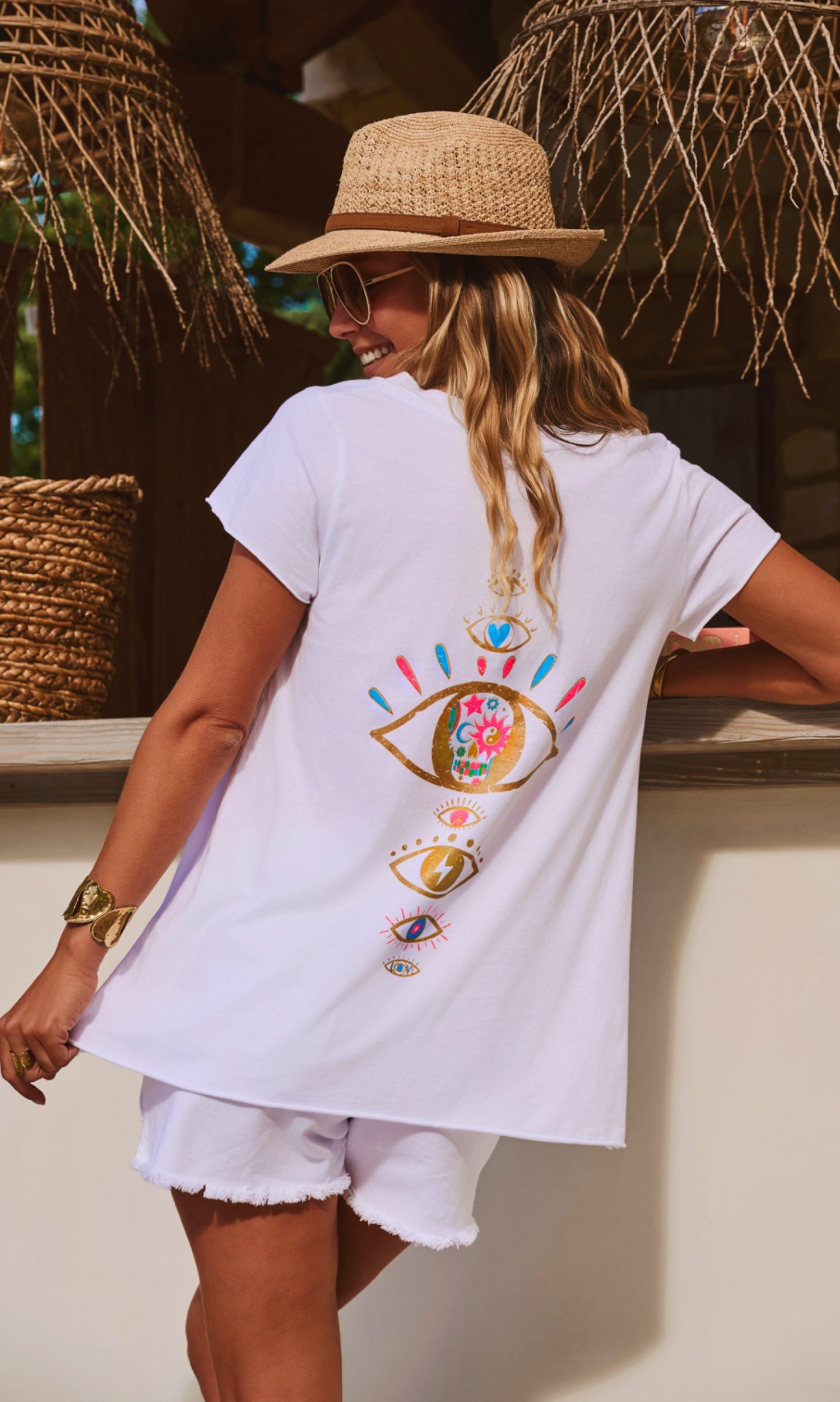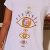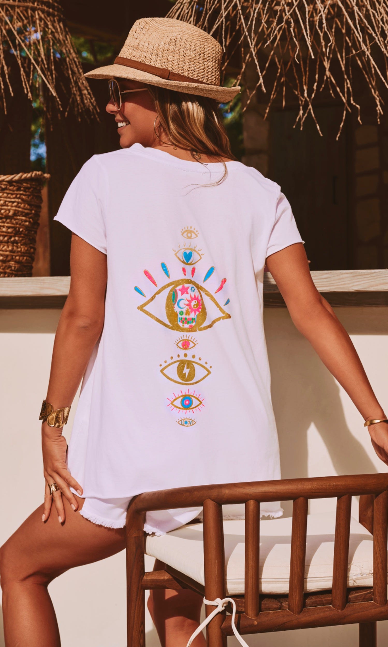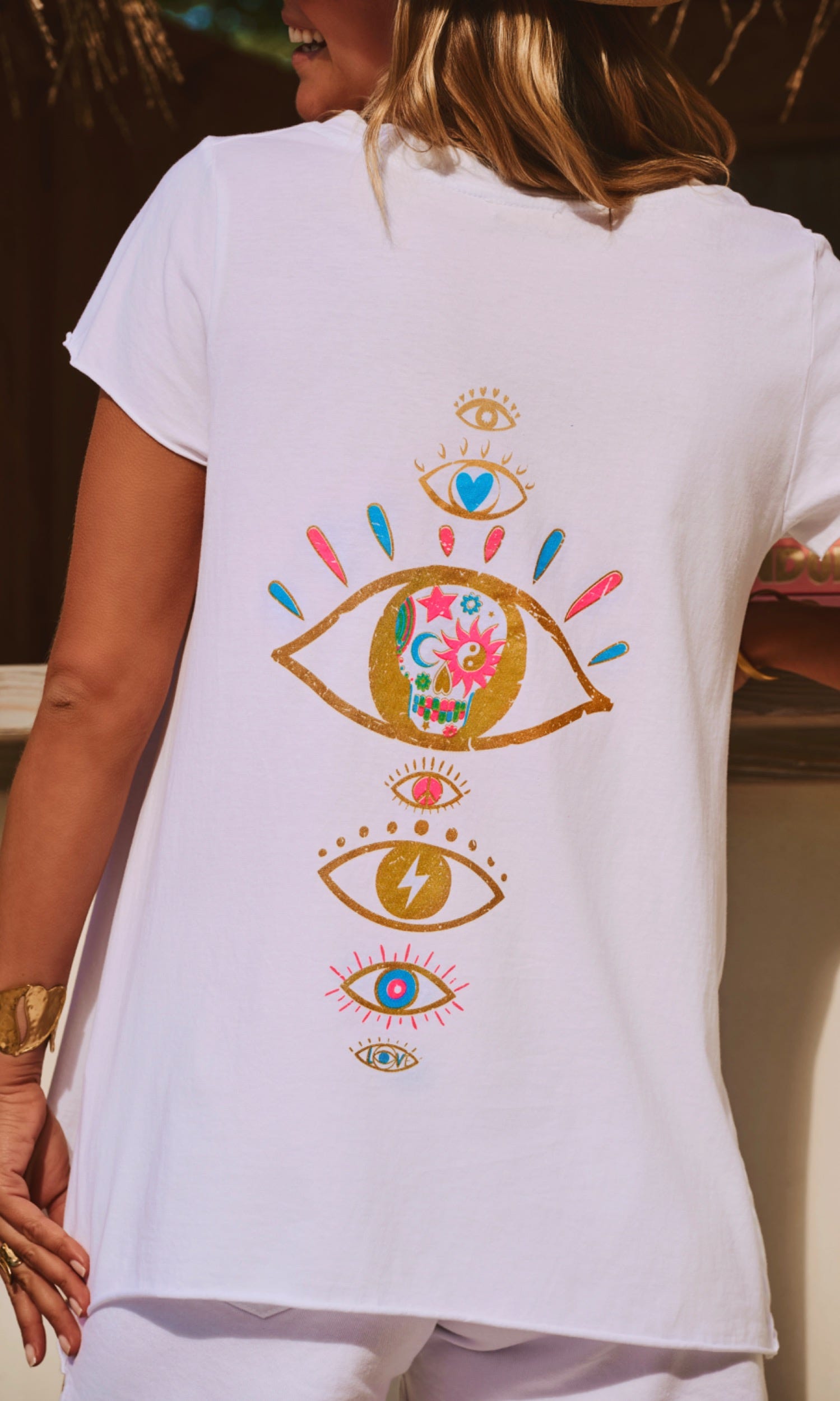 Son col V généreux et ses manches courtes apportent une touche féminine, tandis que l’imprimé Many Eyes au dos offre originalité.