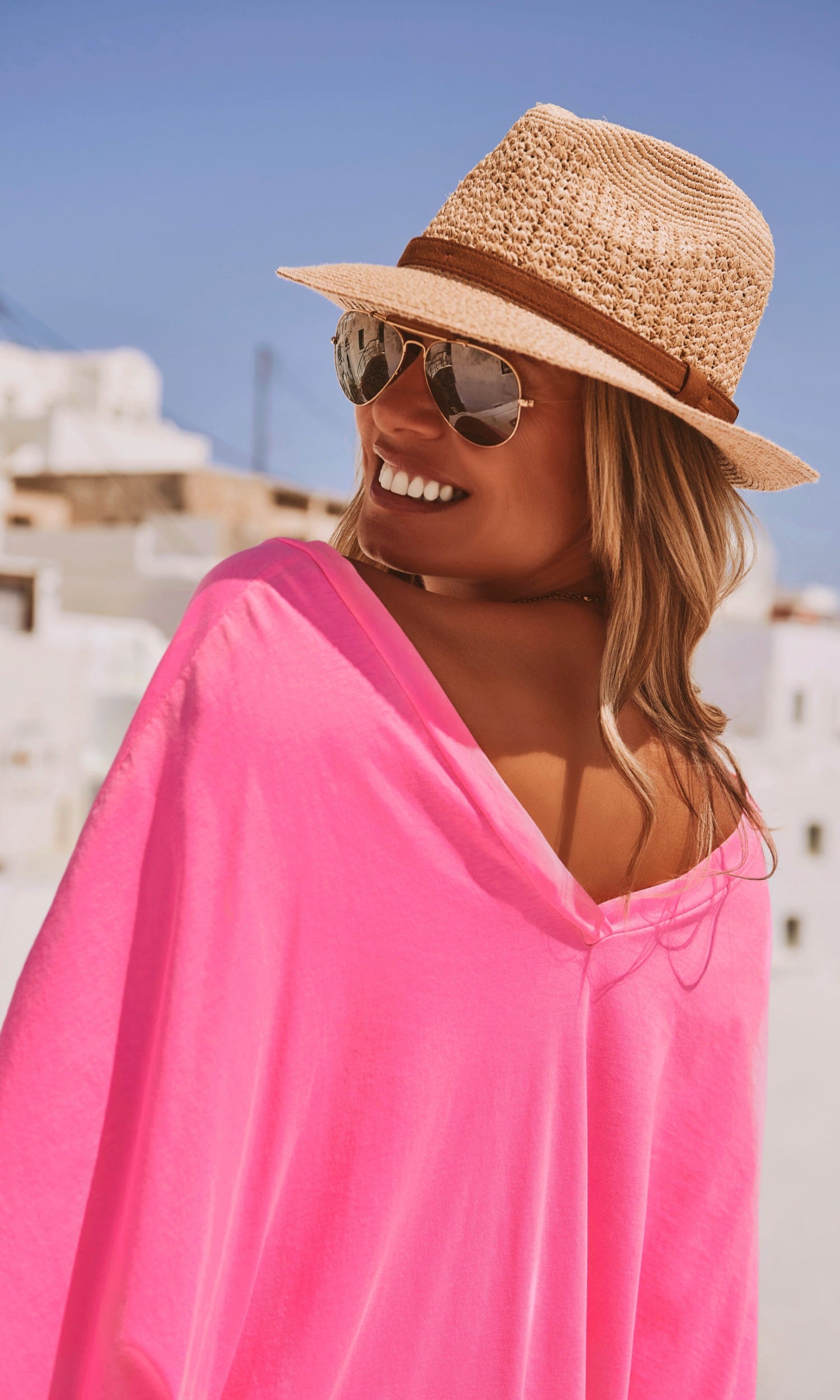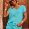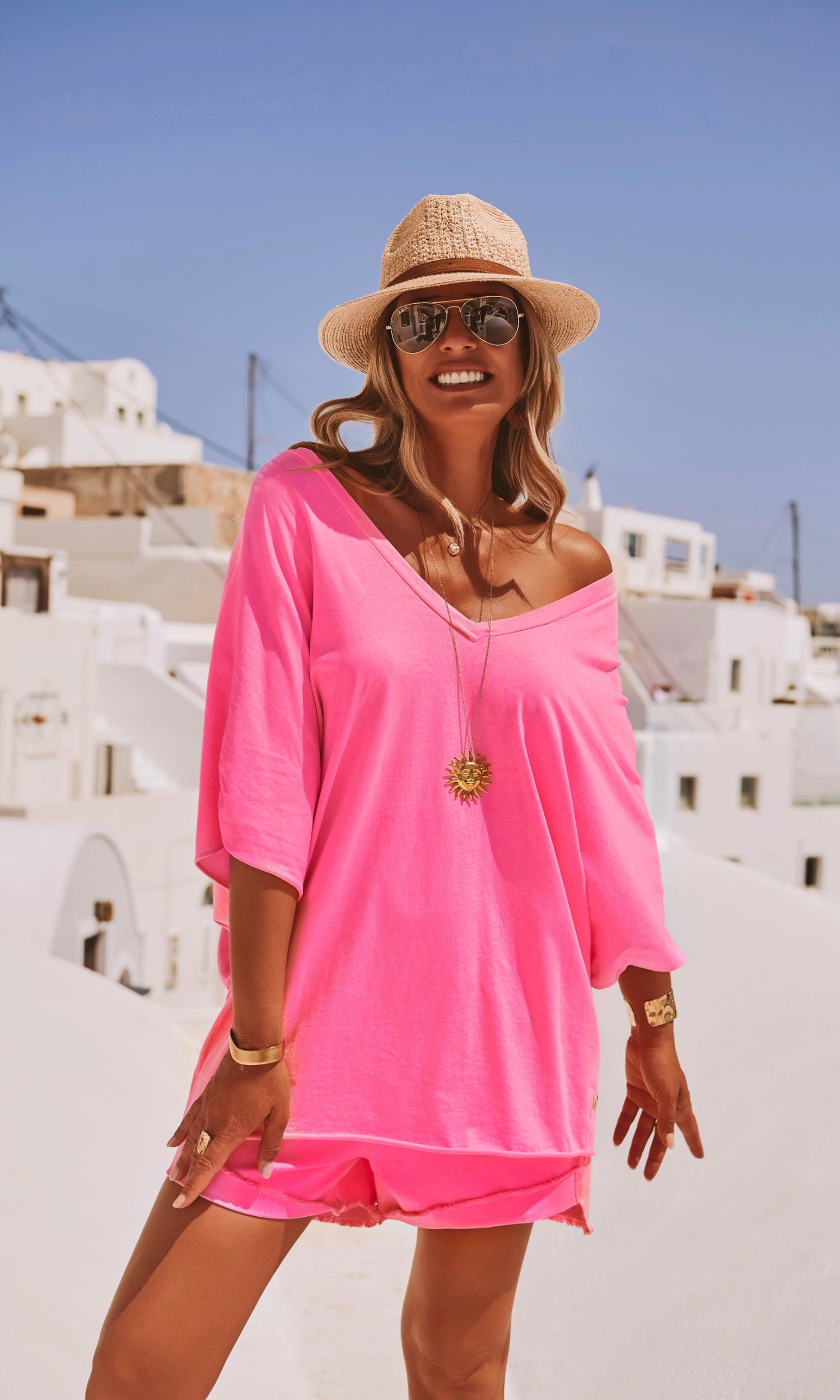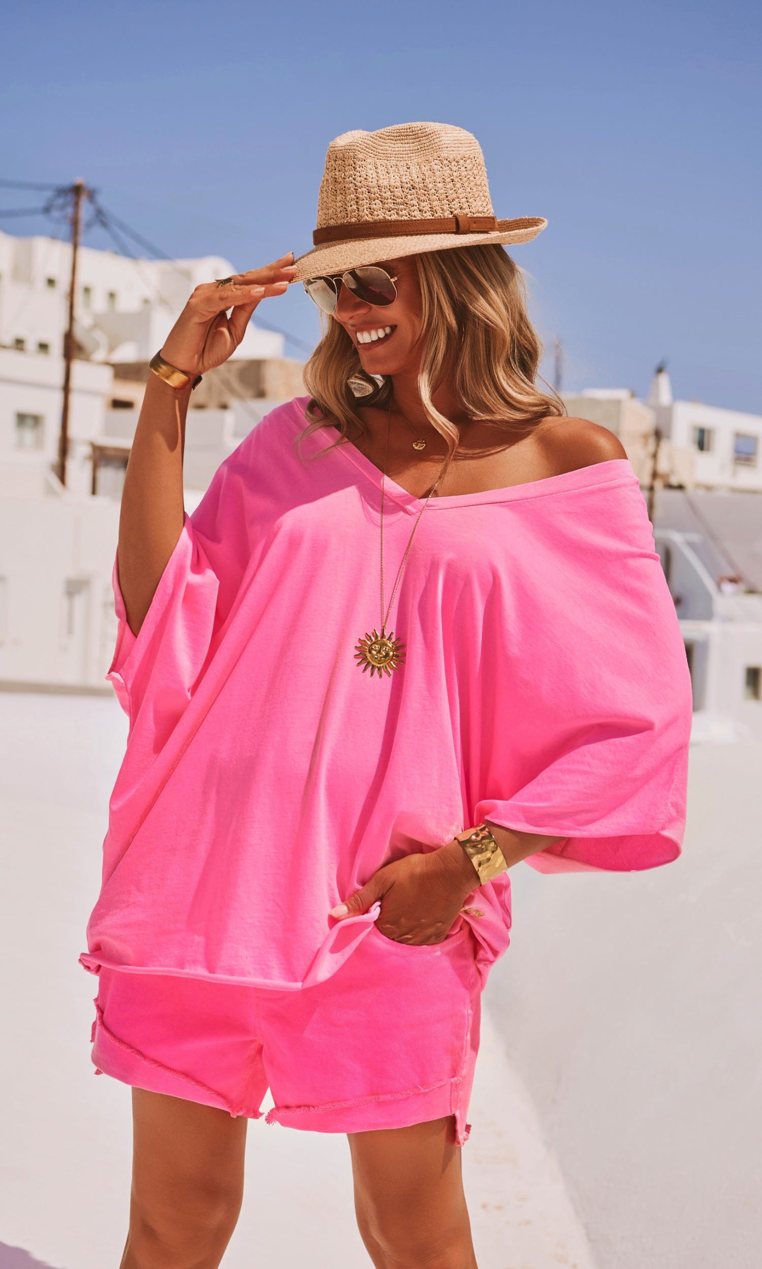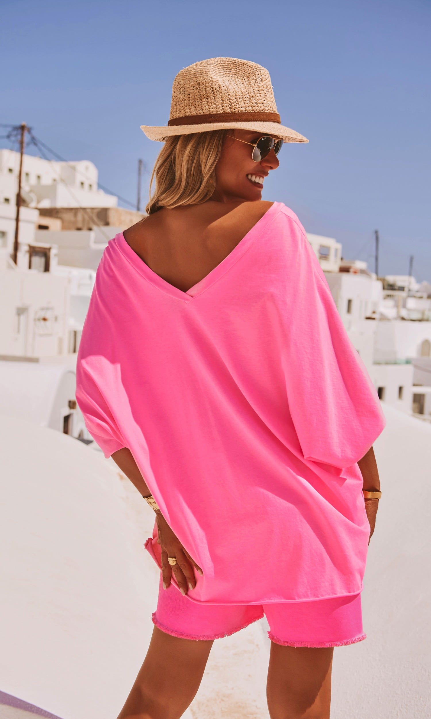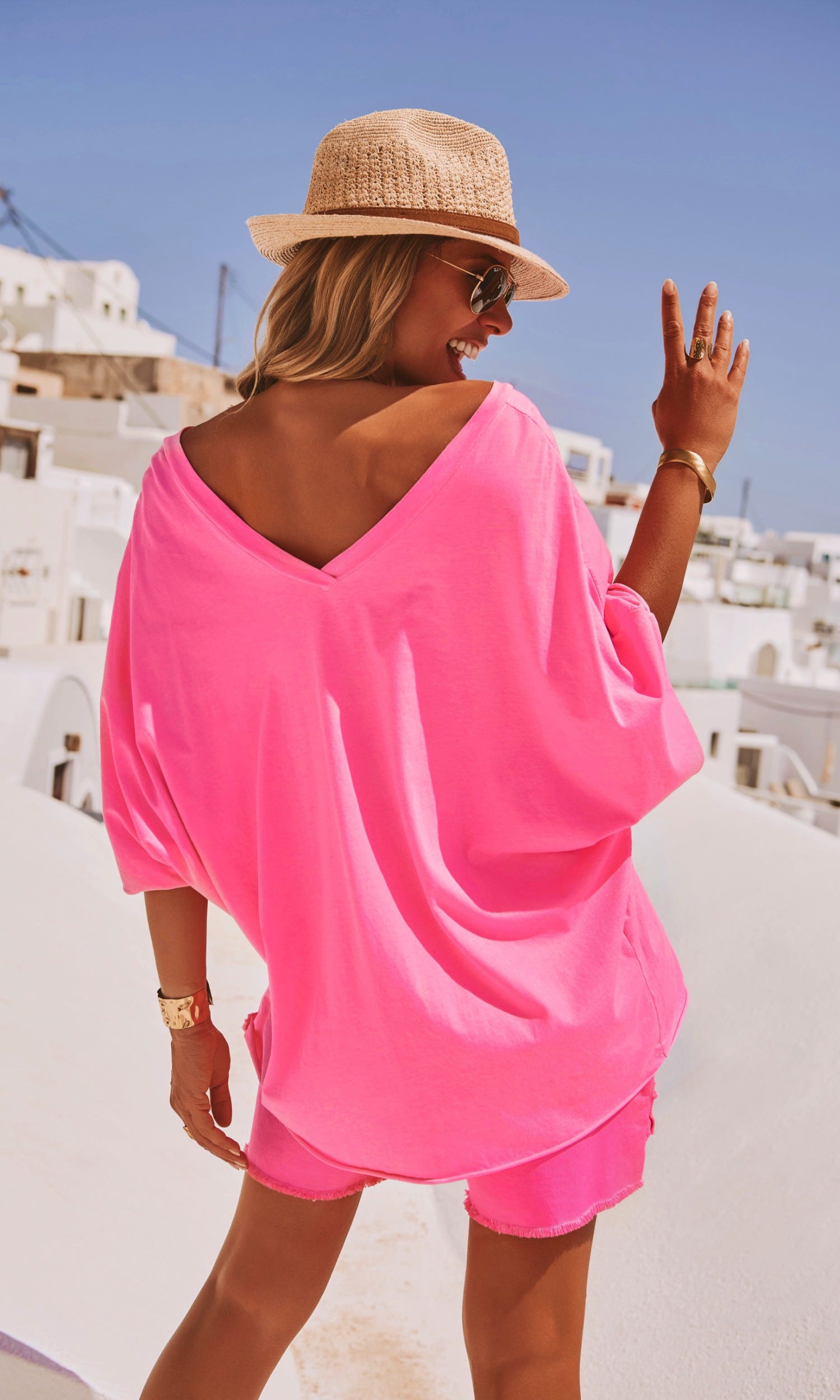 Son col V et son décolleté dans le dos apportent une touche d'élégance, tandis que les manches courtes chauve-souris assurent confort et aisance.