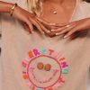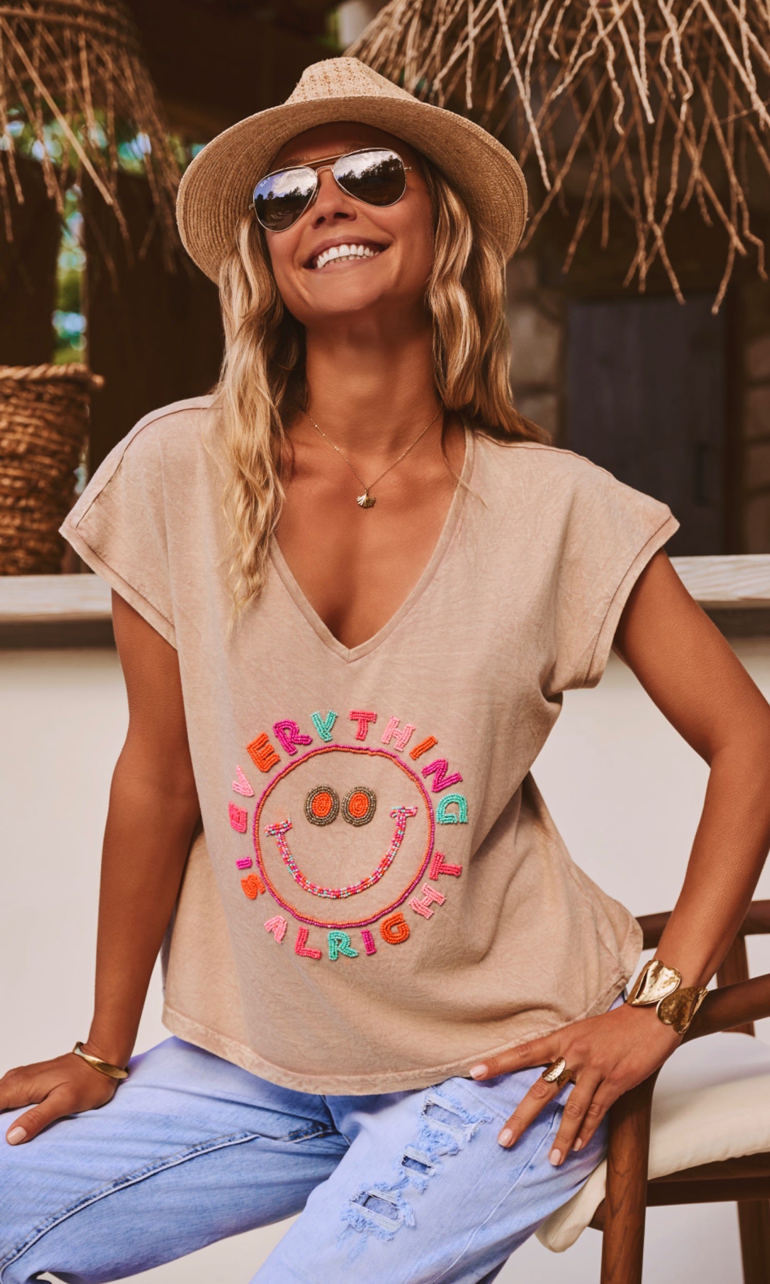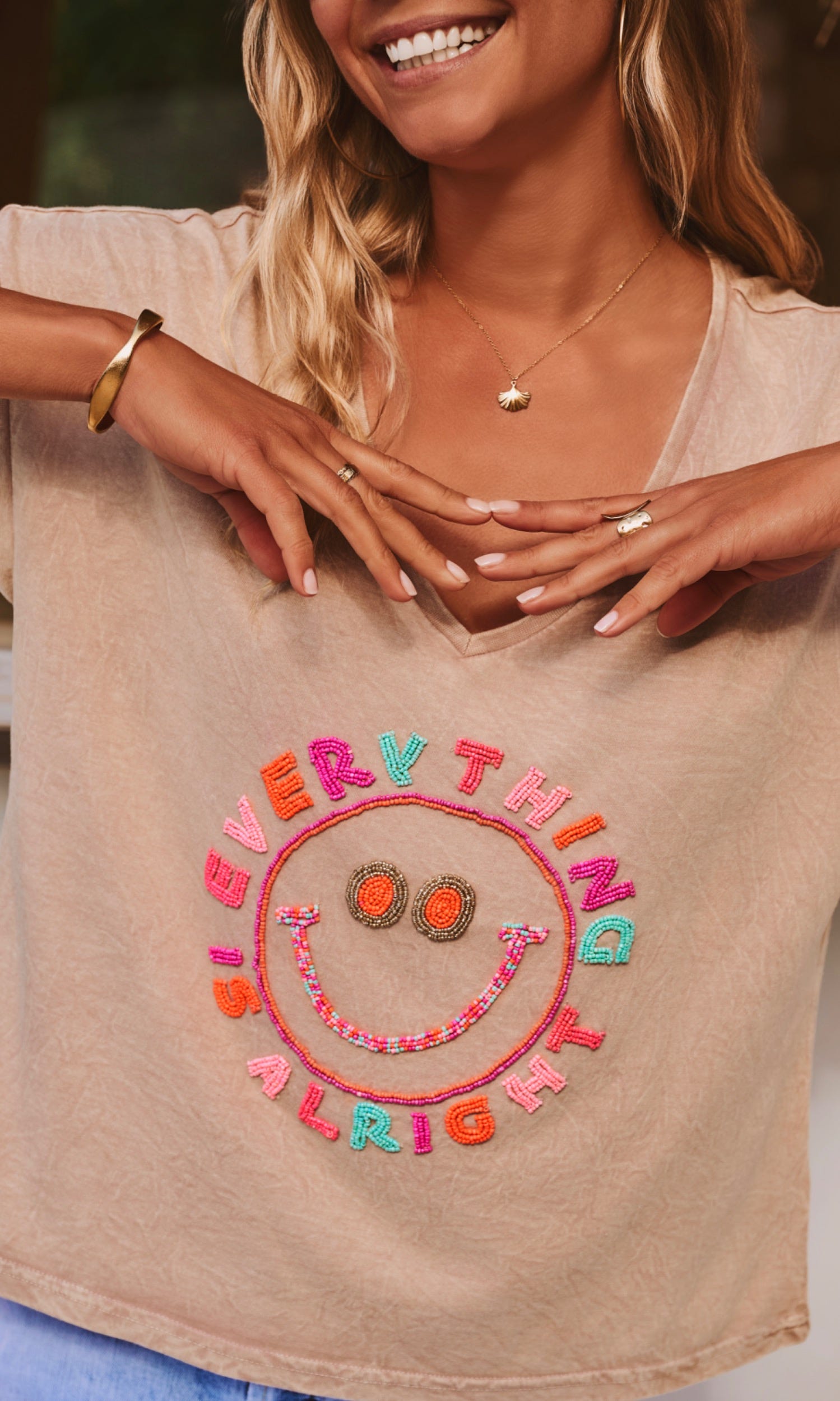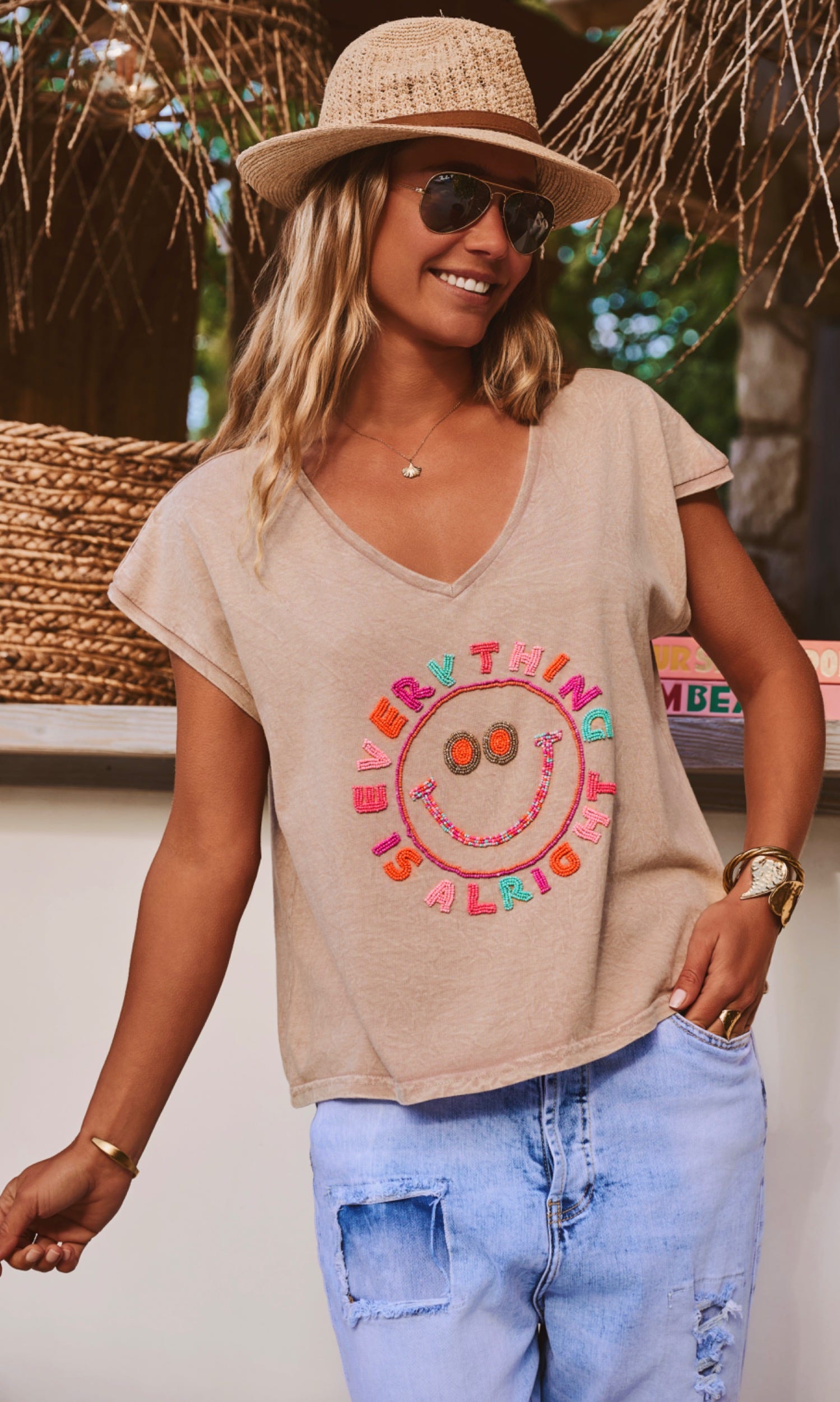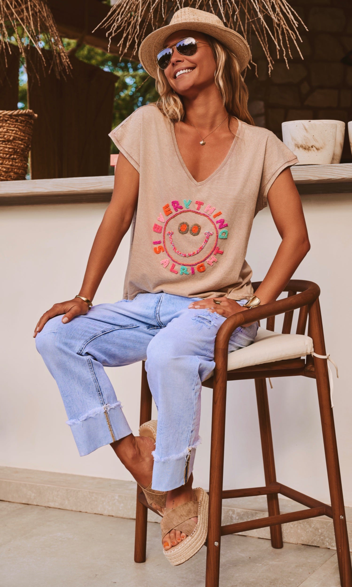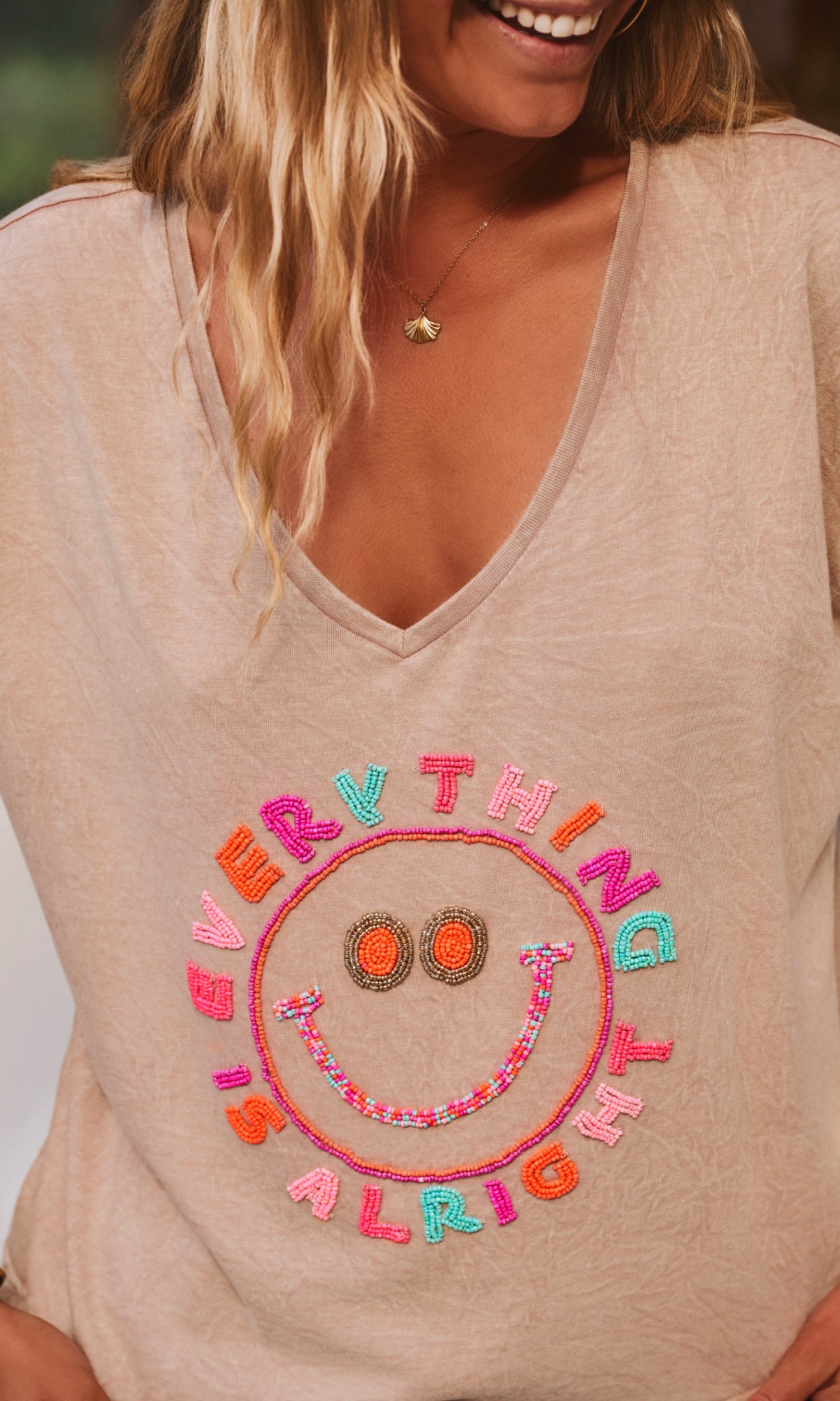 La broderie colorée "Everything Alright" accompagnée d'un smile apporte une note joyeuse à votre look.