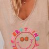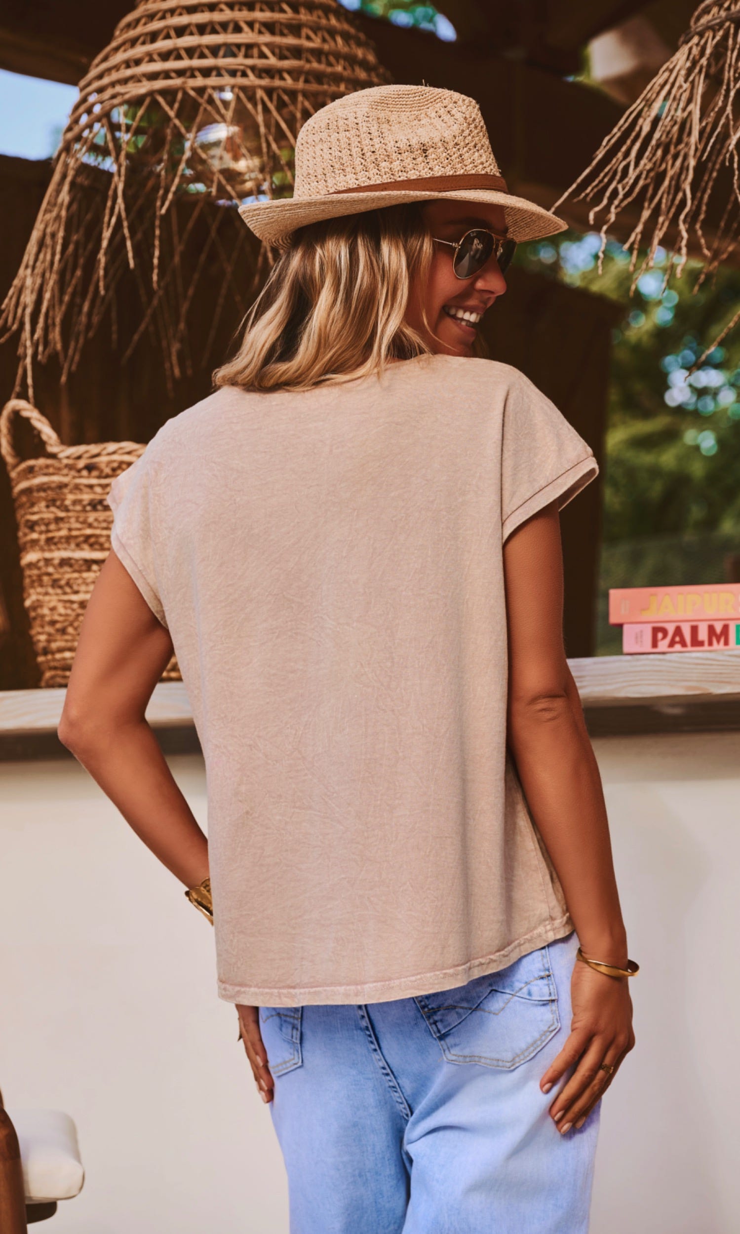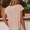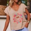 Découvrez ce t-shirt camel à la coupe droite, doté d'un col V généreux et de manches courtes.