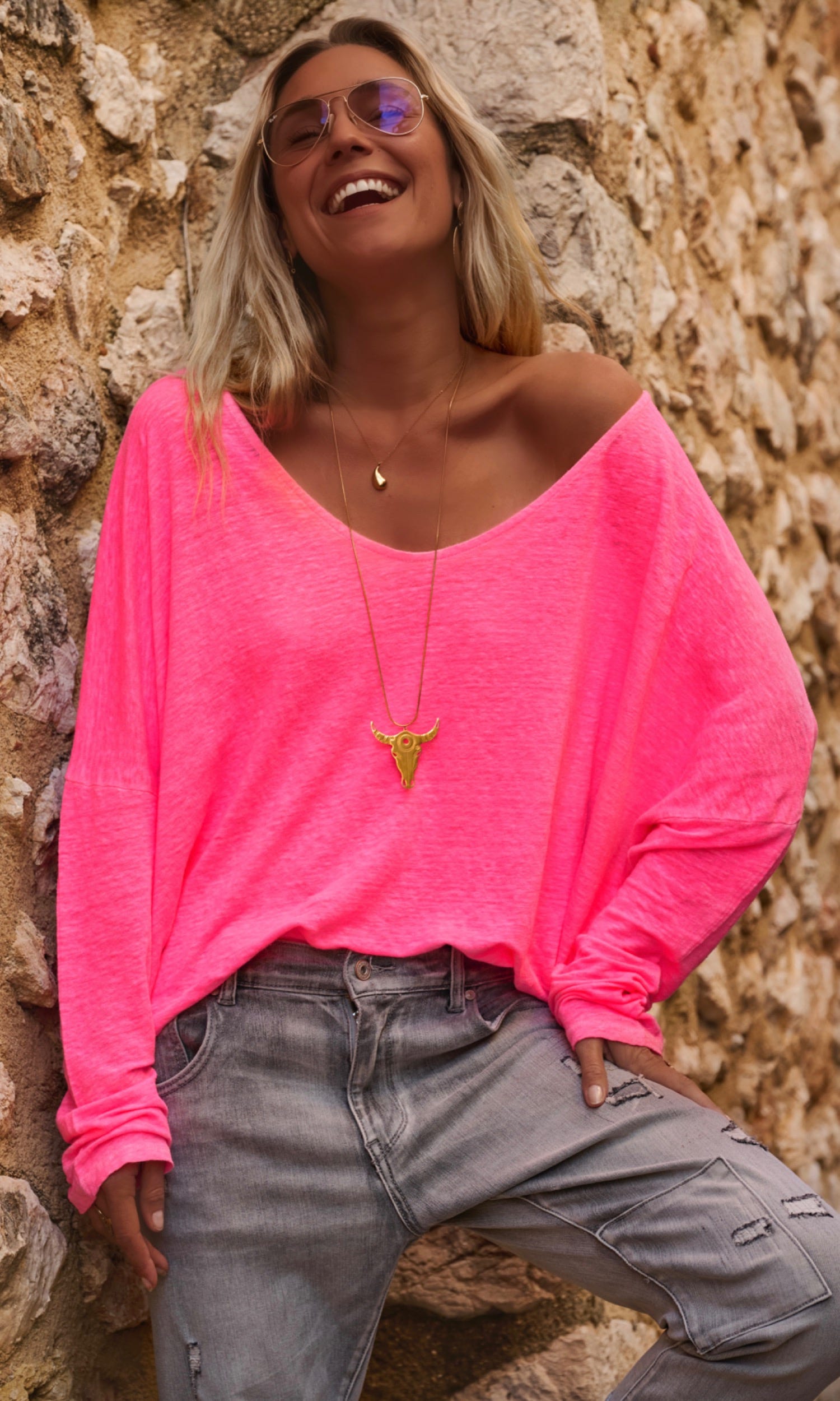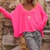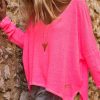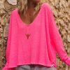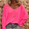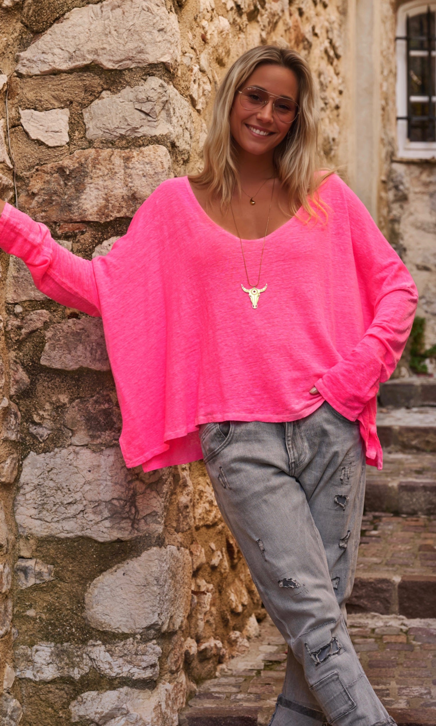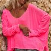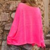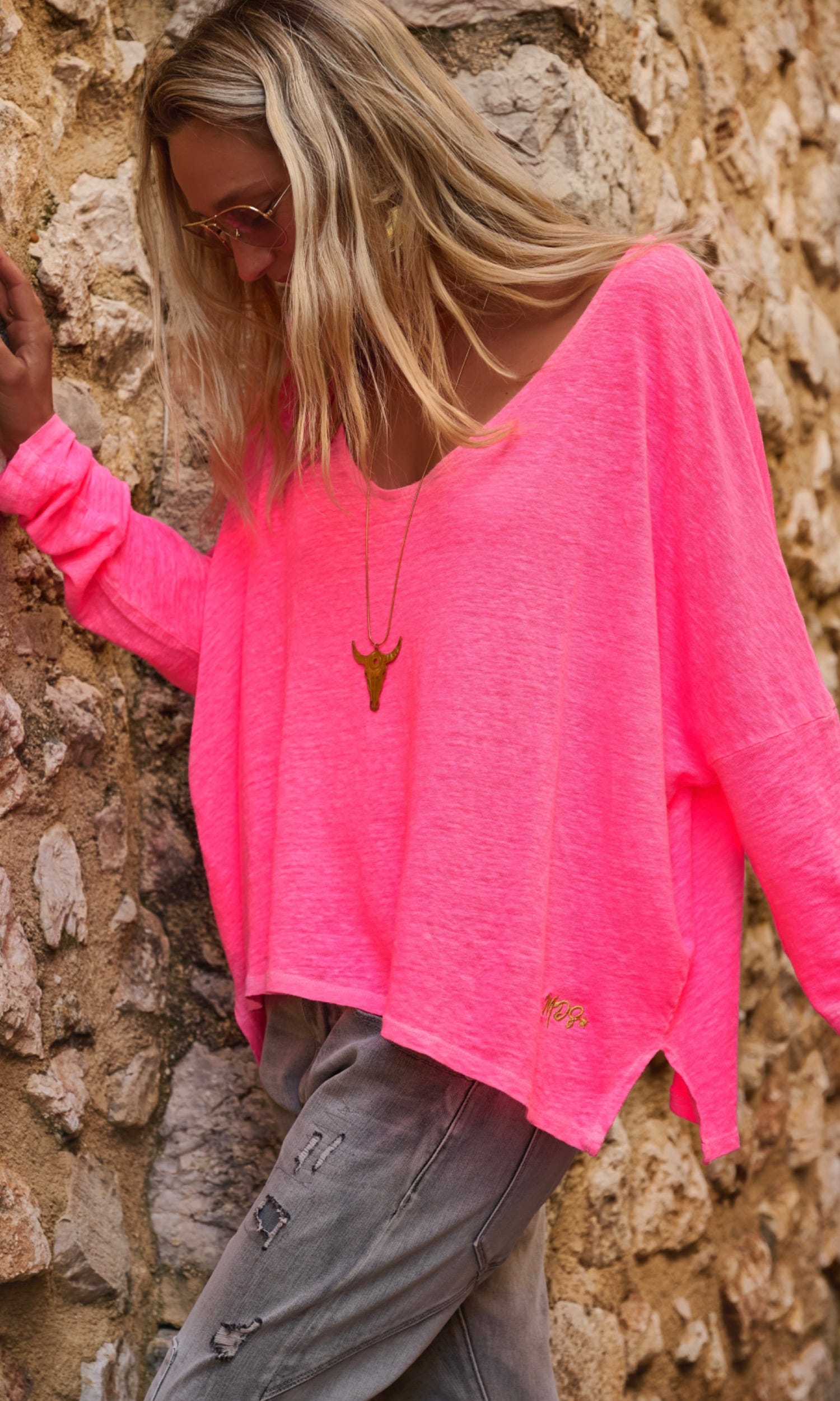 Ce T-shirt rose fluo en lin à la coupe loose offre une allure décontractée et élégante.