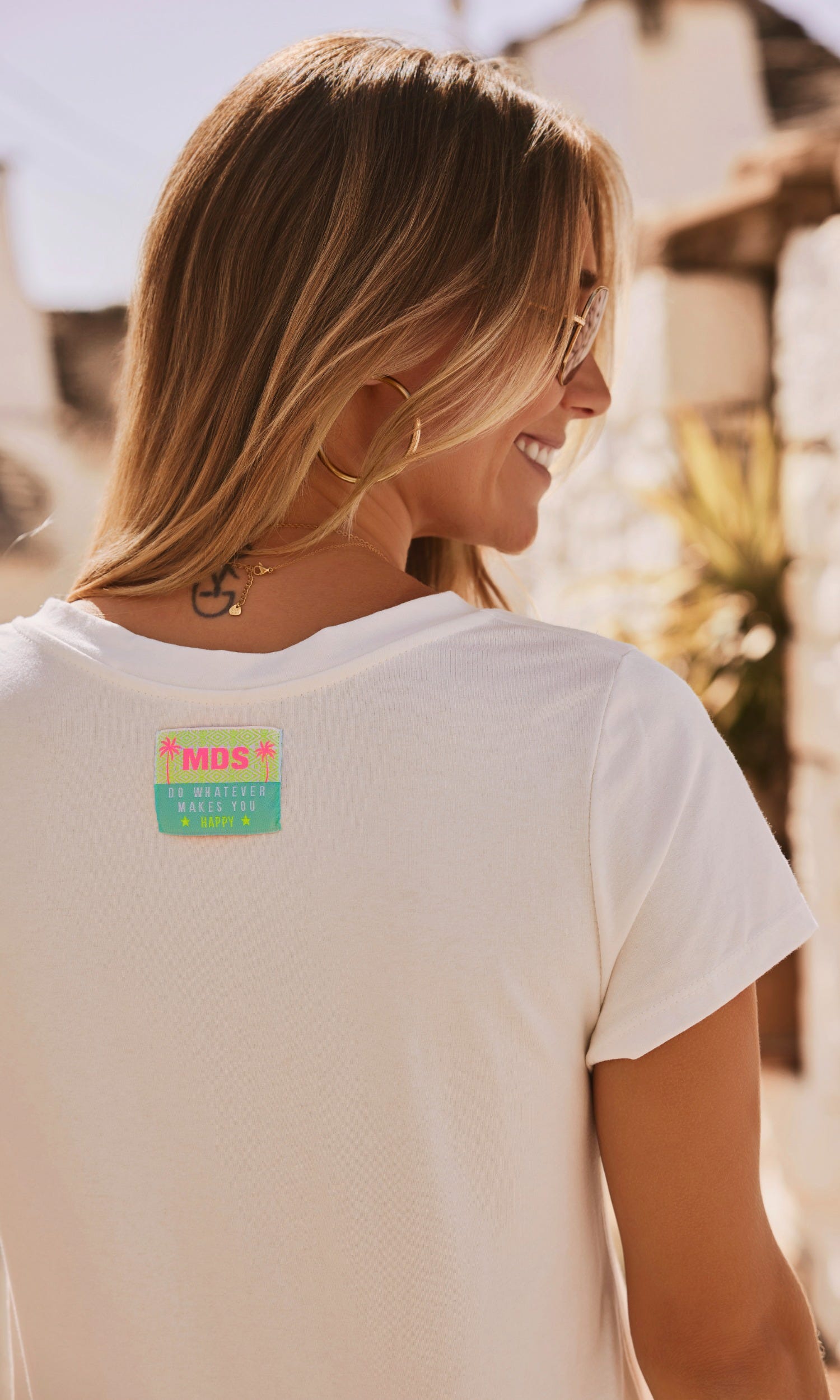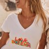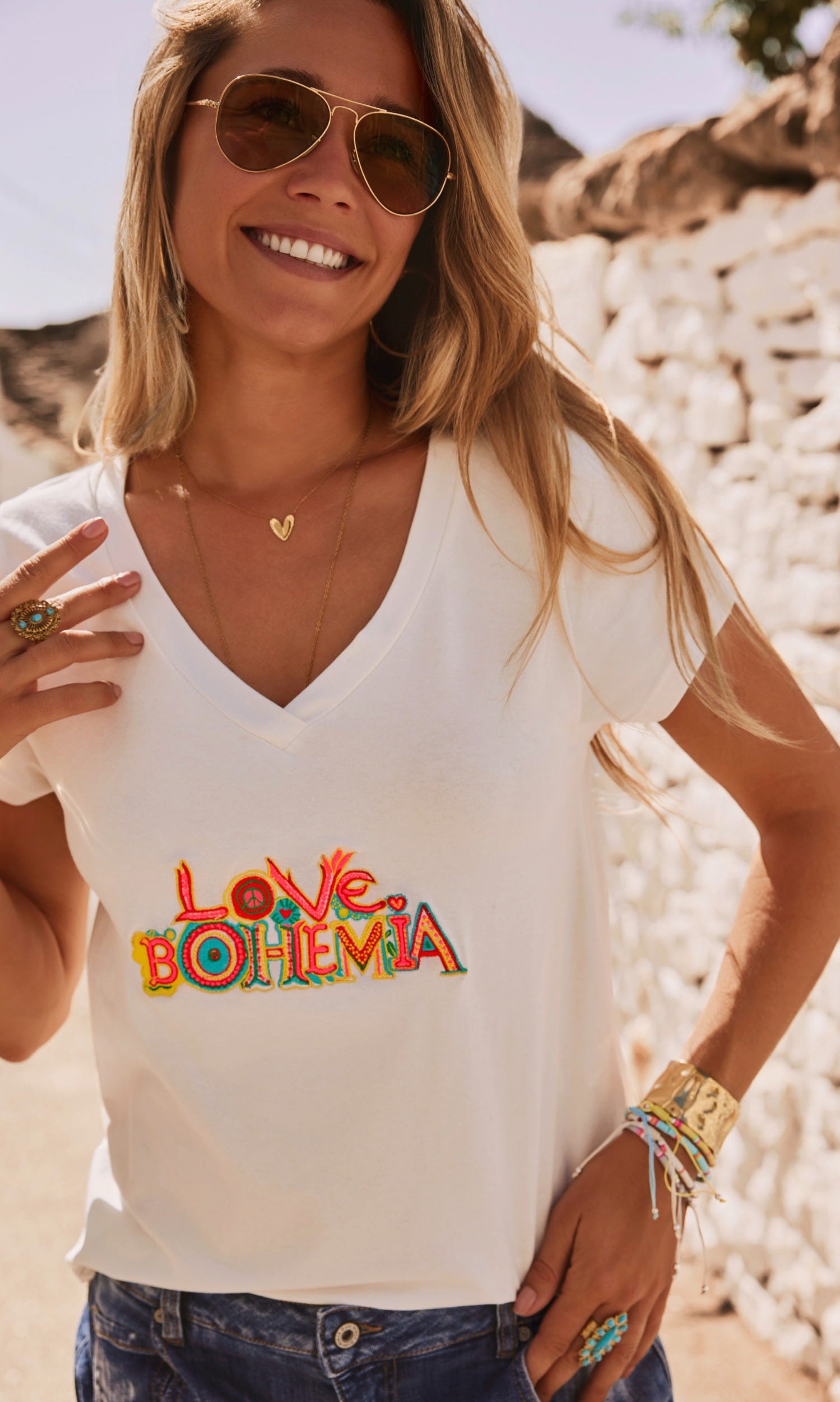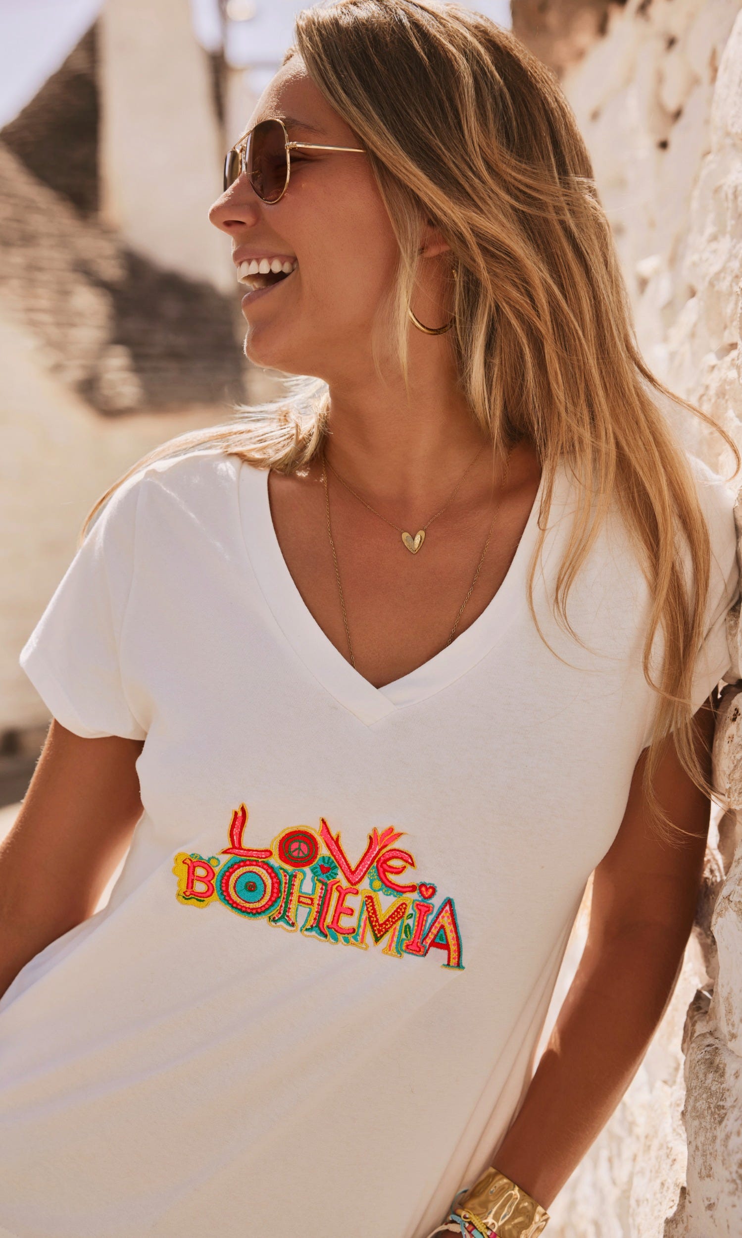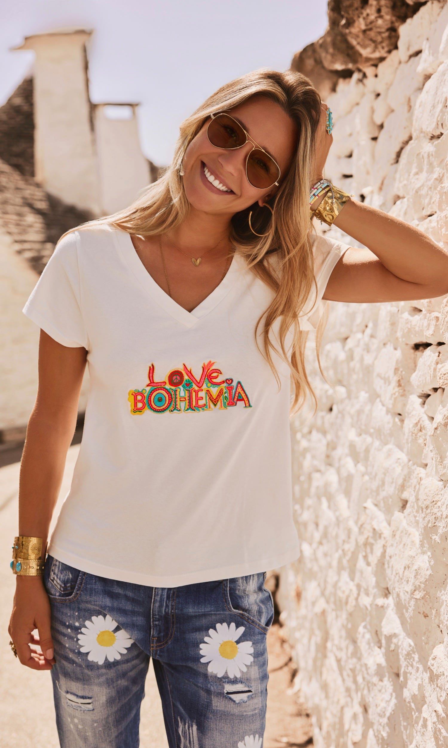 La broderie "Love Bohemia" sur le devant apporte une note audacieuse à cette pièce essentielle de votre garde-robe.