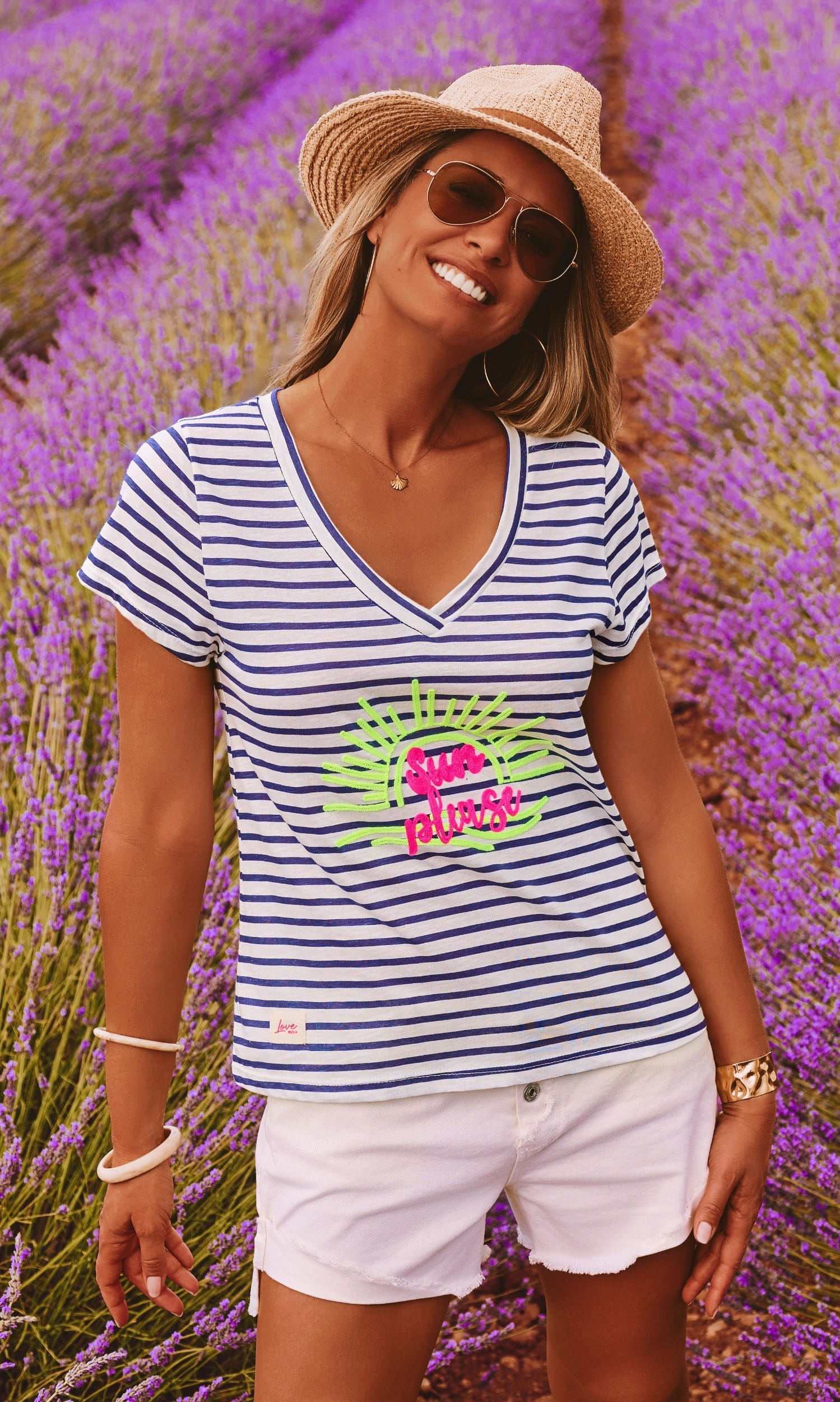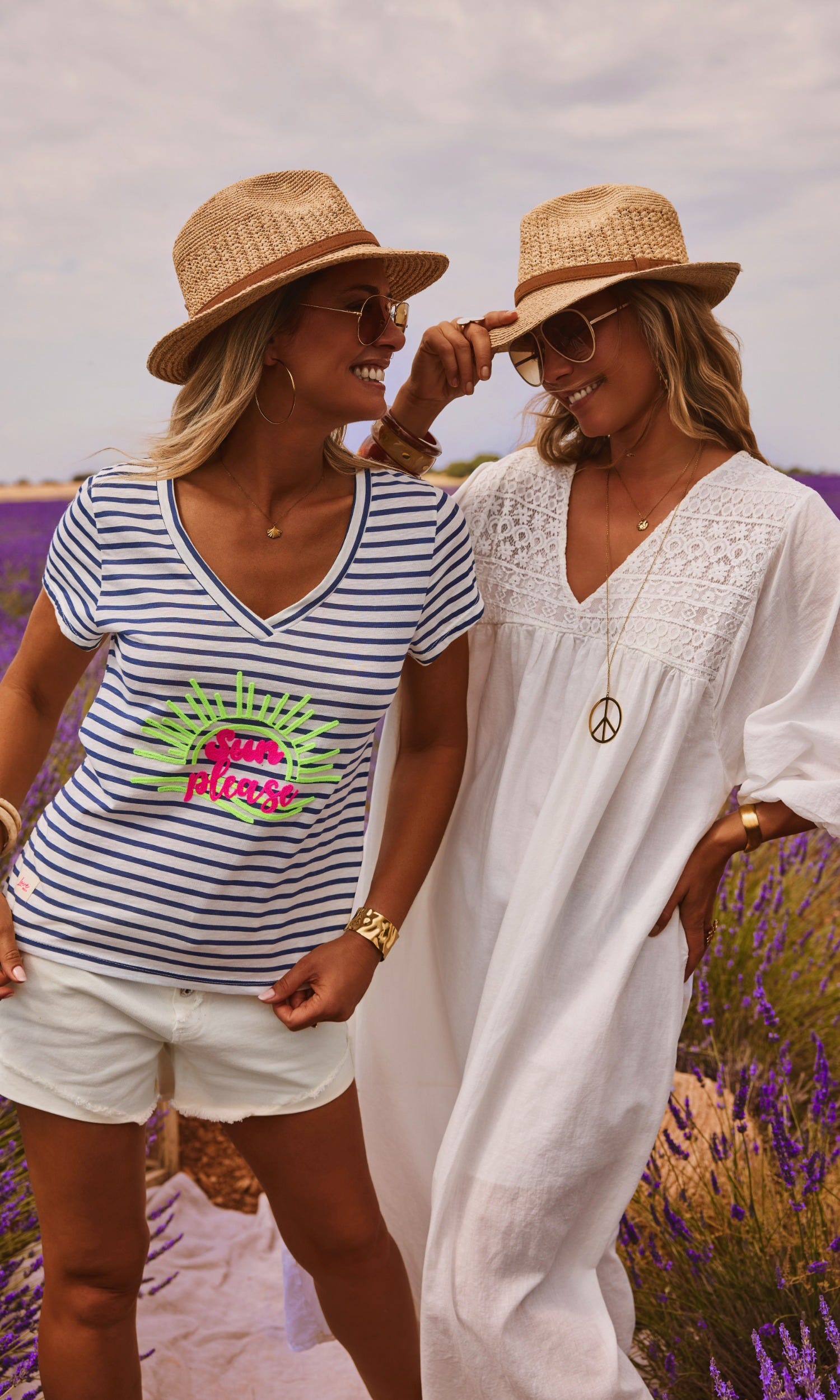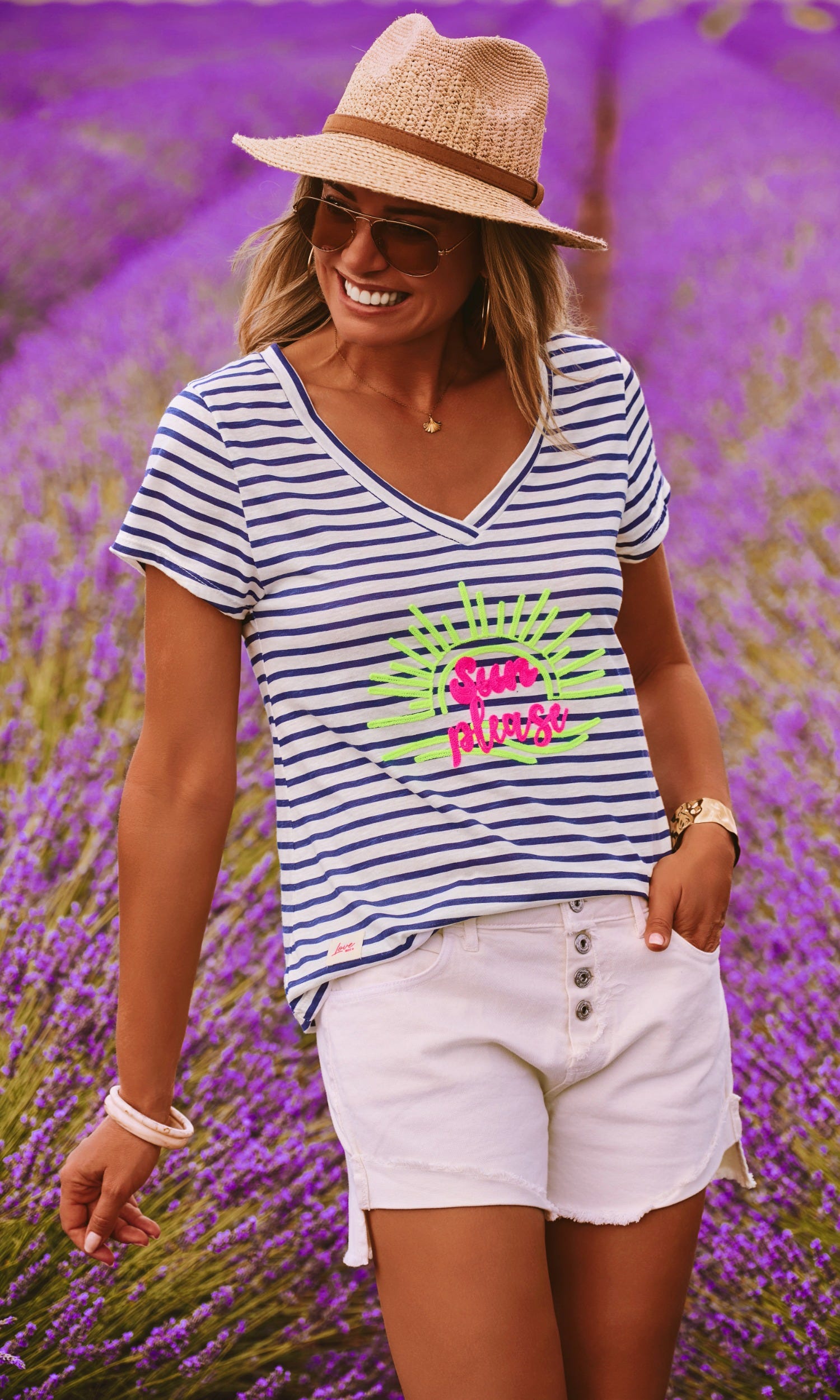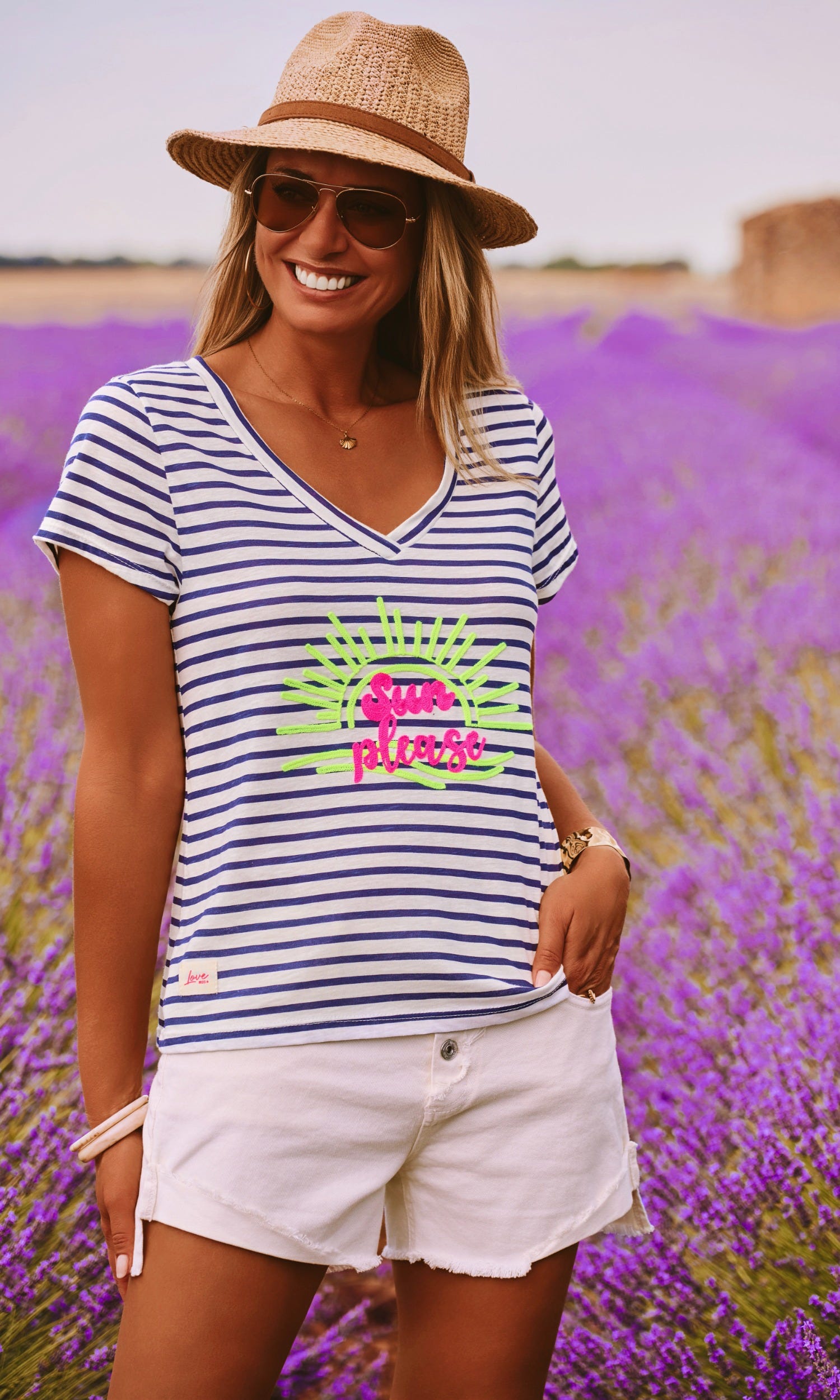 Son col V et ses manches courtes offrent un confort recherché, tandis que la broderie "Sun Please" sur le devant ajoute une touche de créativité.