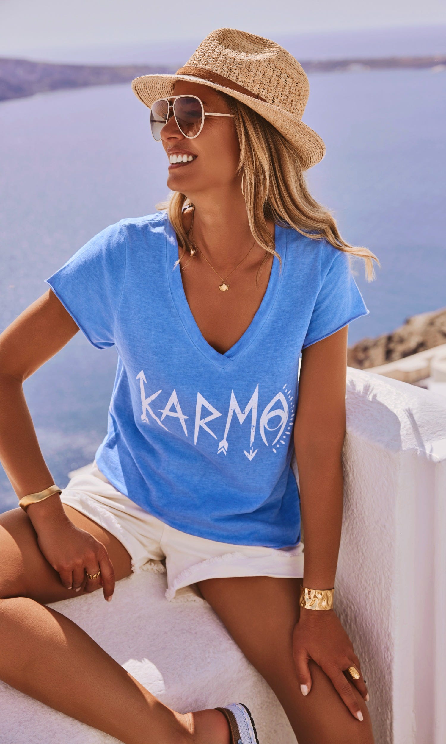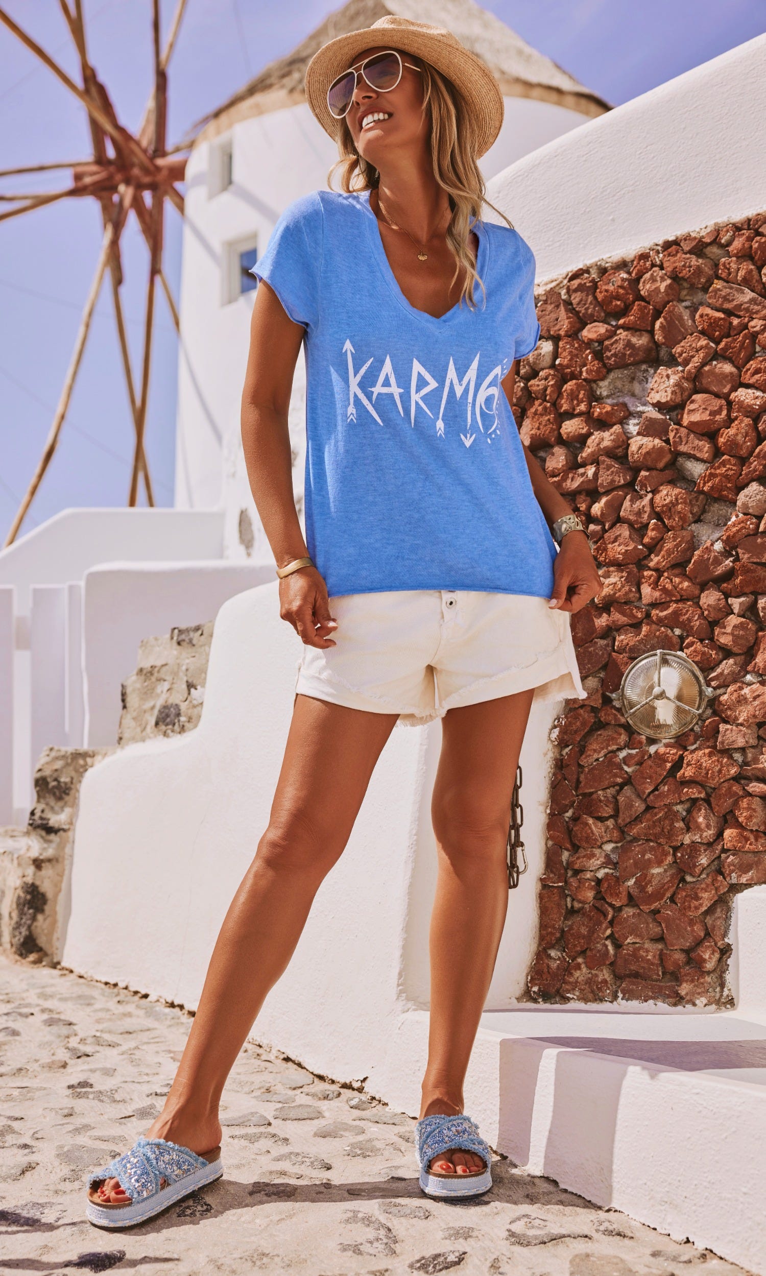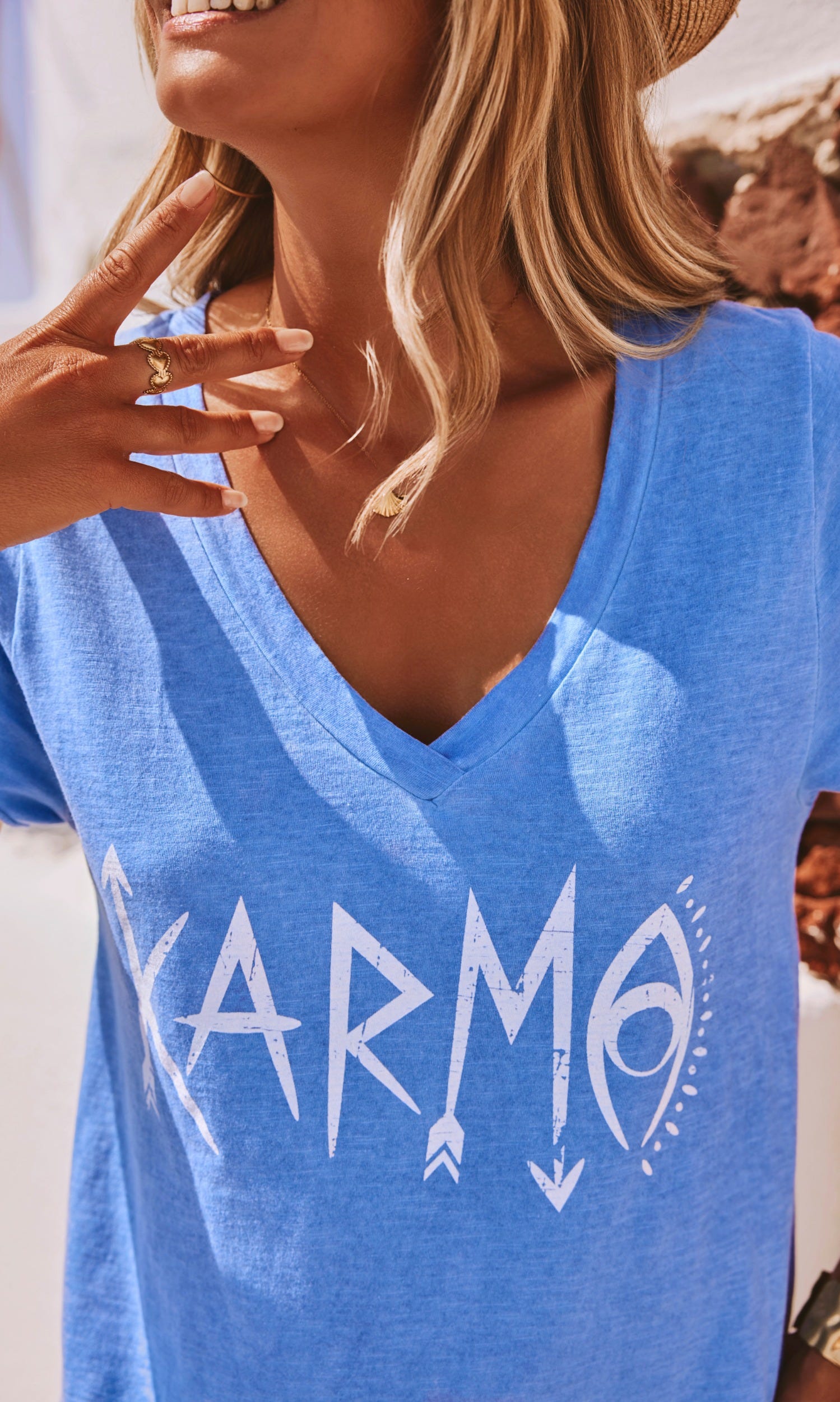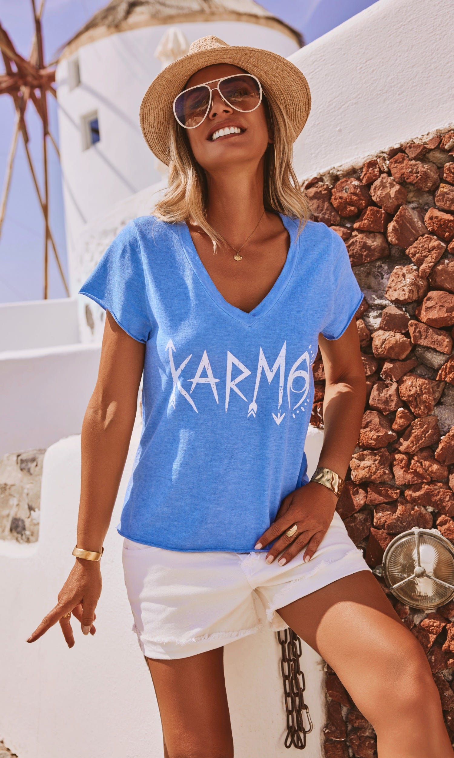 Avec sa finition bords francs aux manches et en partie basse, ce modèle se distingue par son motif "Karma" blanc imprimé sur le devant.