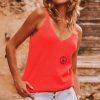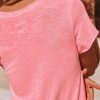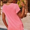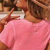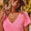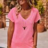 Ce t-shirt corail fluo à la coupe droite se distingue par son col V et ses manches courtes.