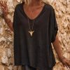 Ce t-shirt corail fluo à la coupe droite se distingue par son col V et ses manches courtes.
