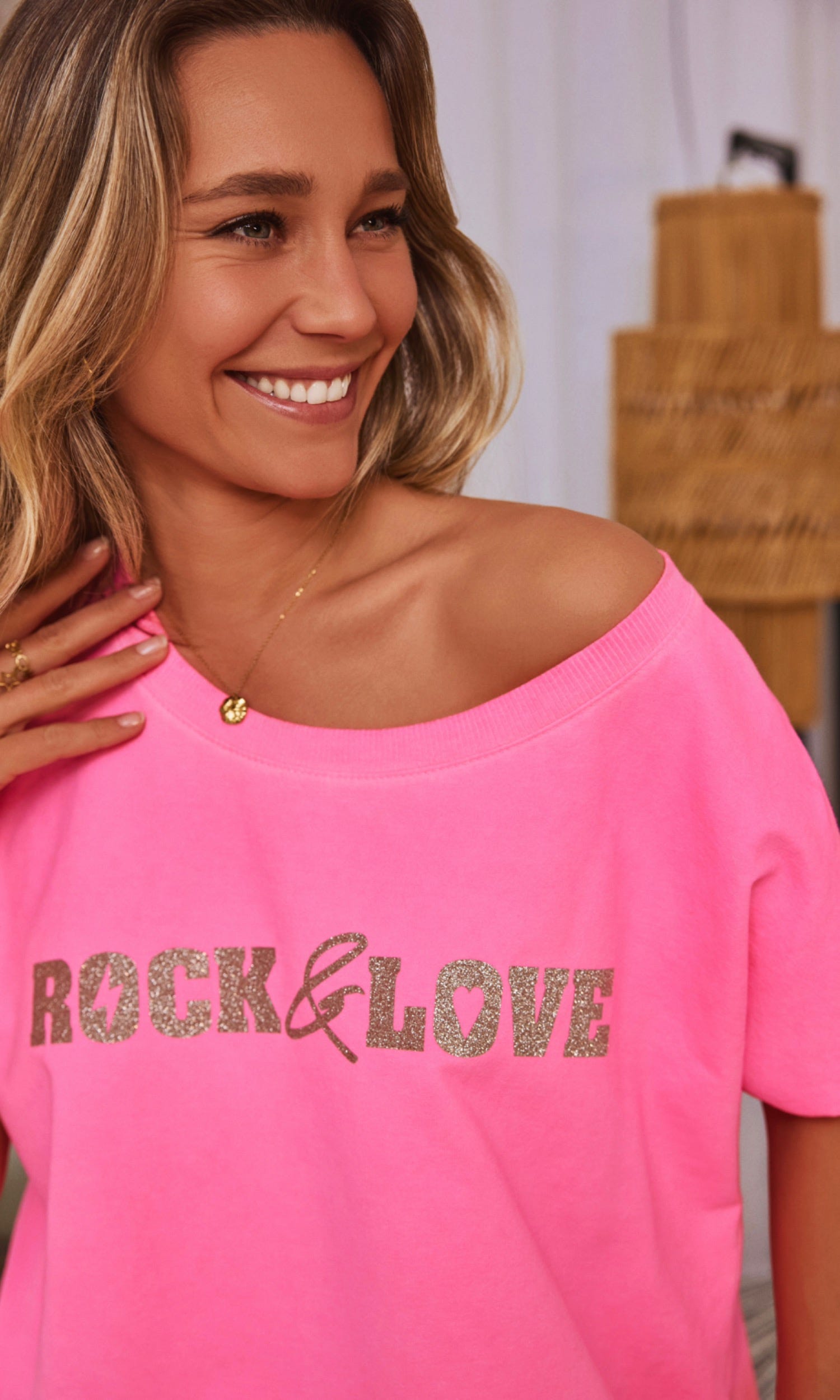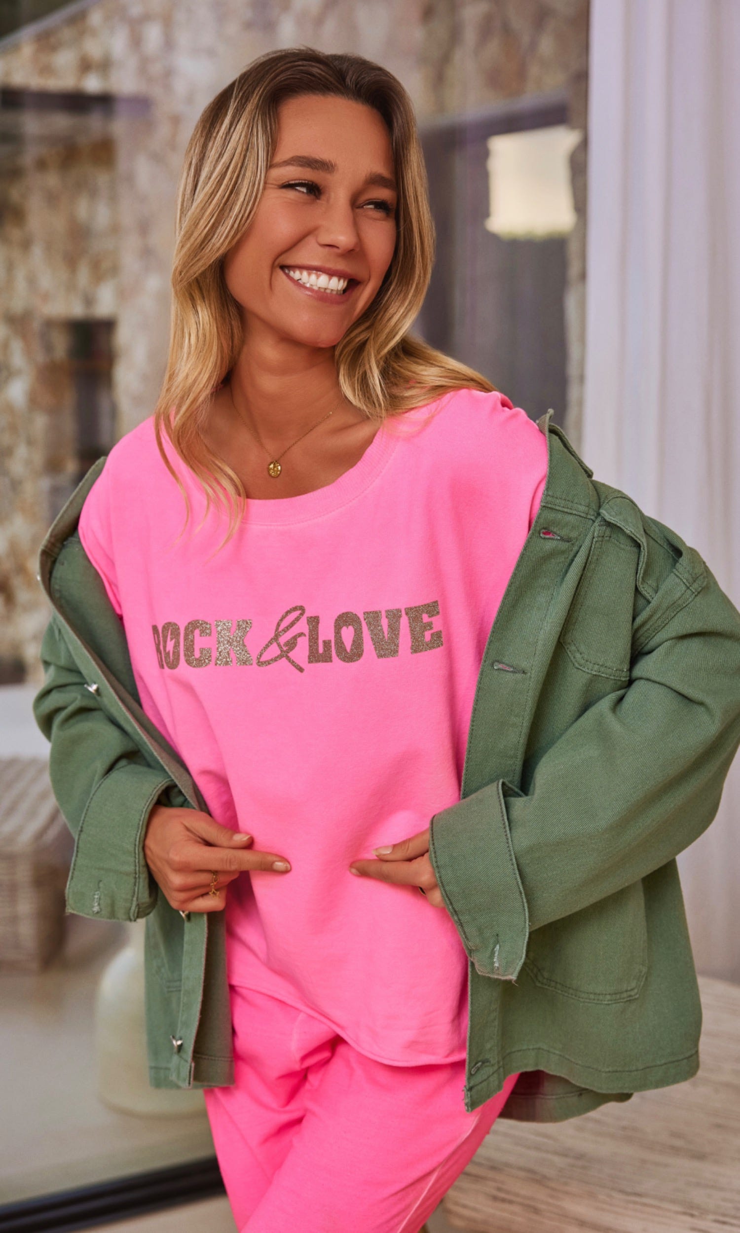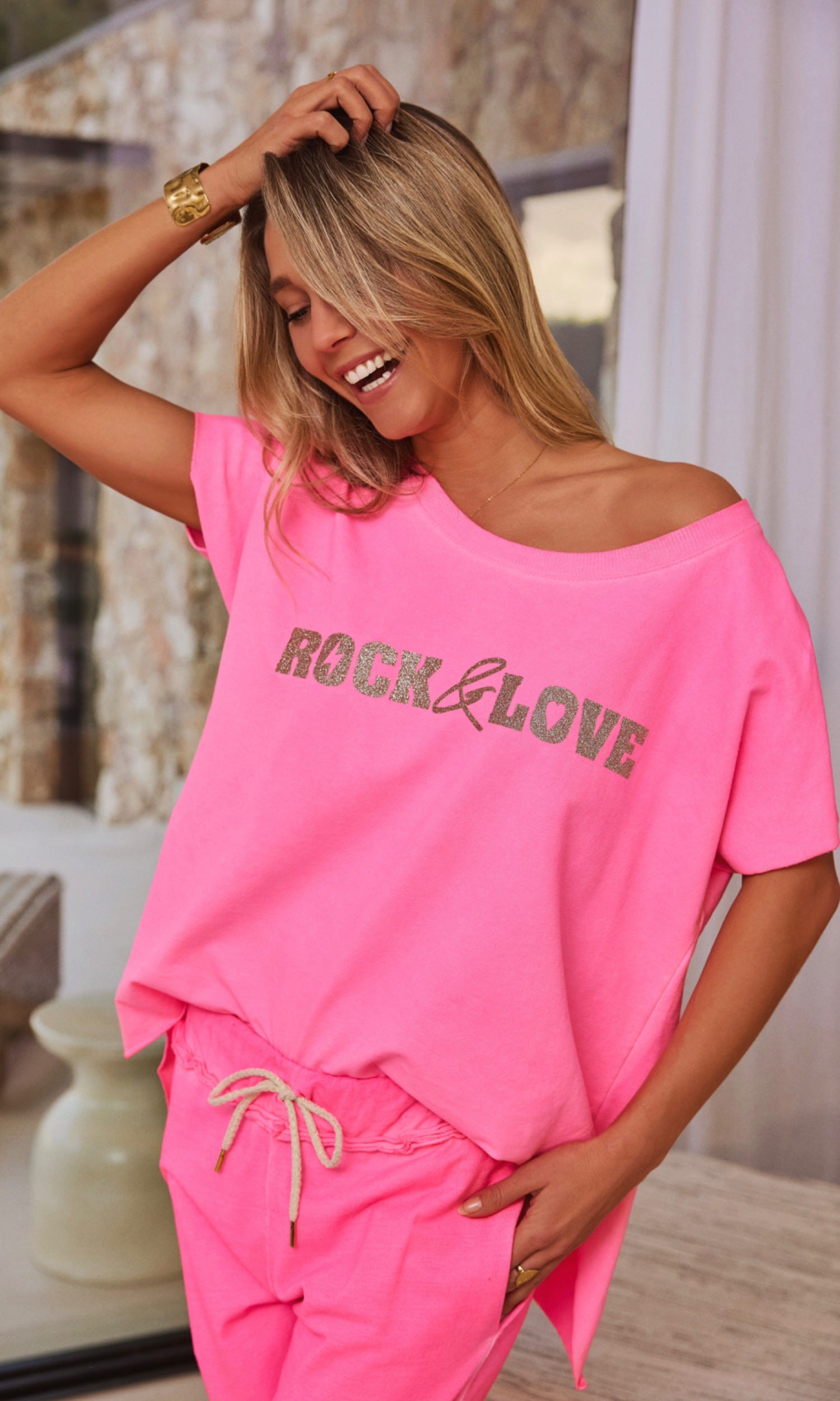 Adoptez le style audacieux avec ce t-shirt rose fluo loose à coupe trapèze avec son imprimé Rock&Love.
