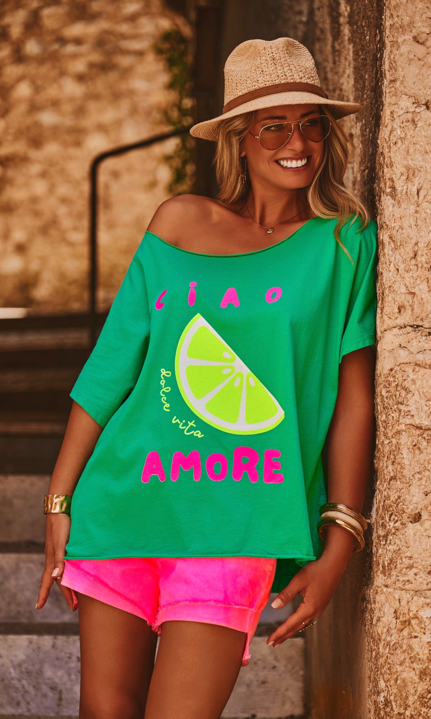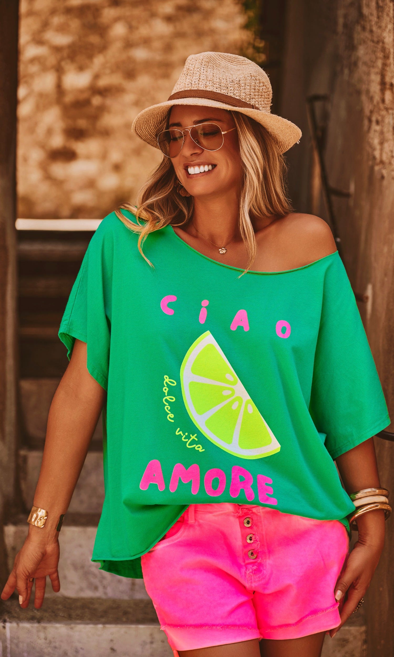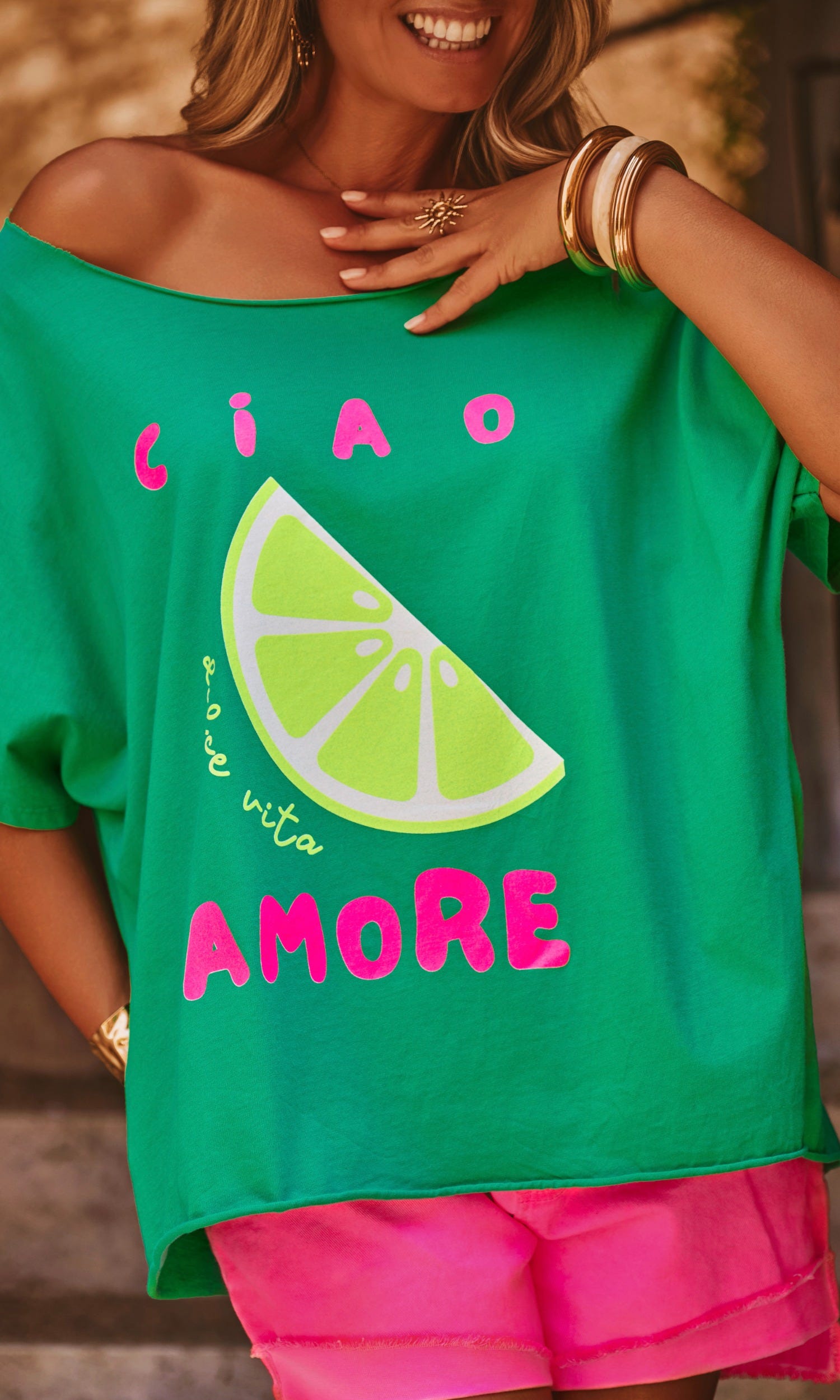 La finition en bord franc au col et en partie basse met en valeur son design, tandis que l'imprimé Ciao Amore rose apporte une touche unique.