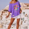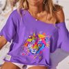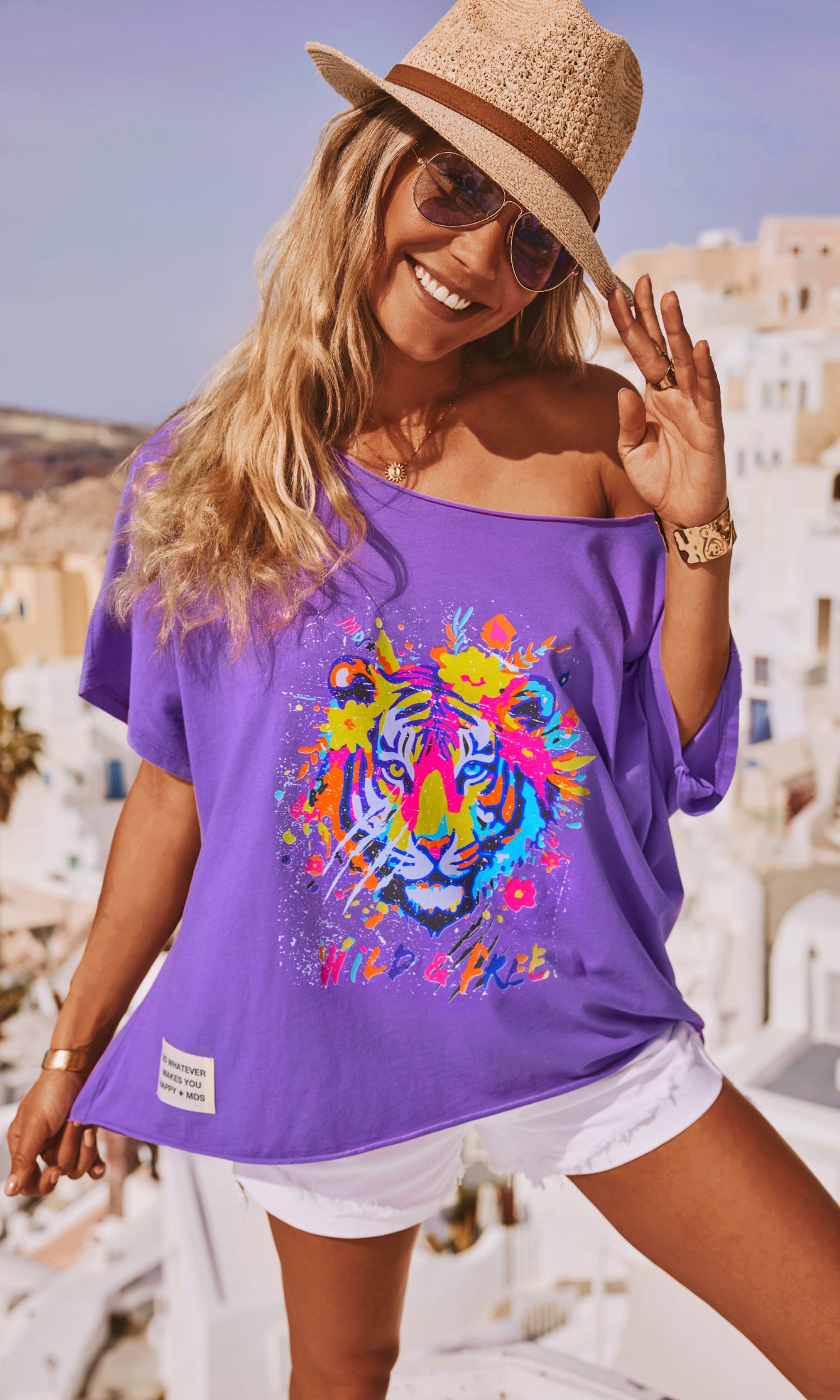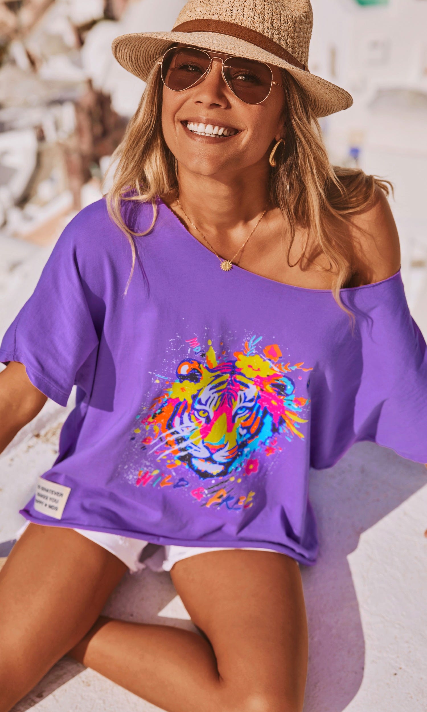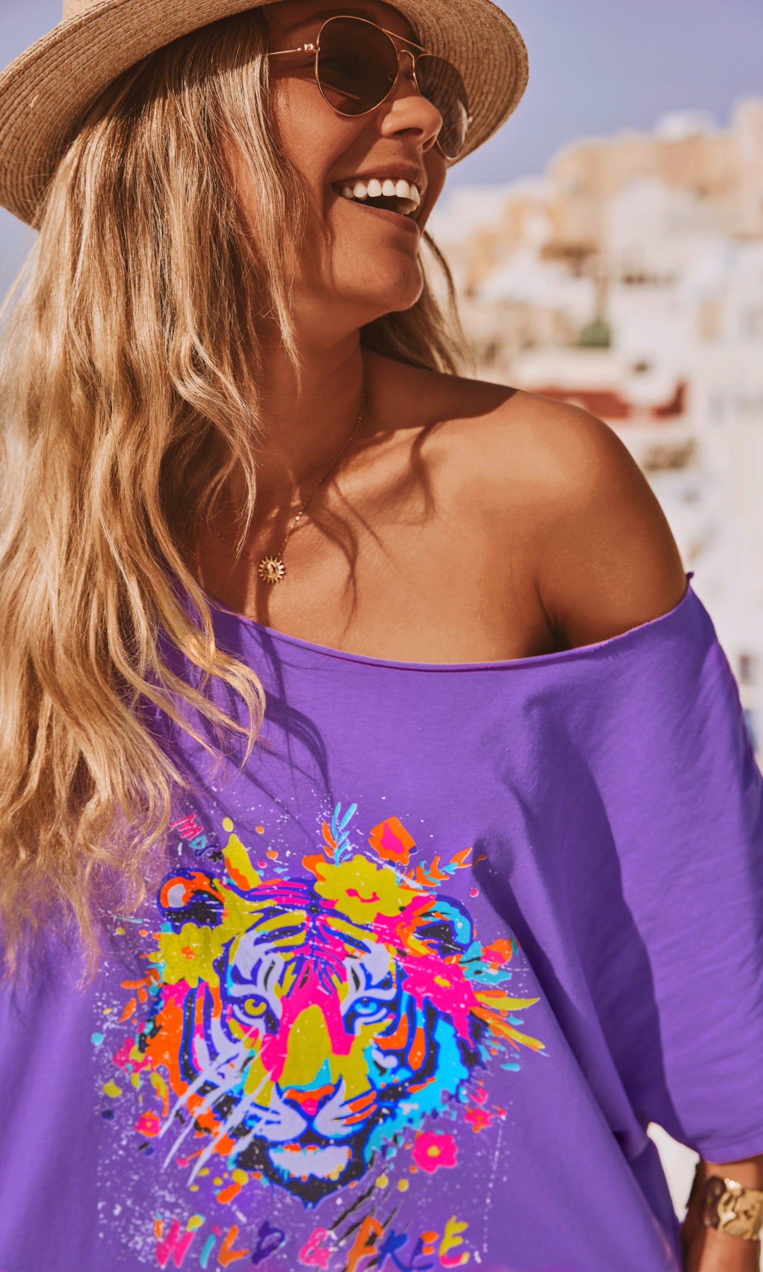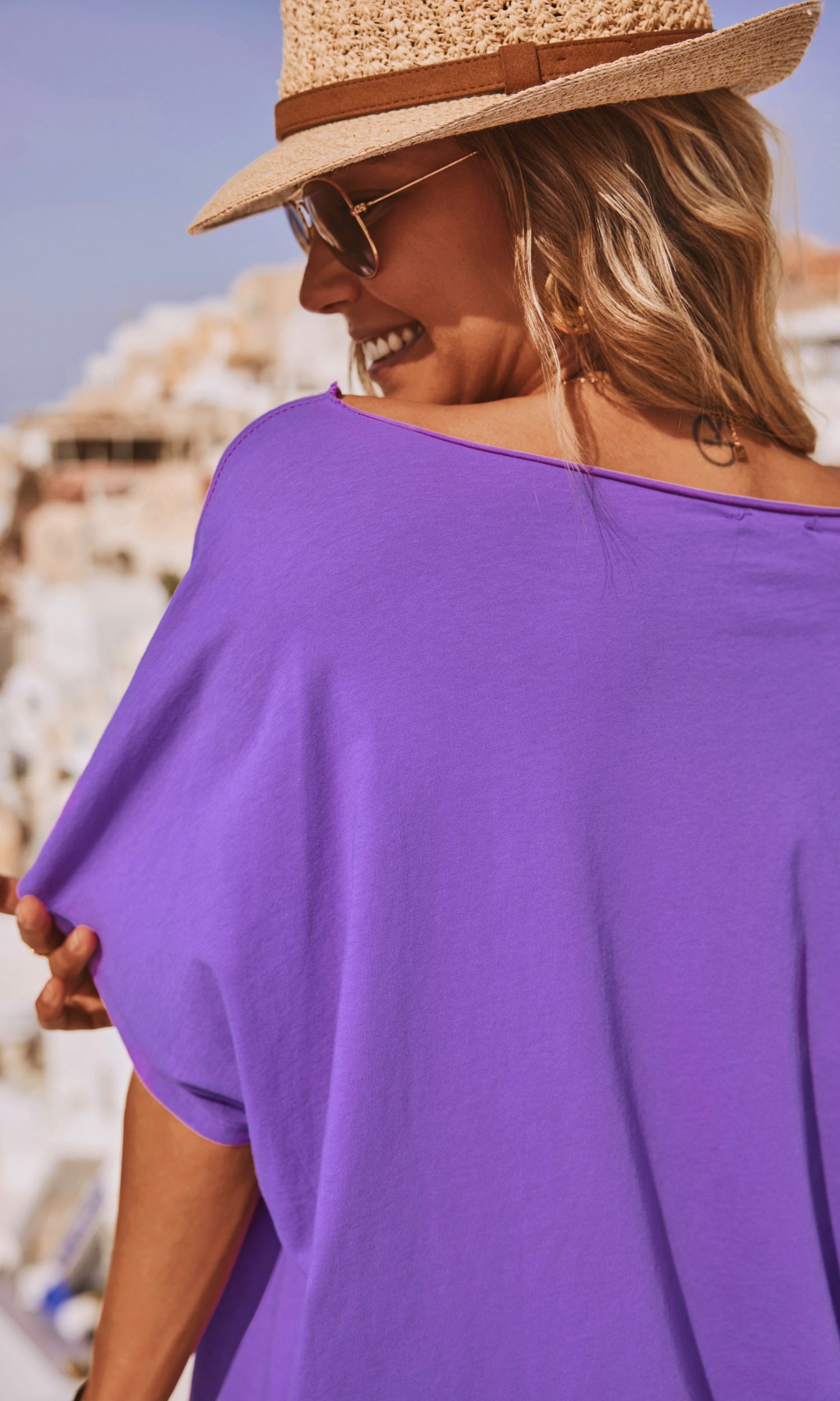 Découvrez notre t-shirt violet oversize au col bateau pour un look à la fois décontracté et tendance.