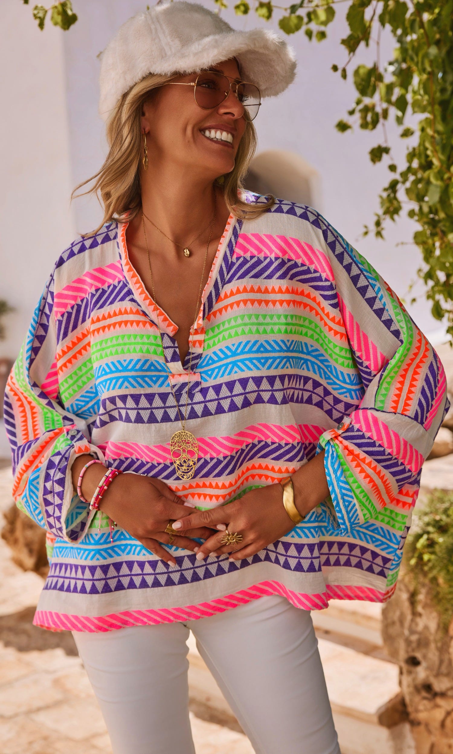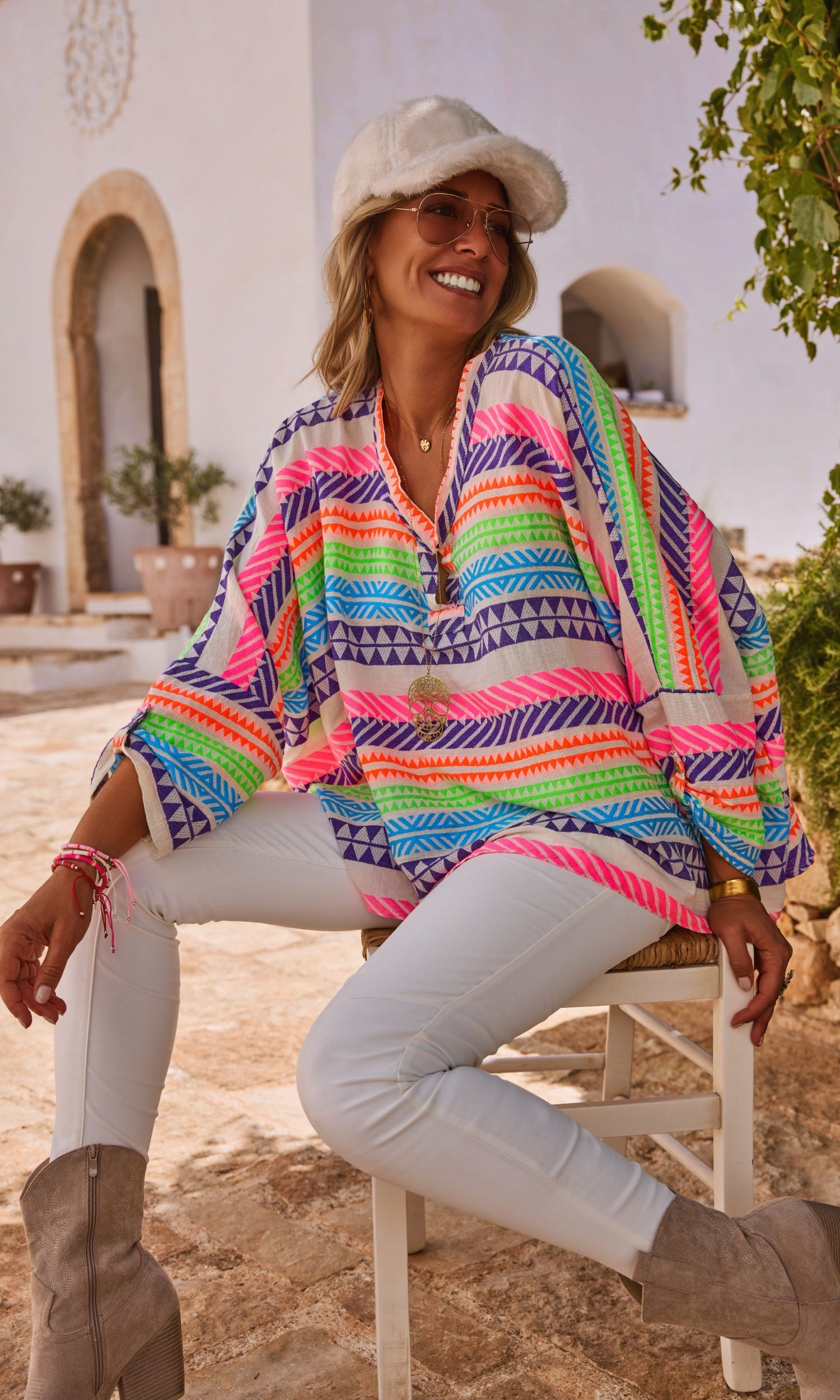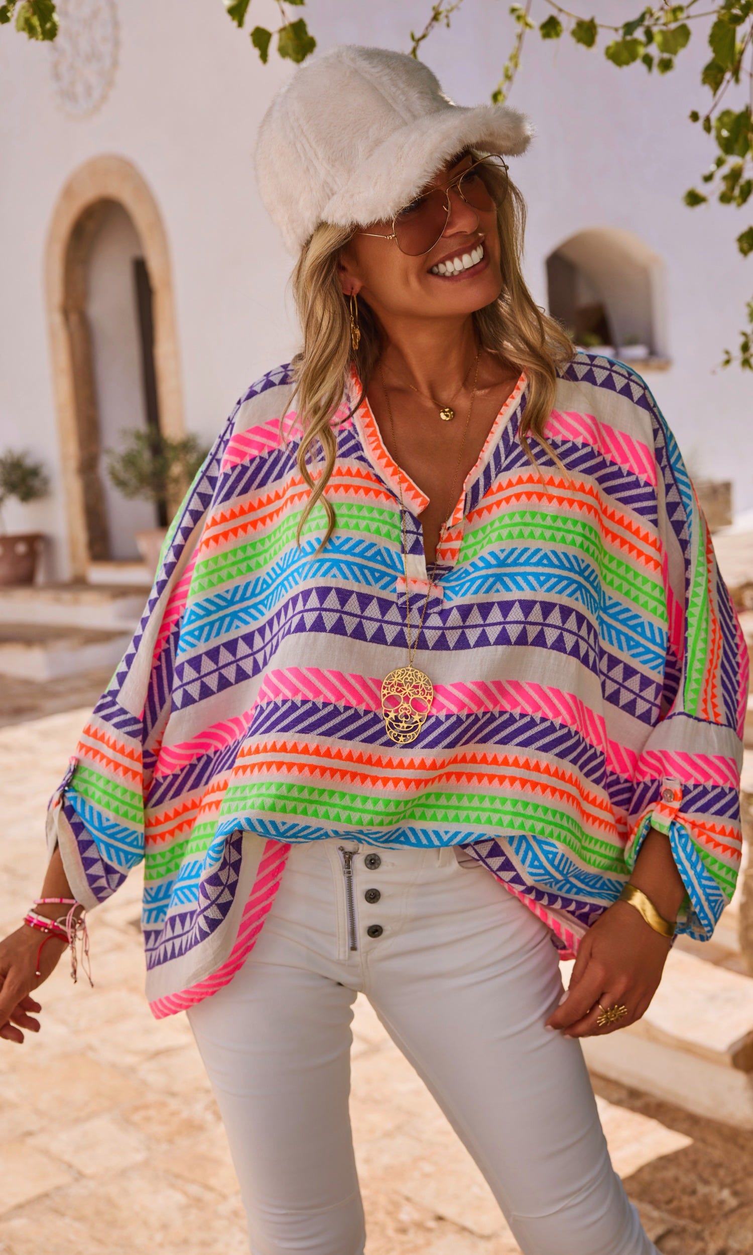 Ses manches longues avec patte de boutonnage et son motif multicolor aztek apportent une touche originale.