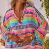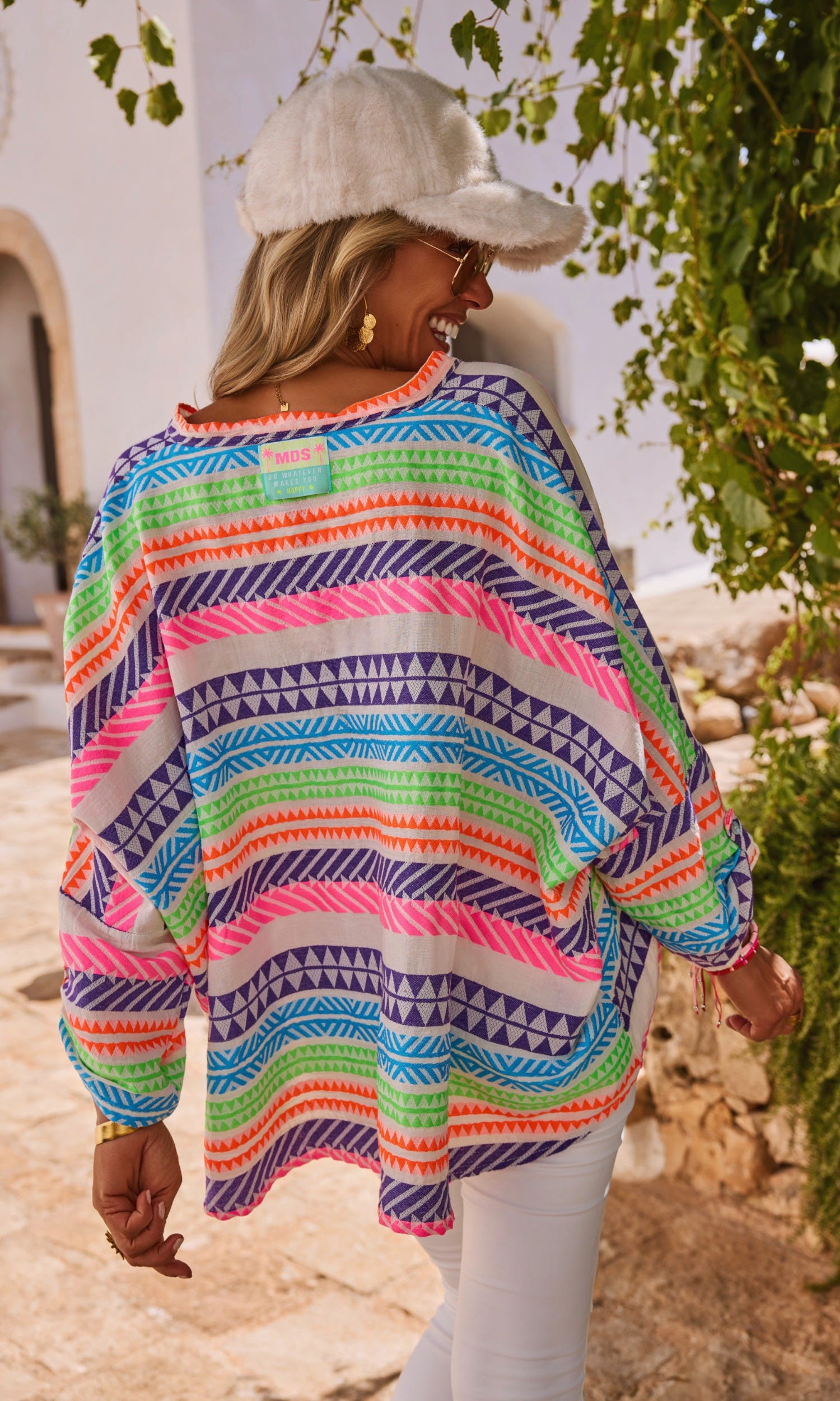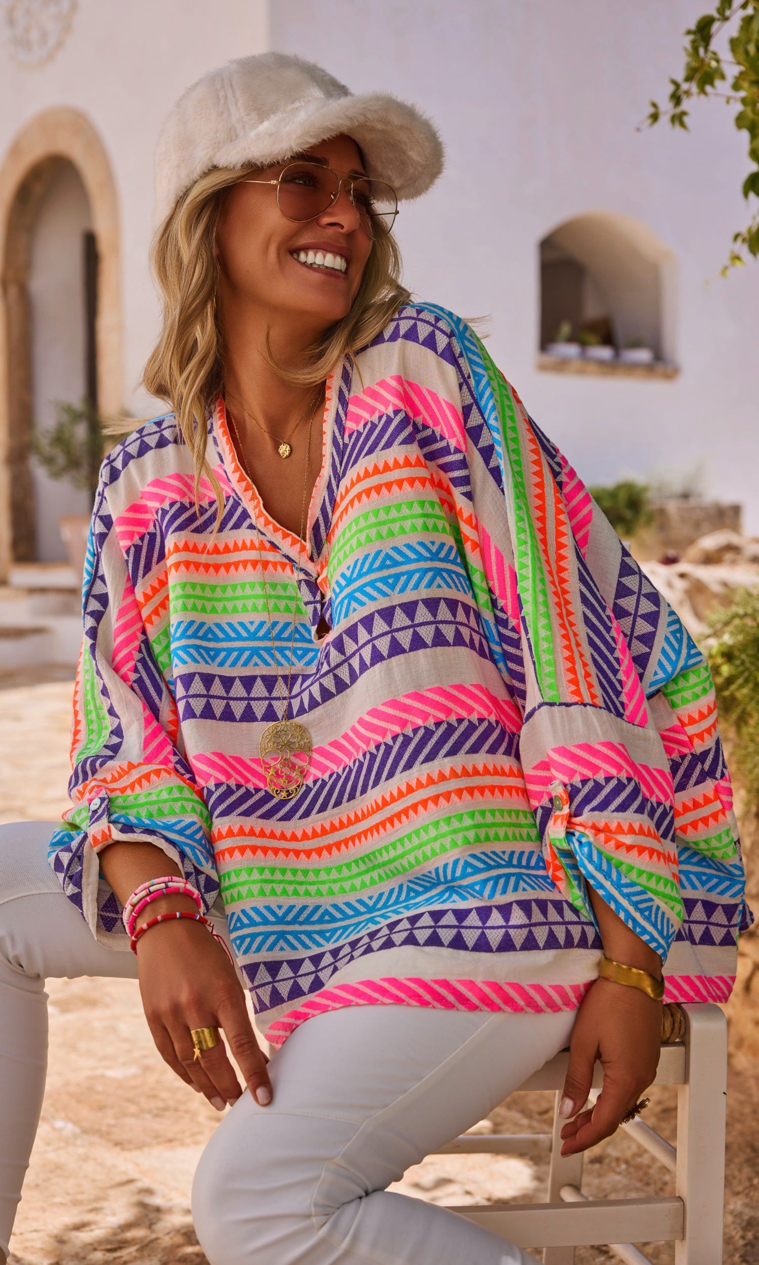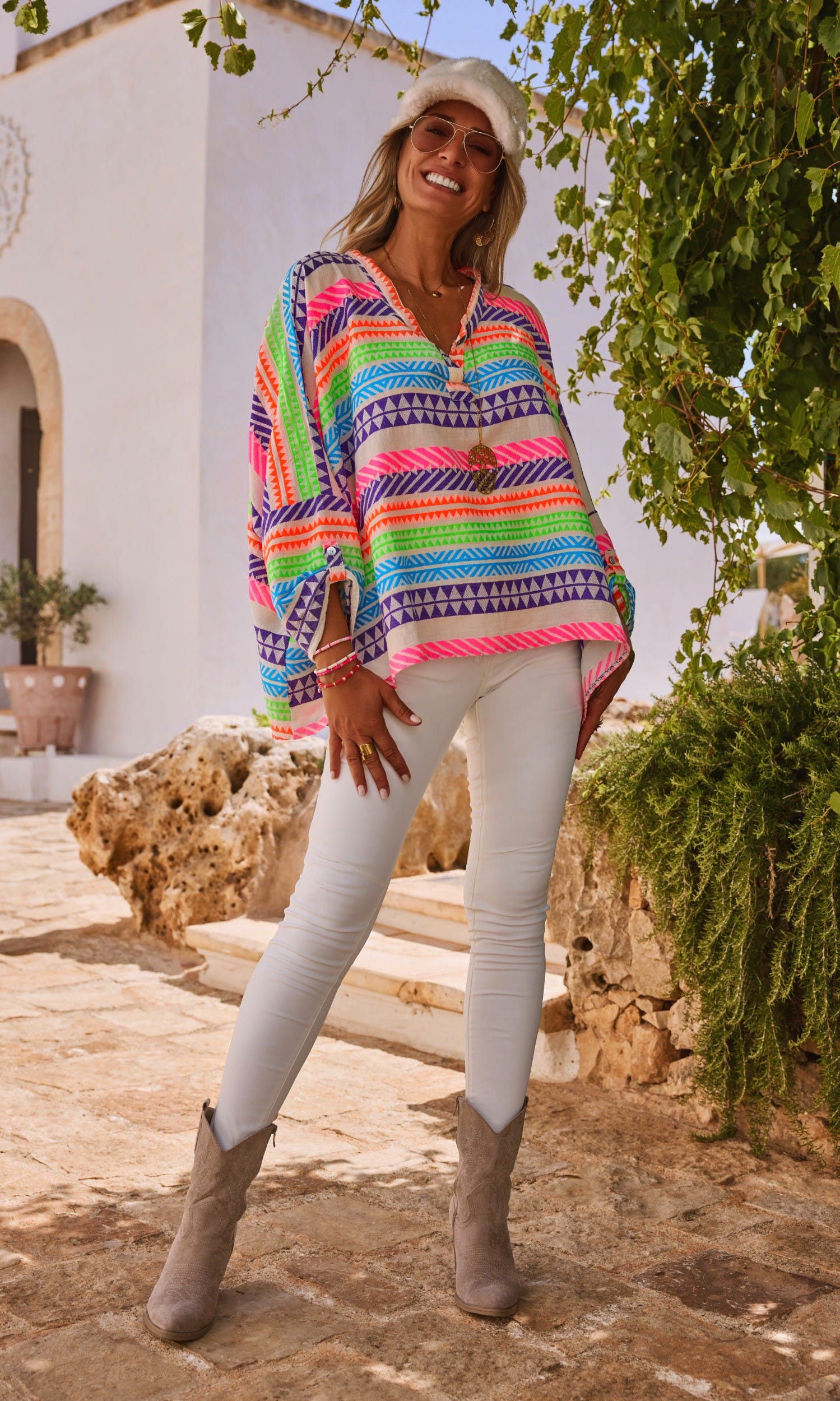 Ses manches longues avec patte de boutonnage et son motif multicolor aztek apportent une touche originale.